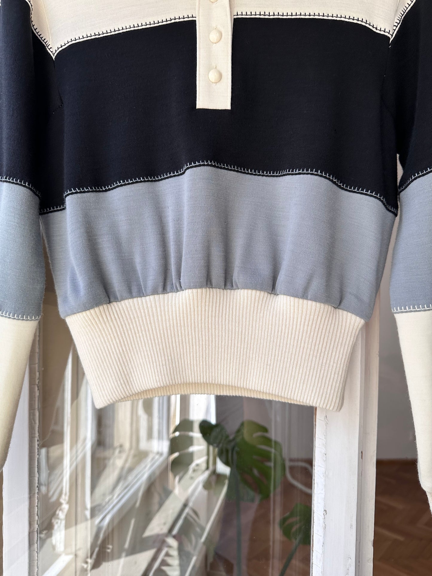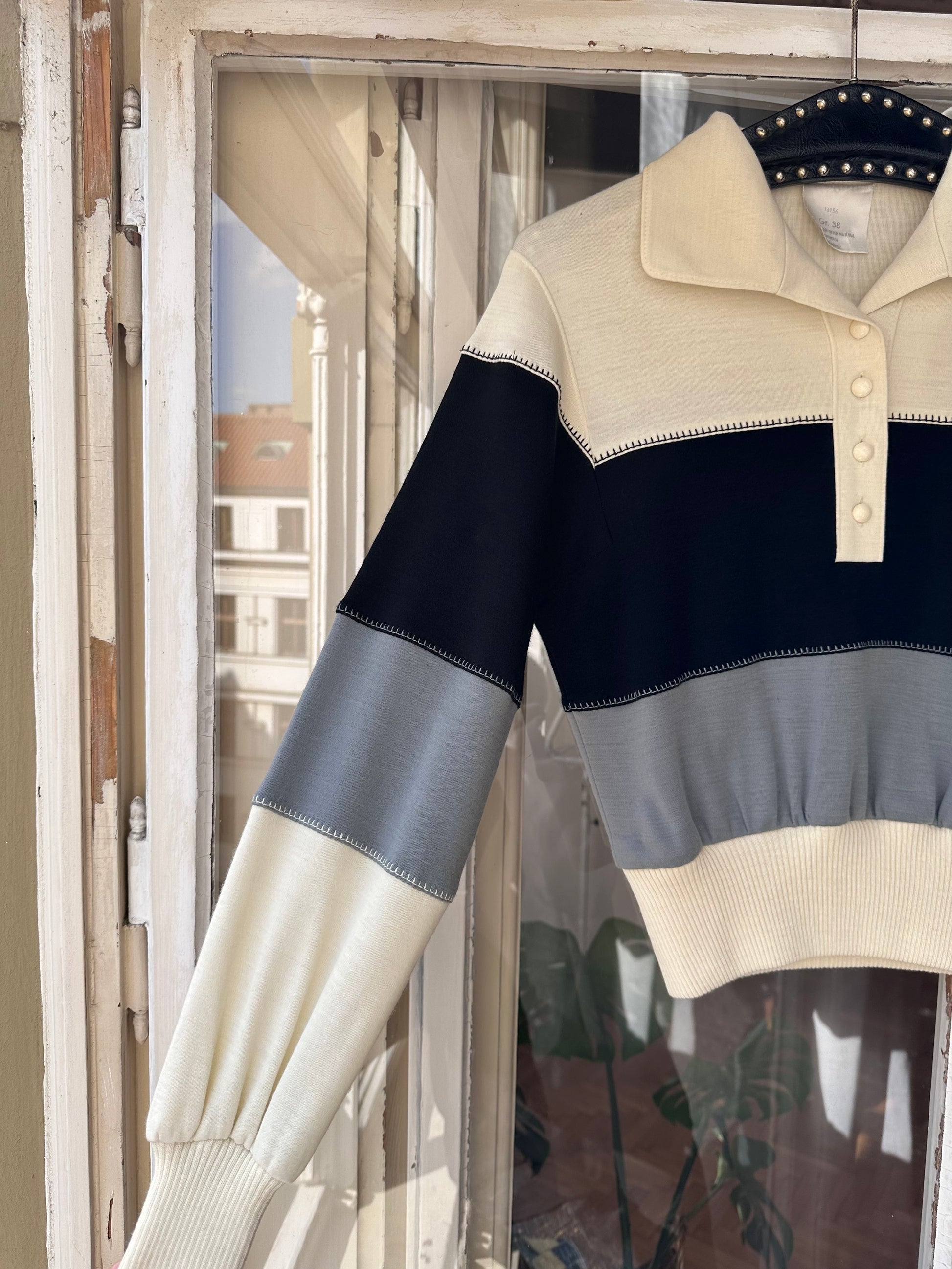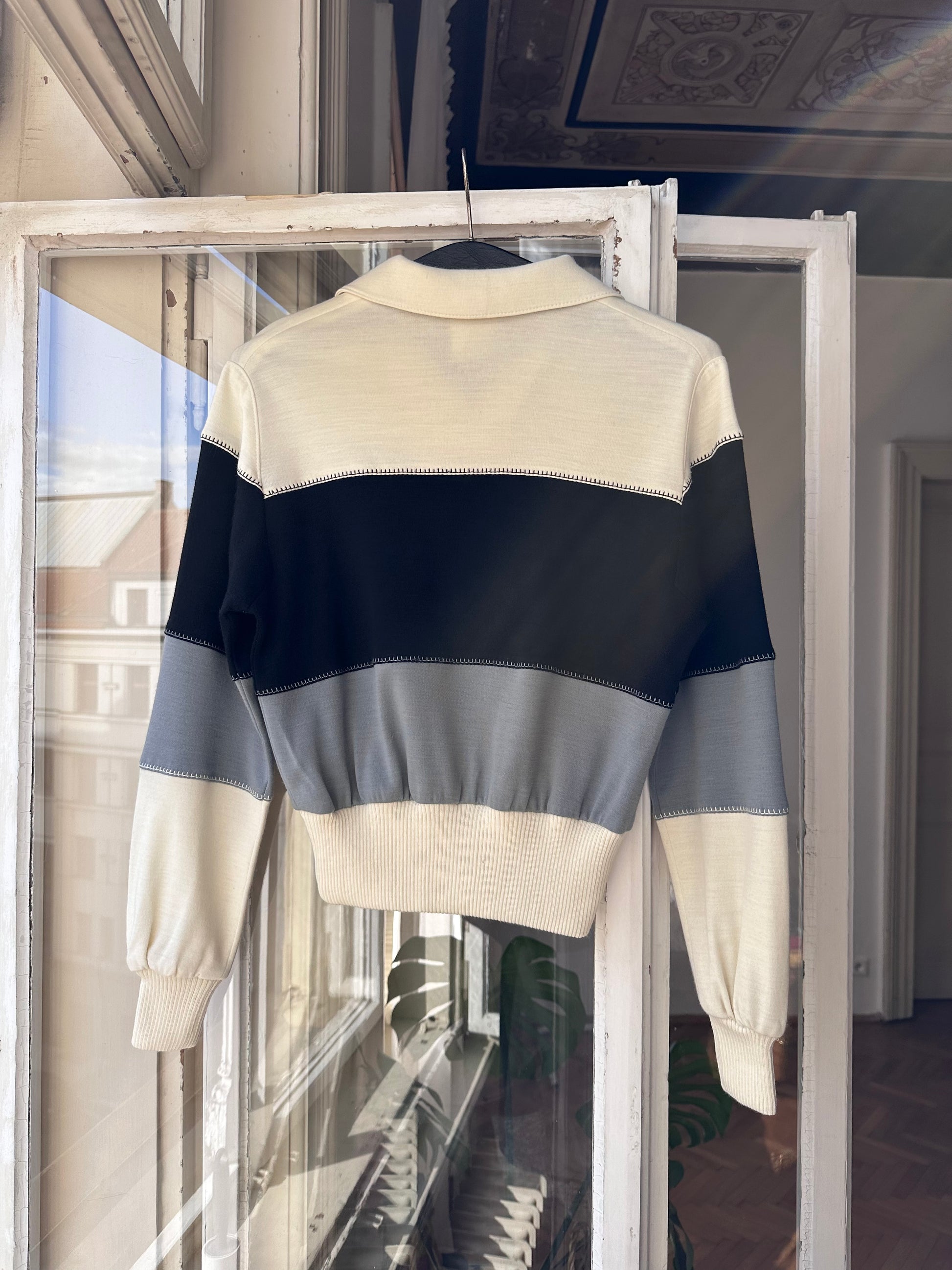 見たまんま可愛いです。モノトーンの太いボーダーと、清楚な襟付きプルオーバー。