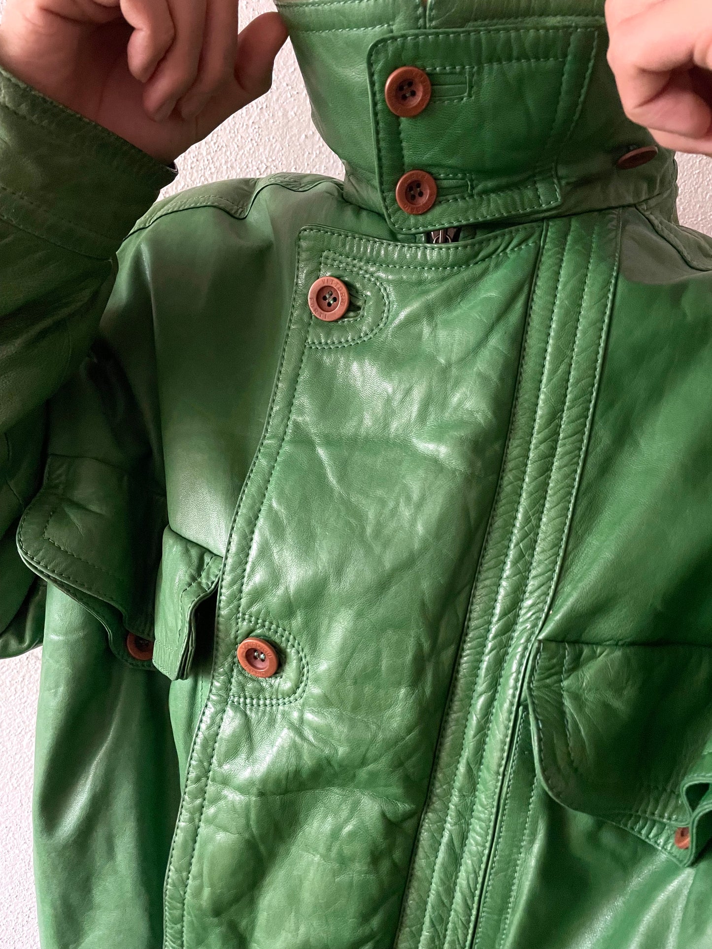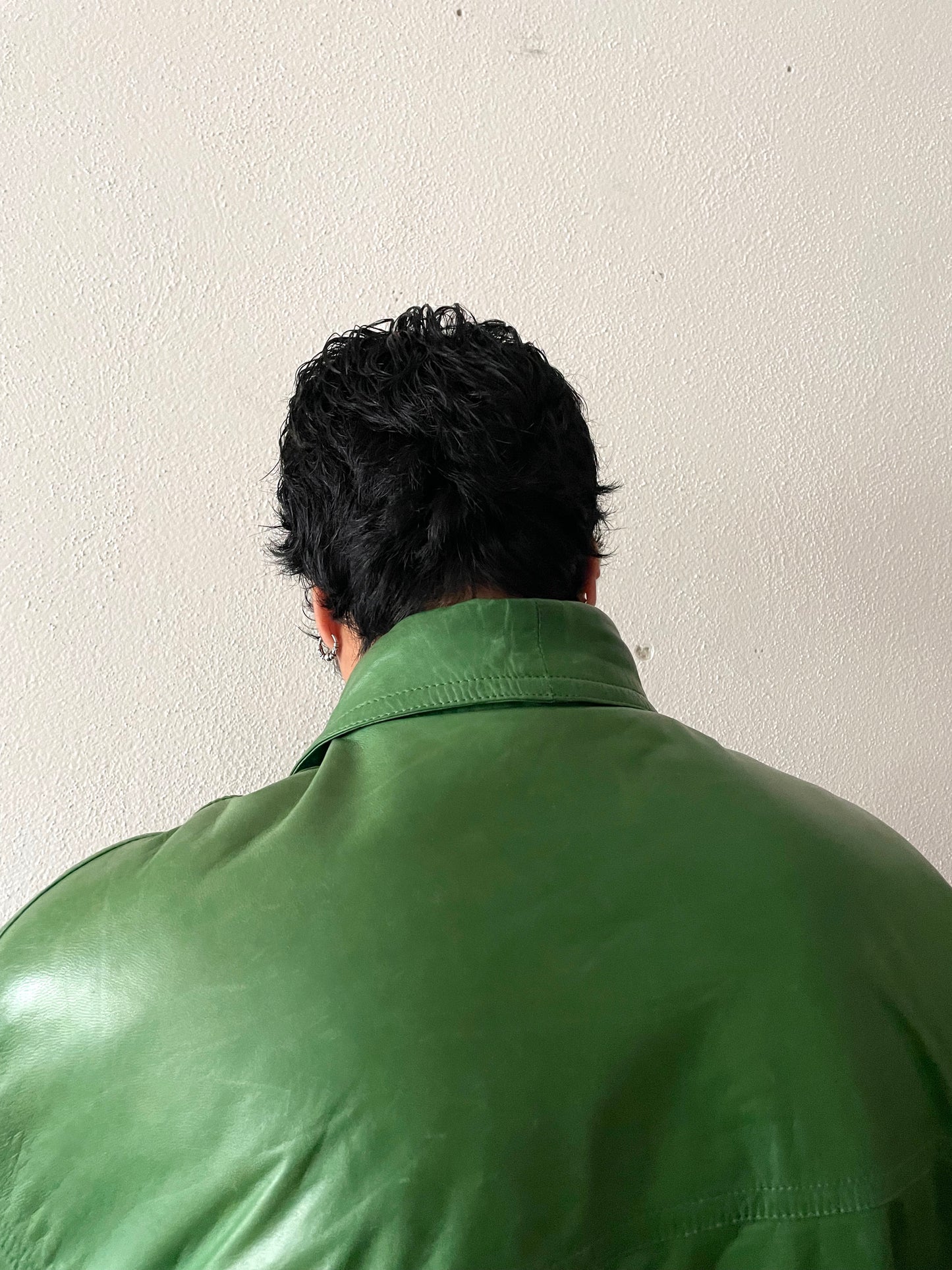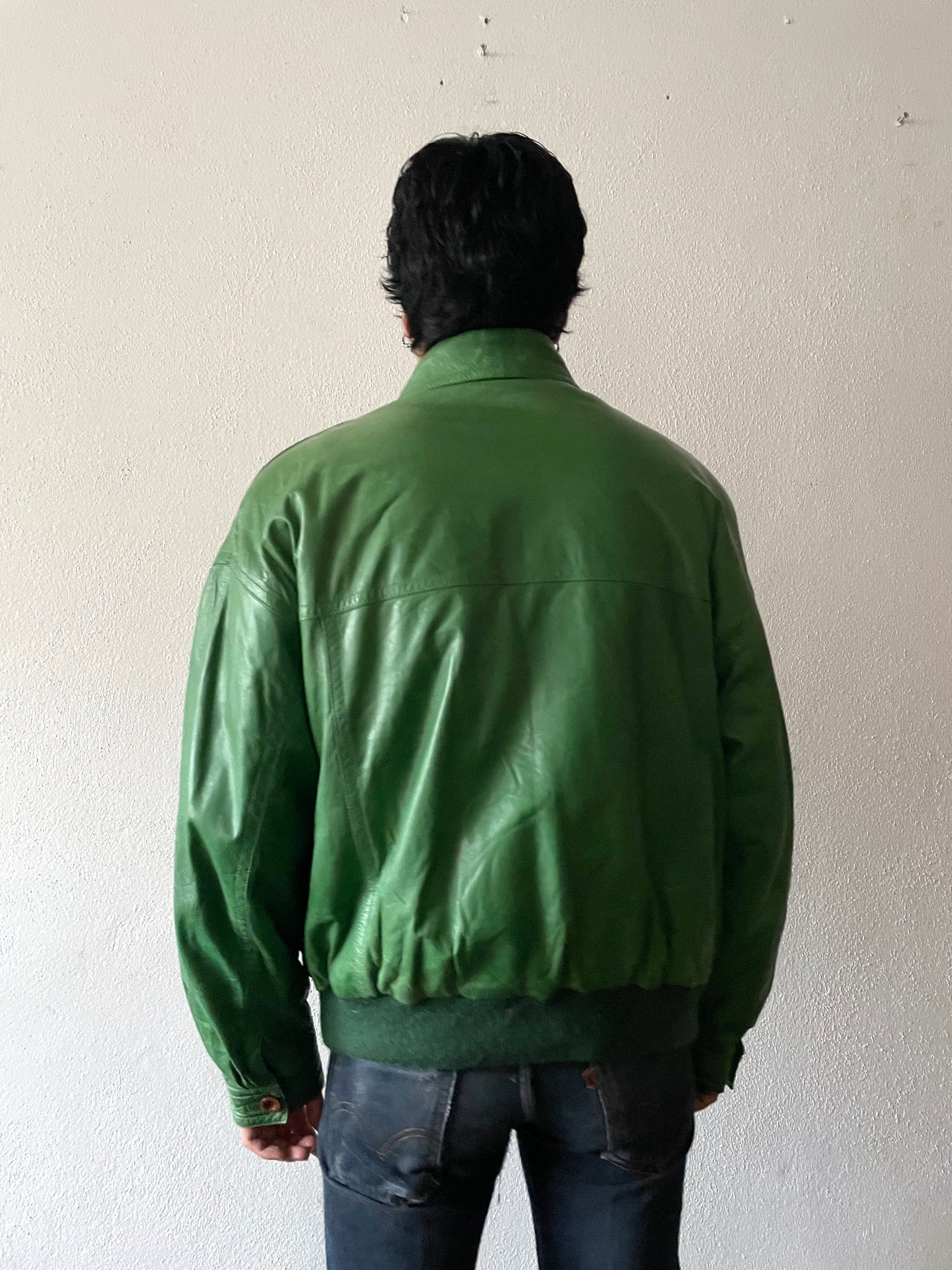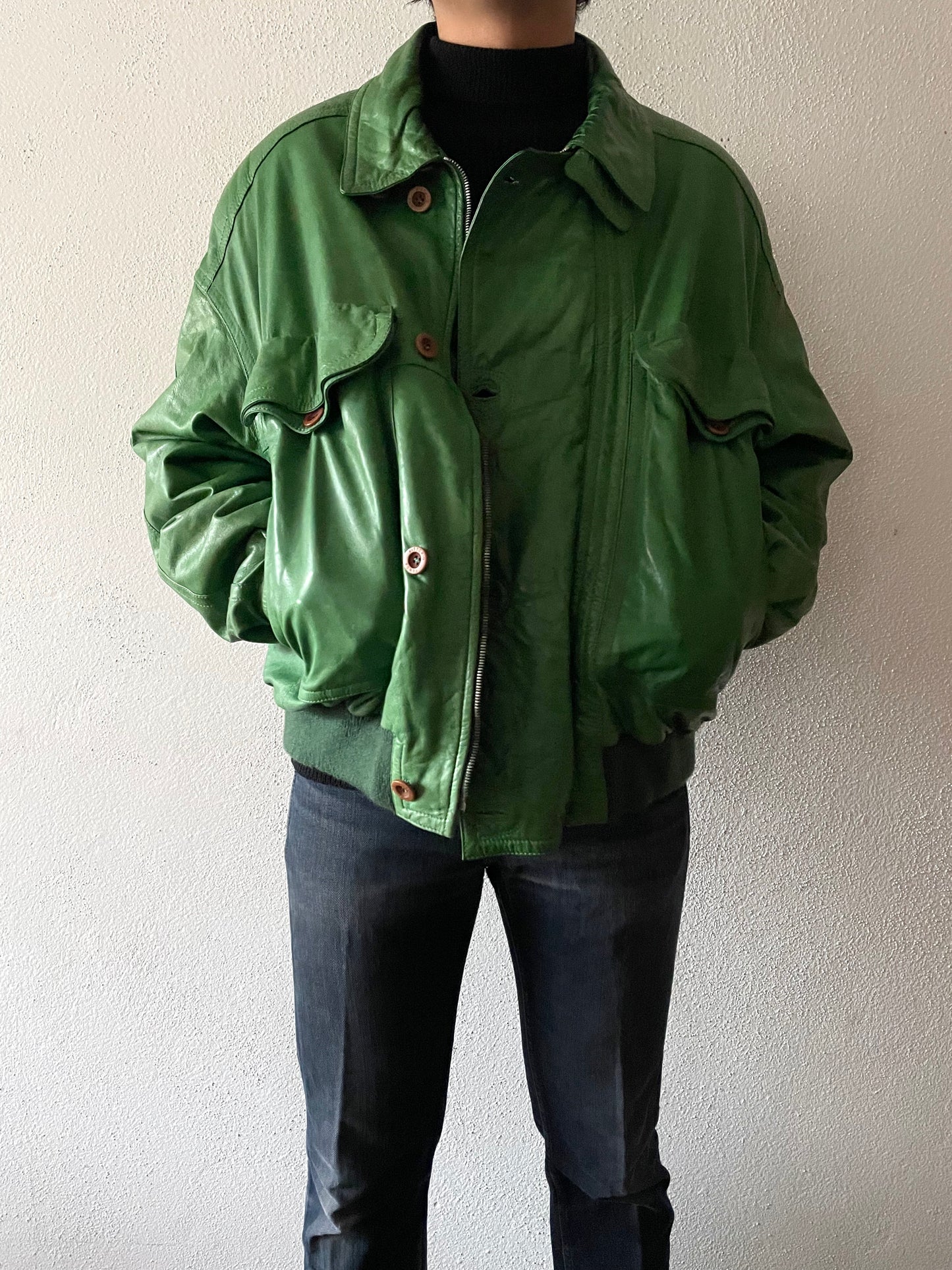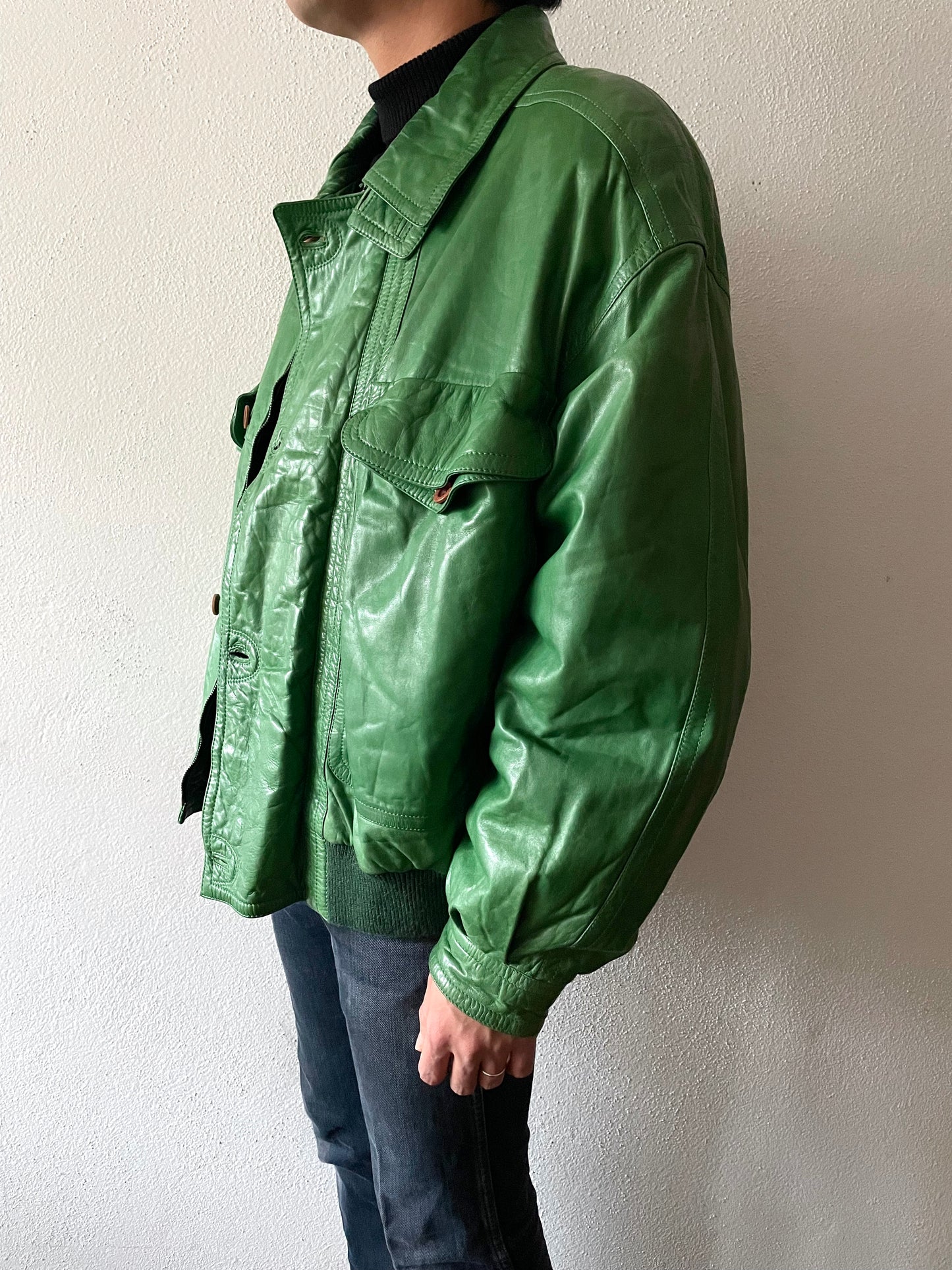 イグアナグリーン。素晴らしい色味のレザーボンバージャケット。
