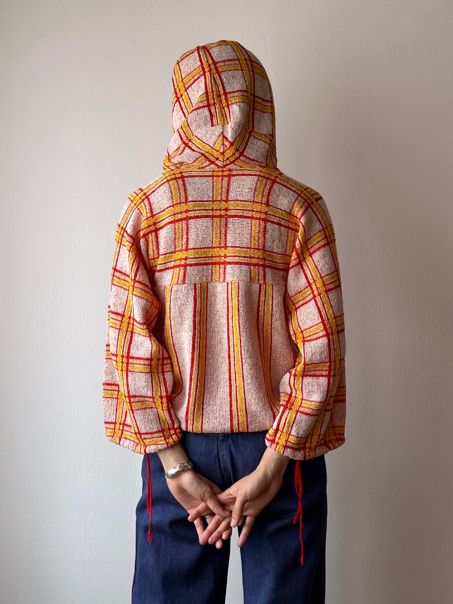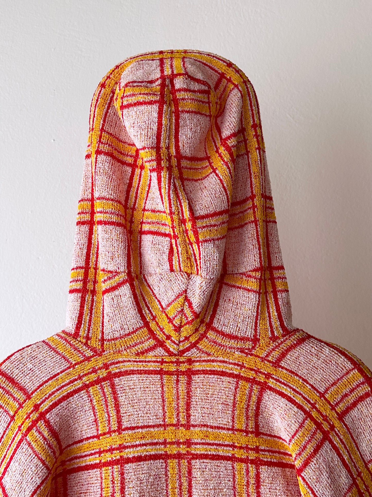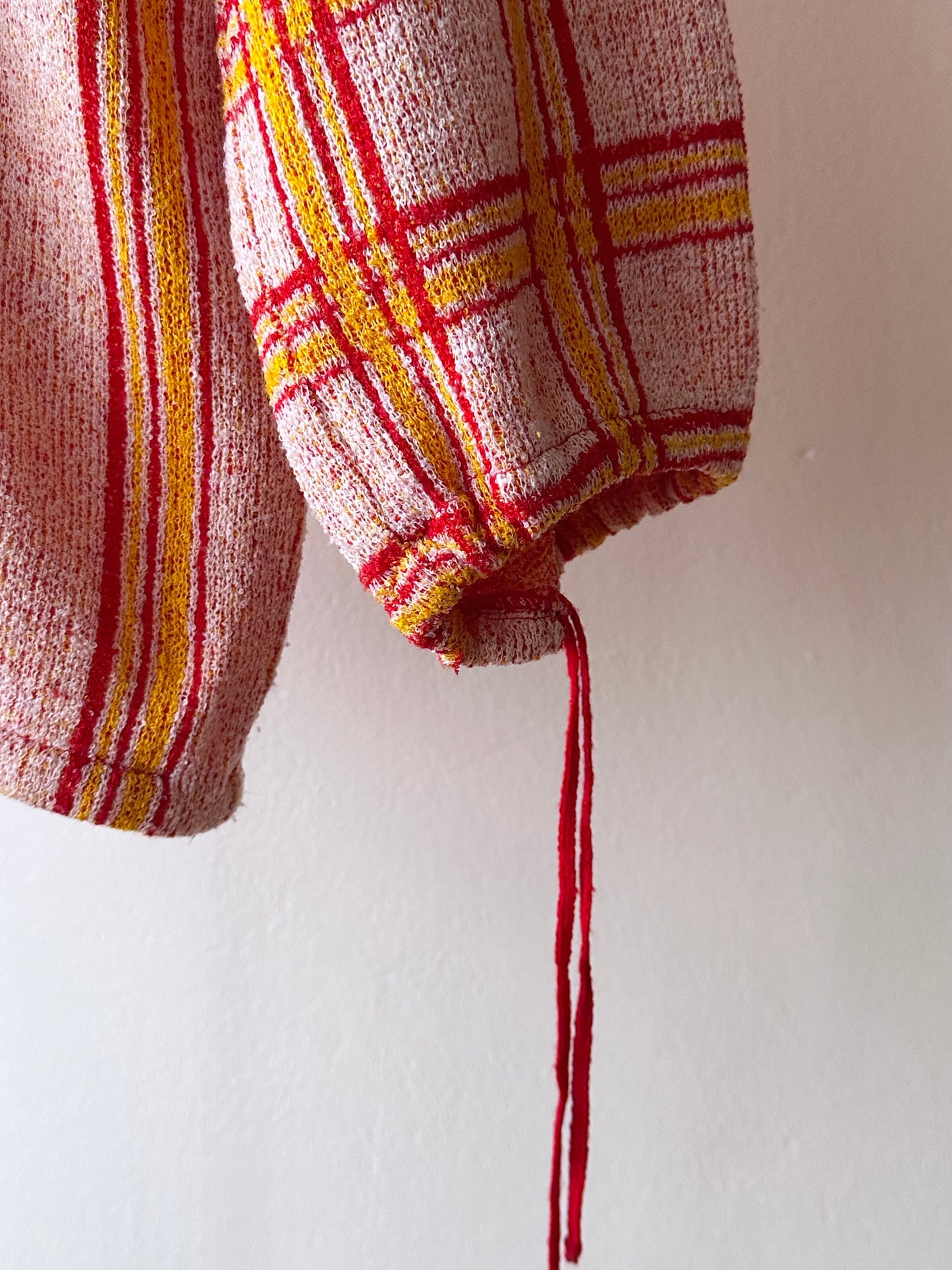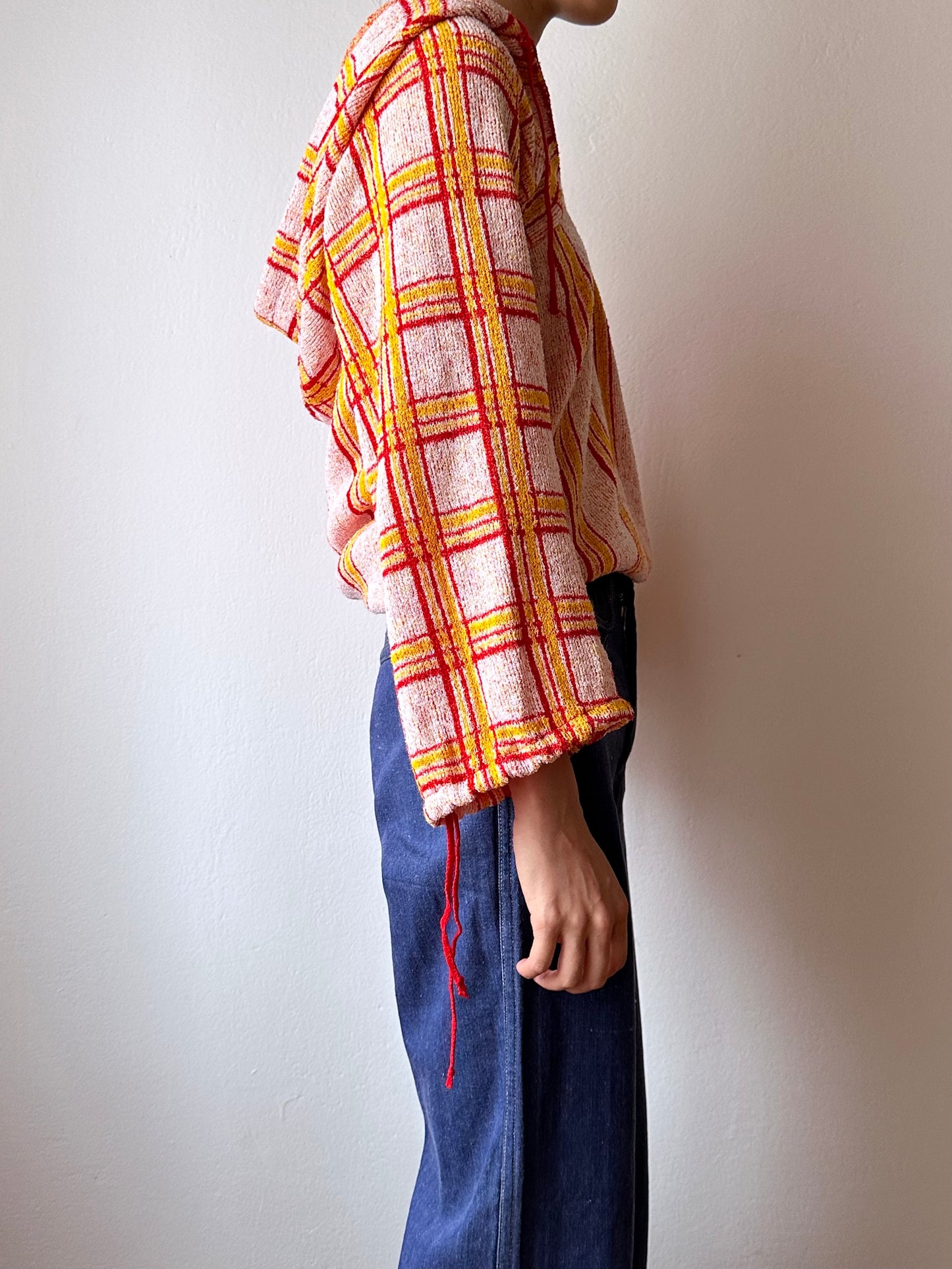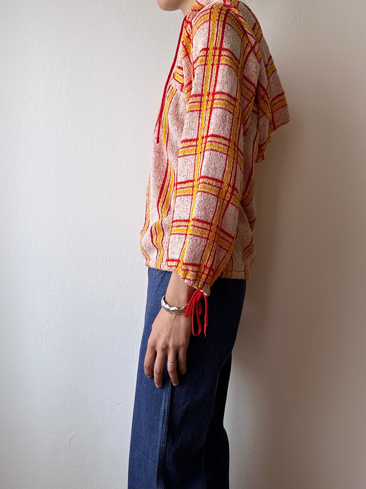 白をベースとした、黄色と赤のチェックのパイル生地、