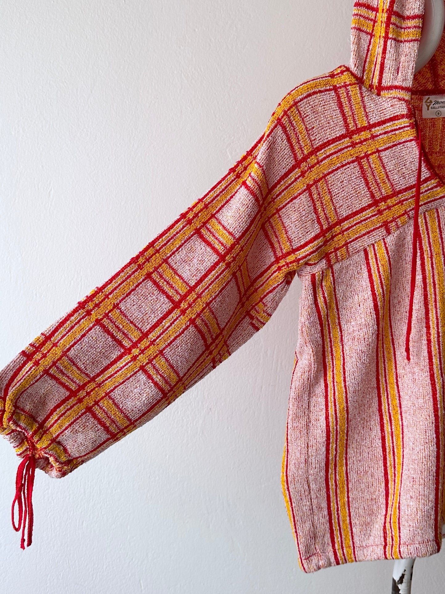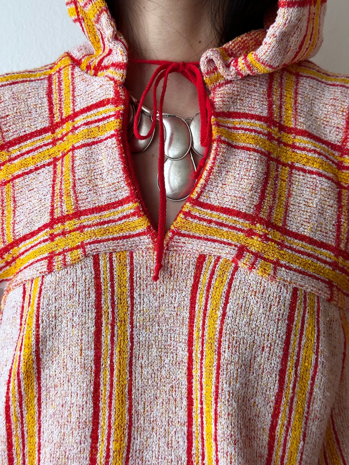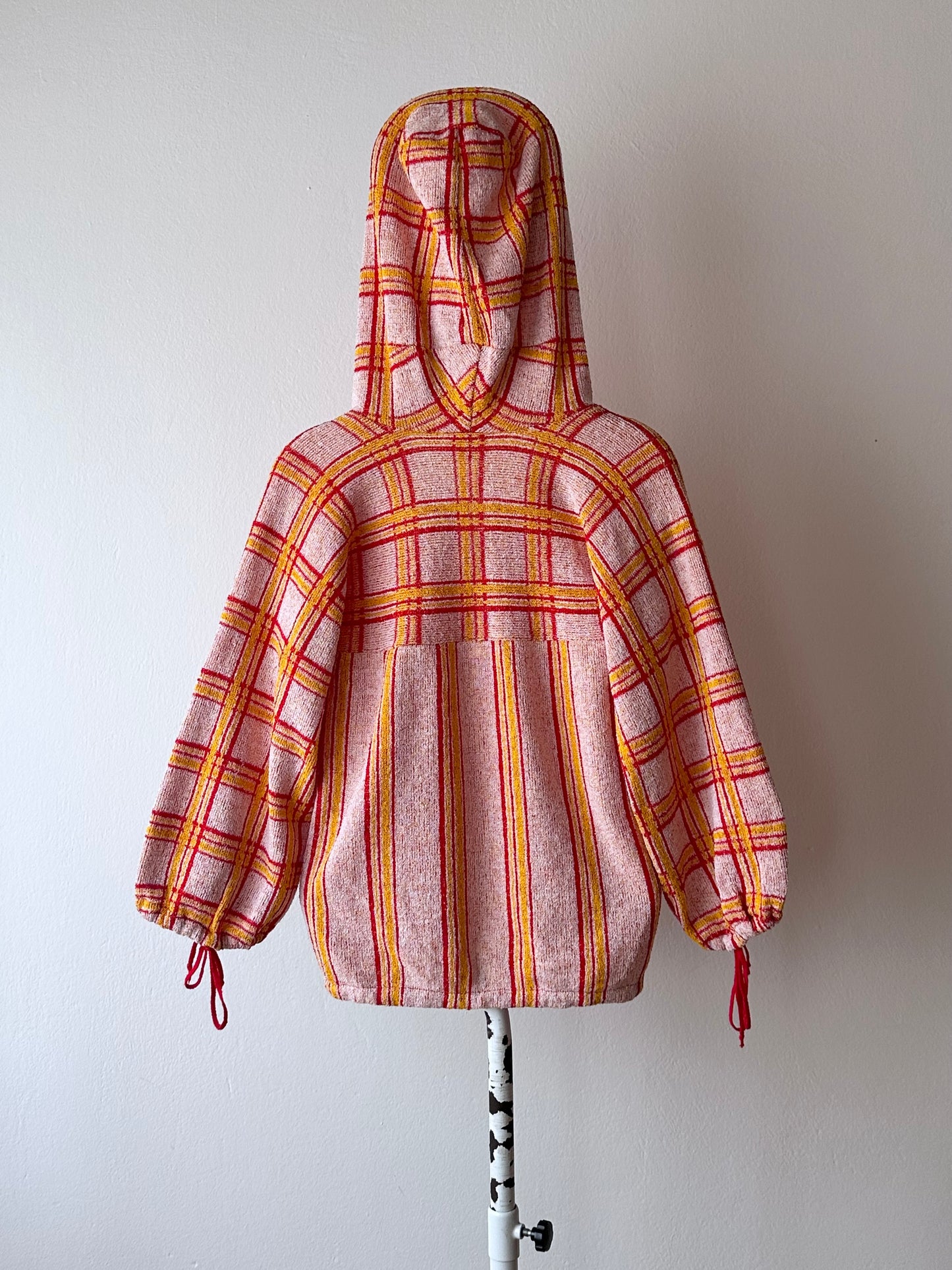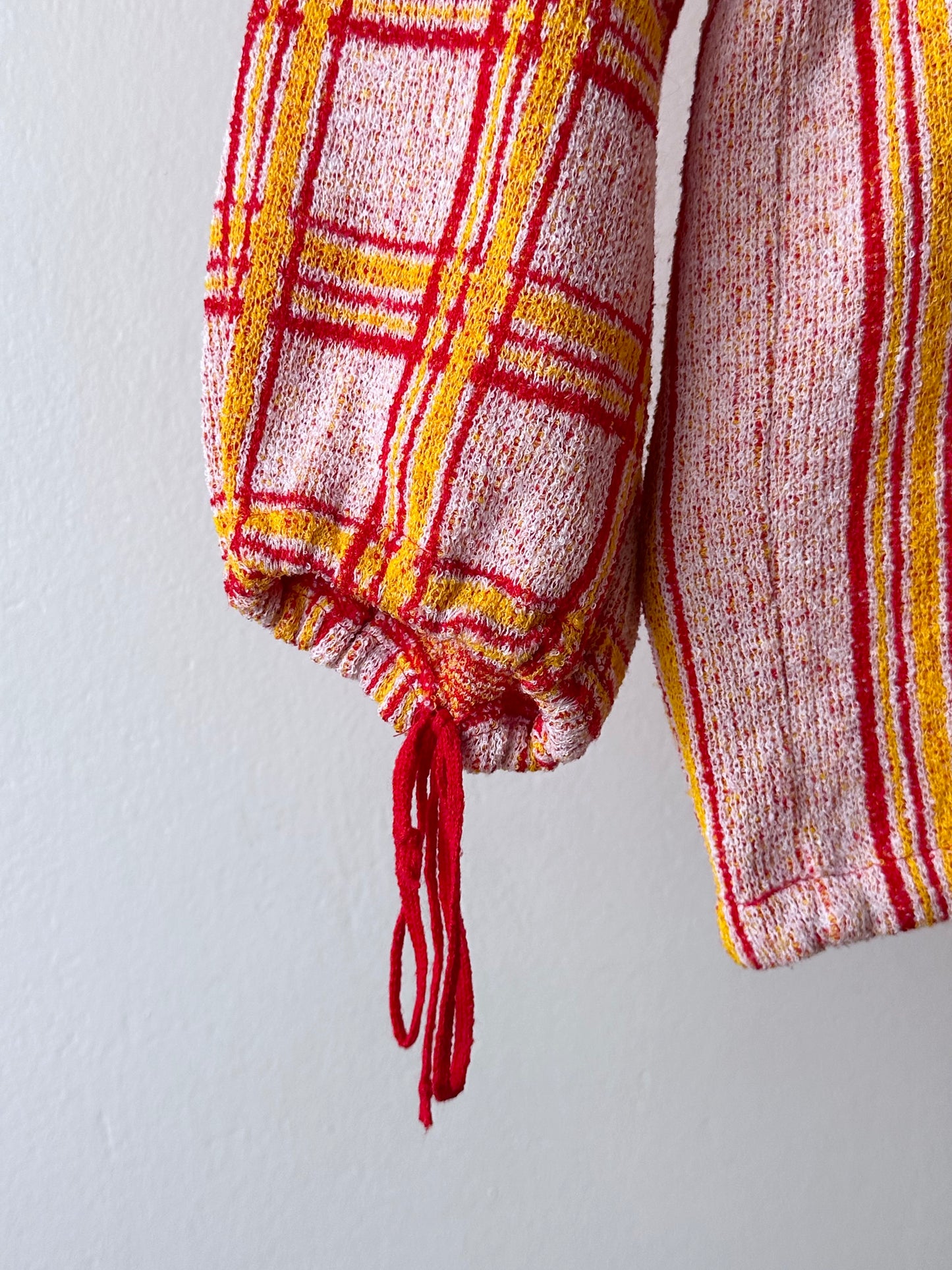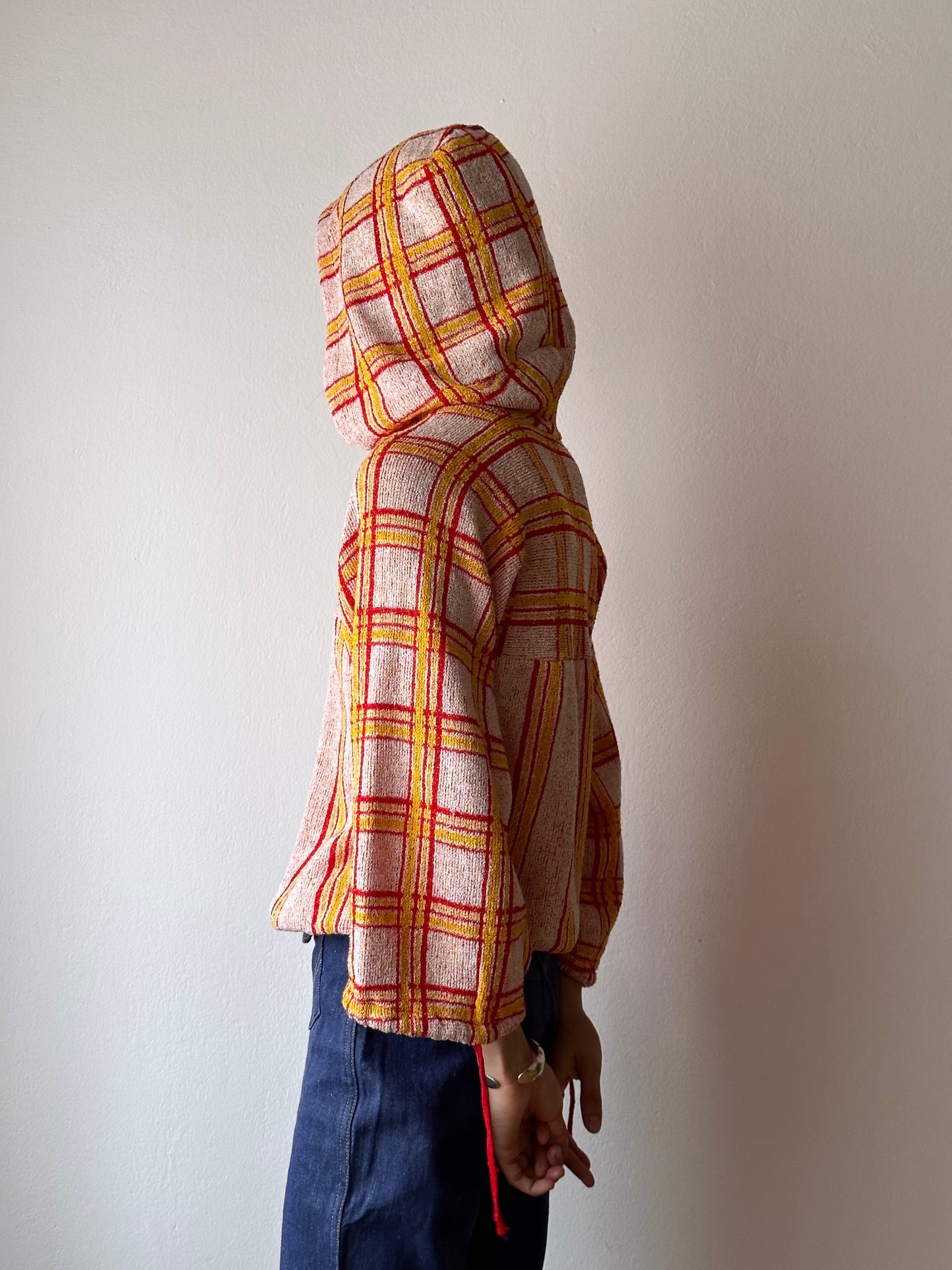 白をベースとした、黄色と赤のチェックのパイル生地、