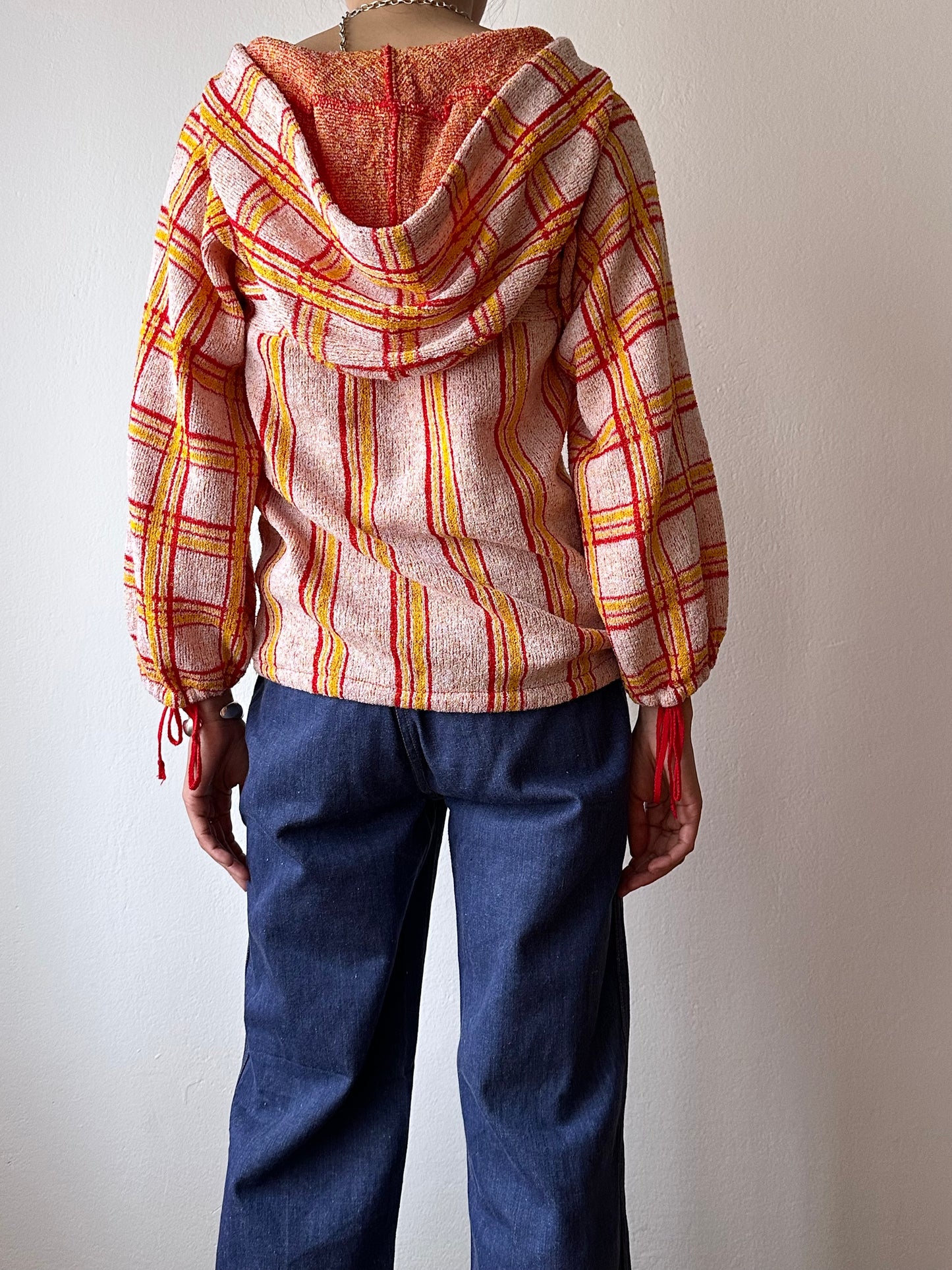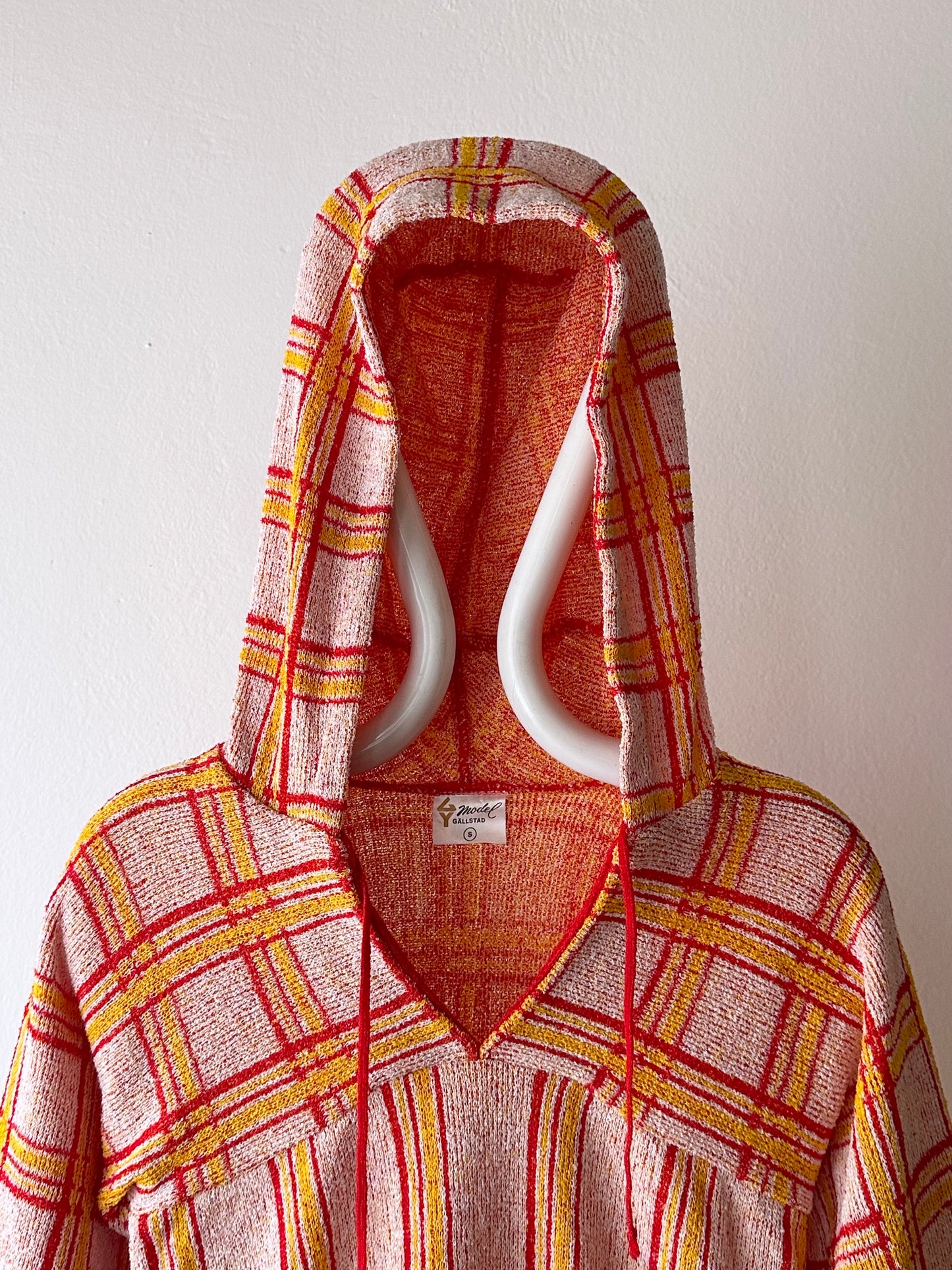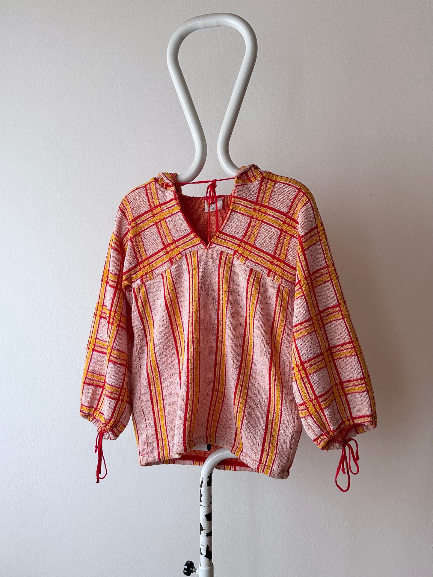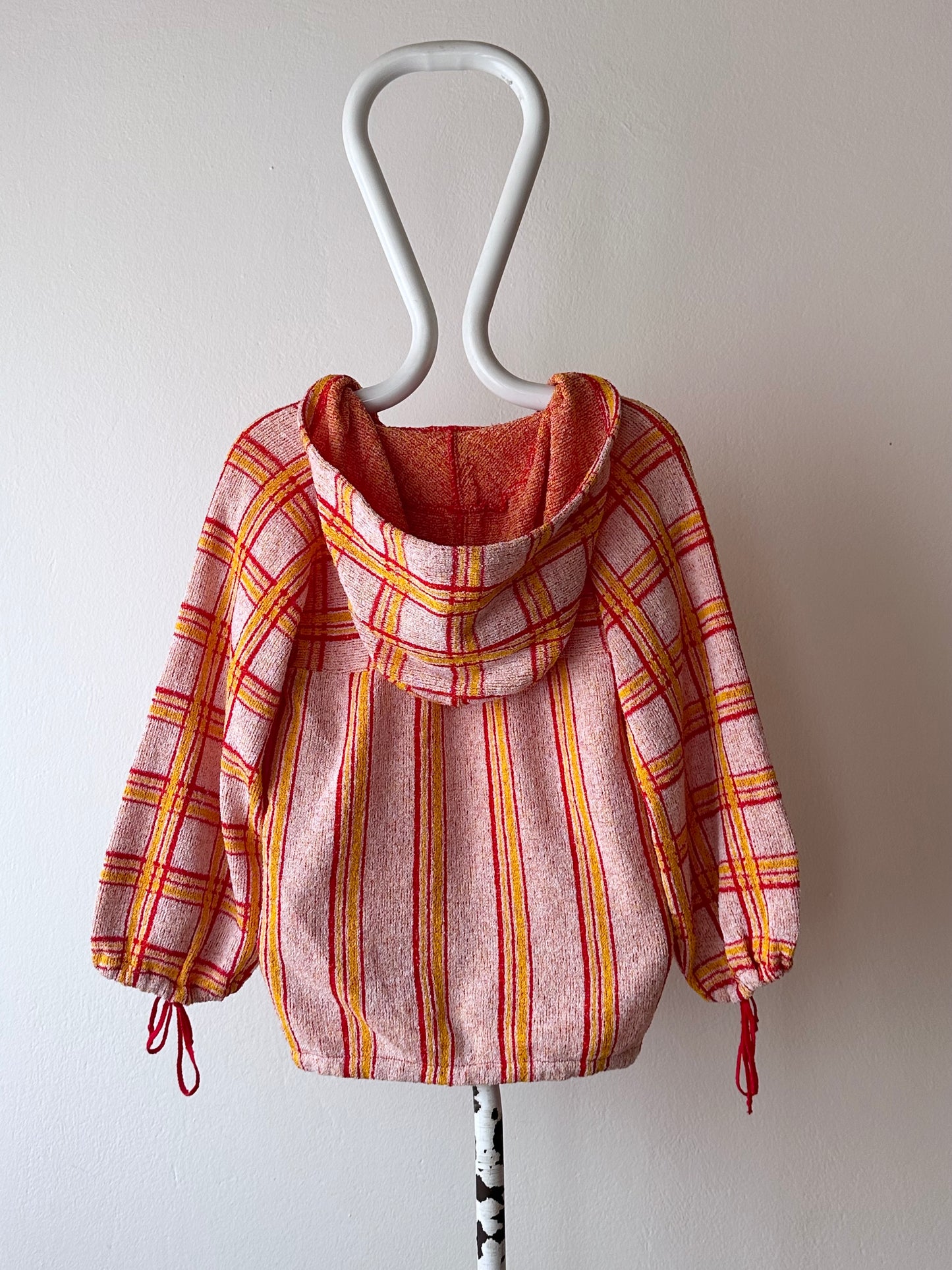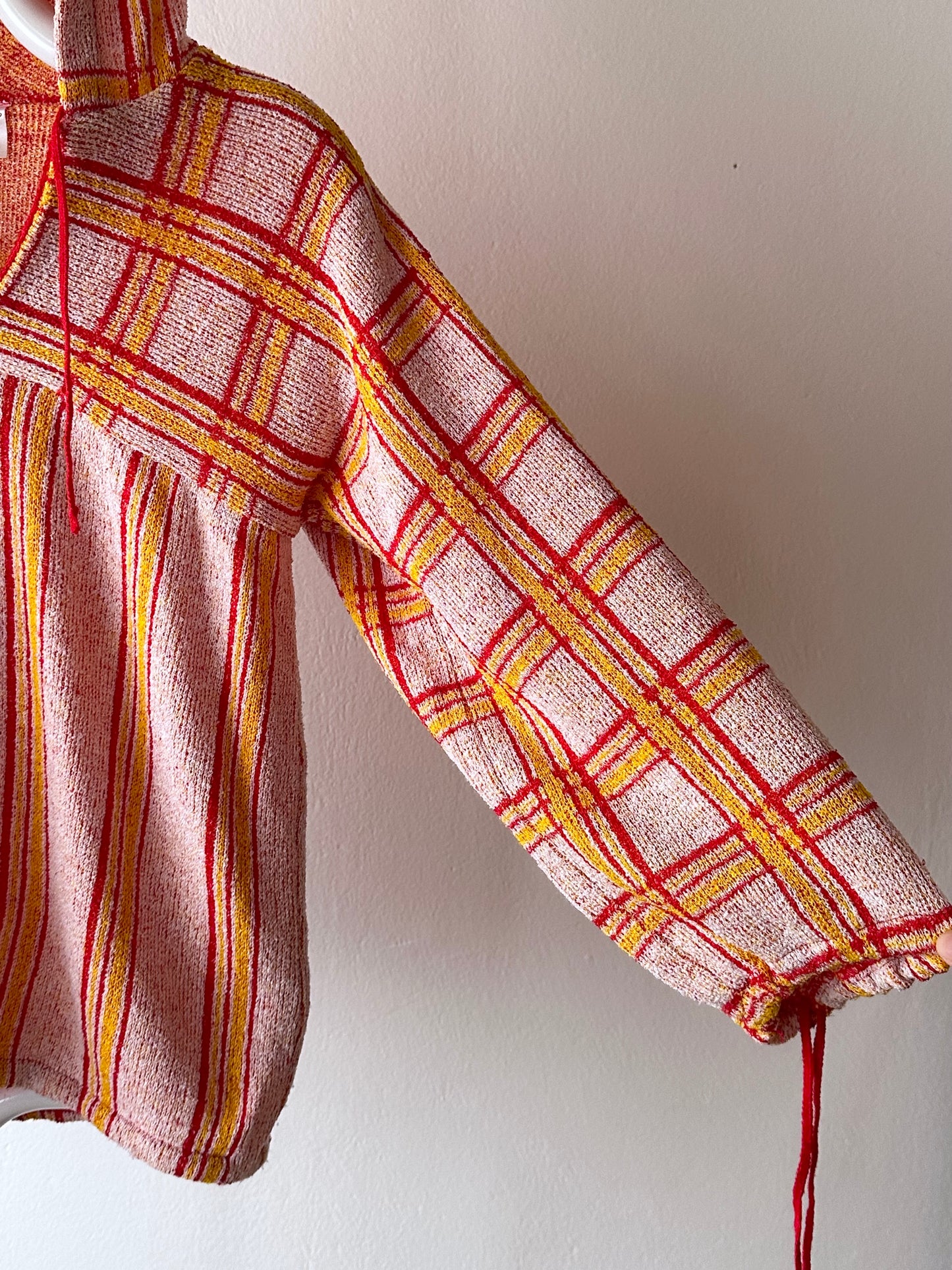 白をベースとした、黄色と赤のチェックのパイル生地、