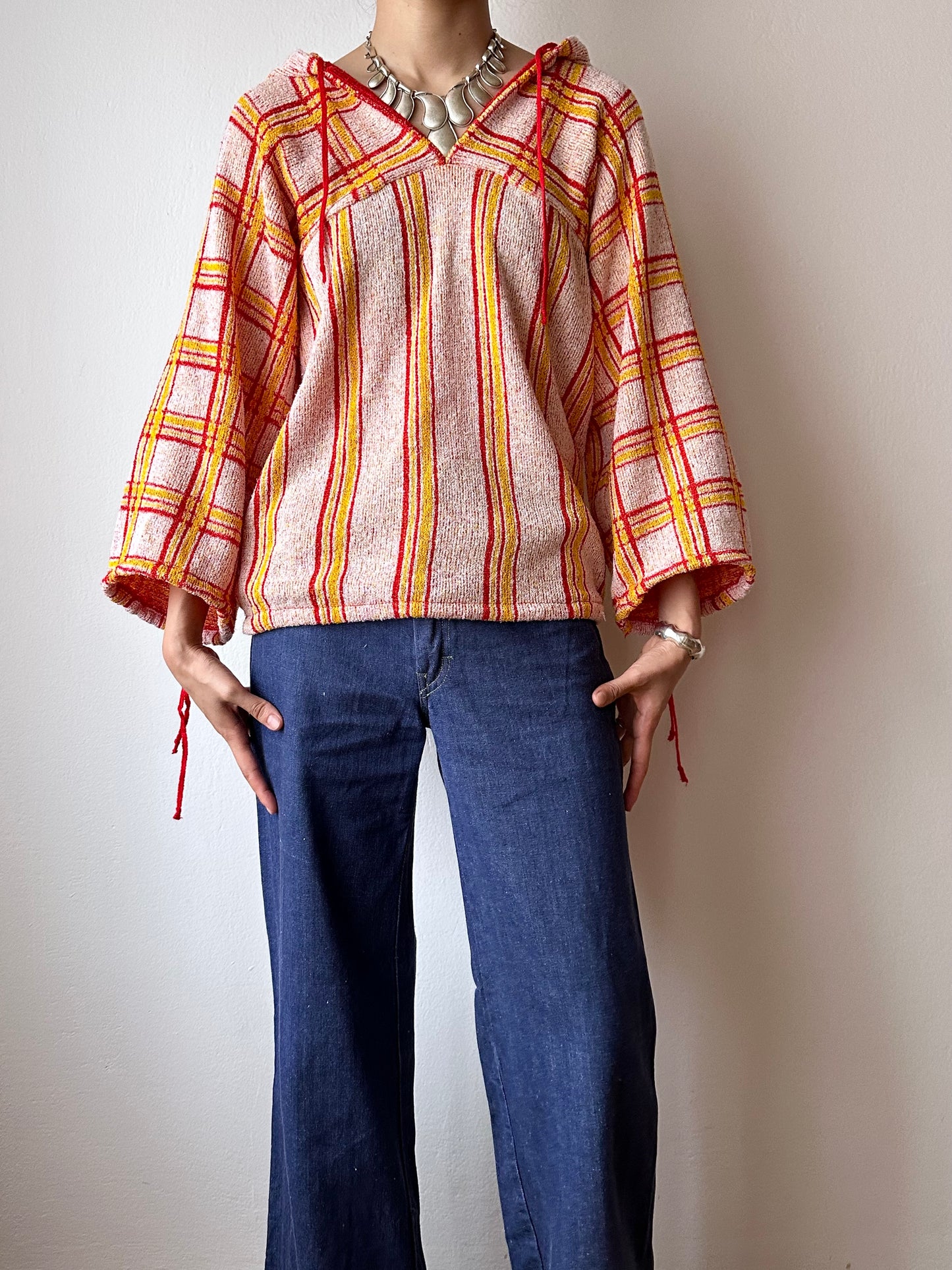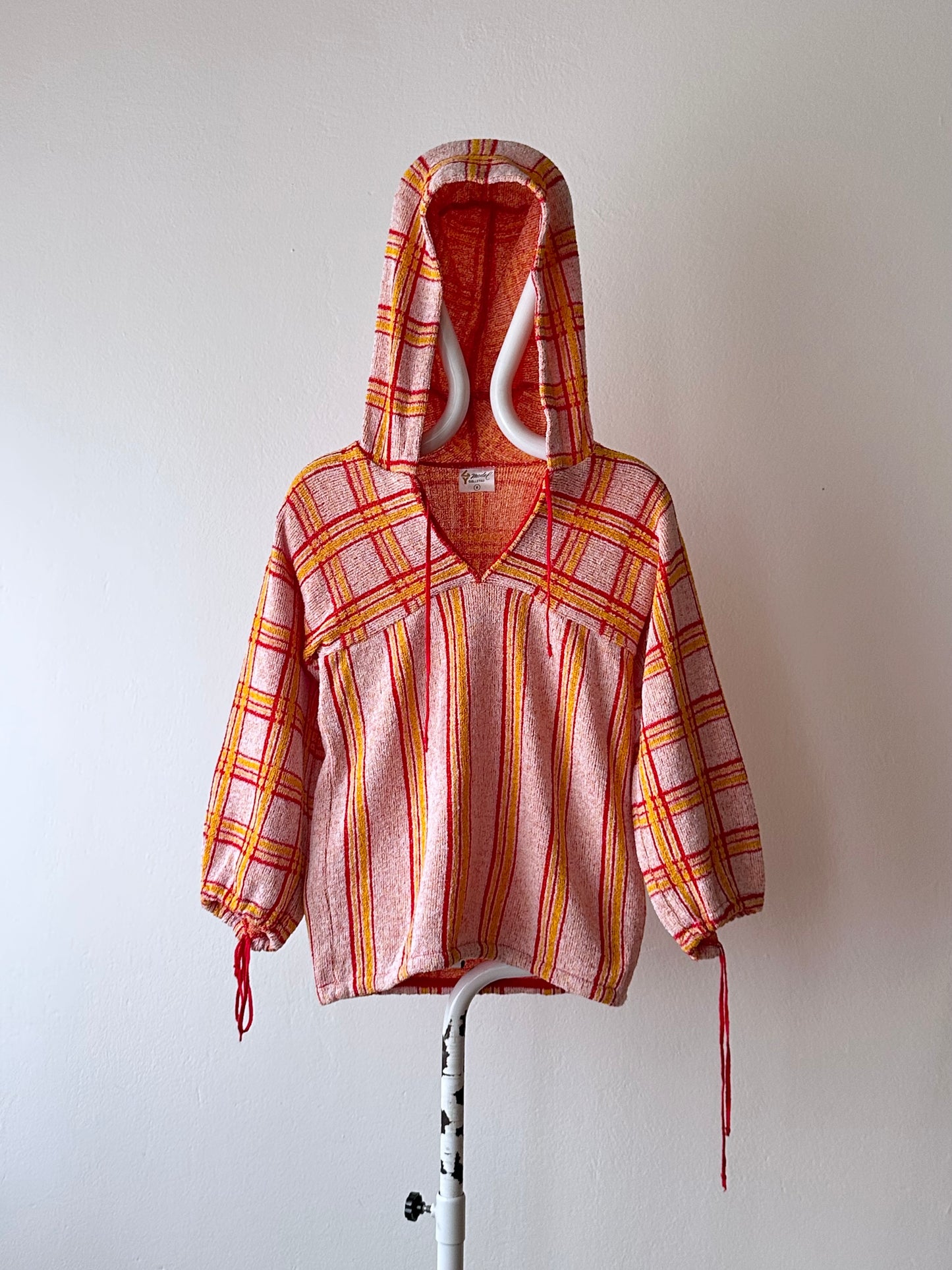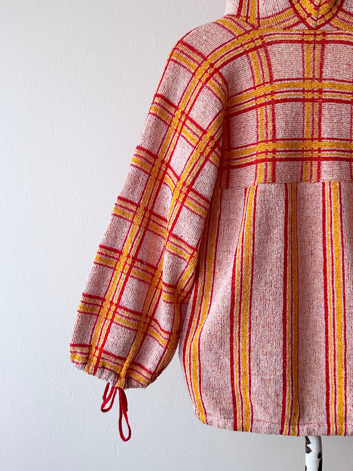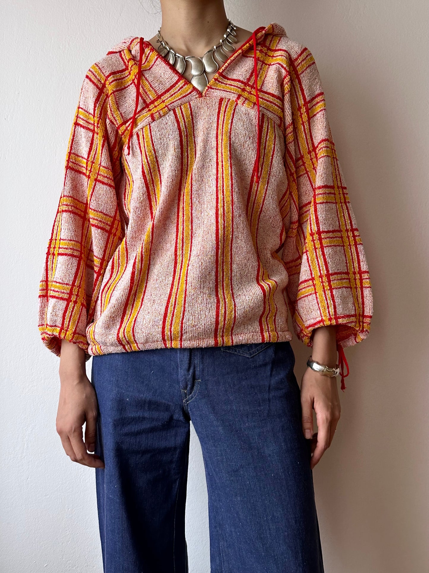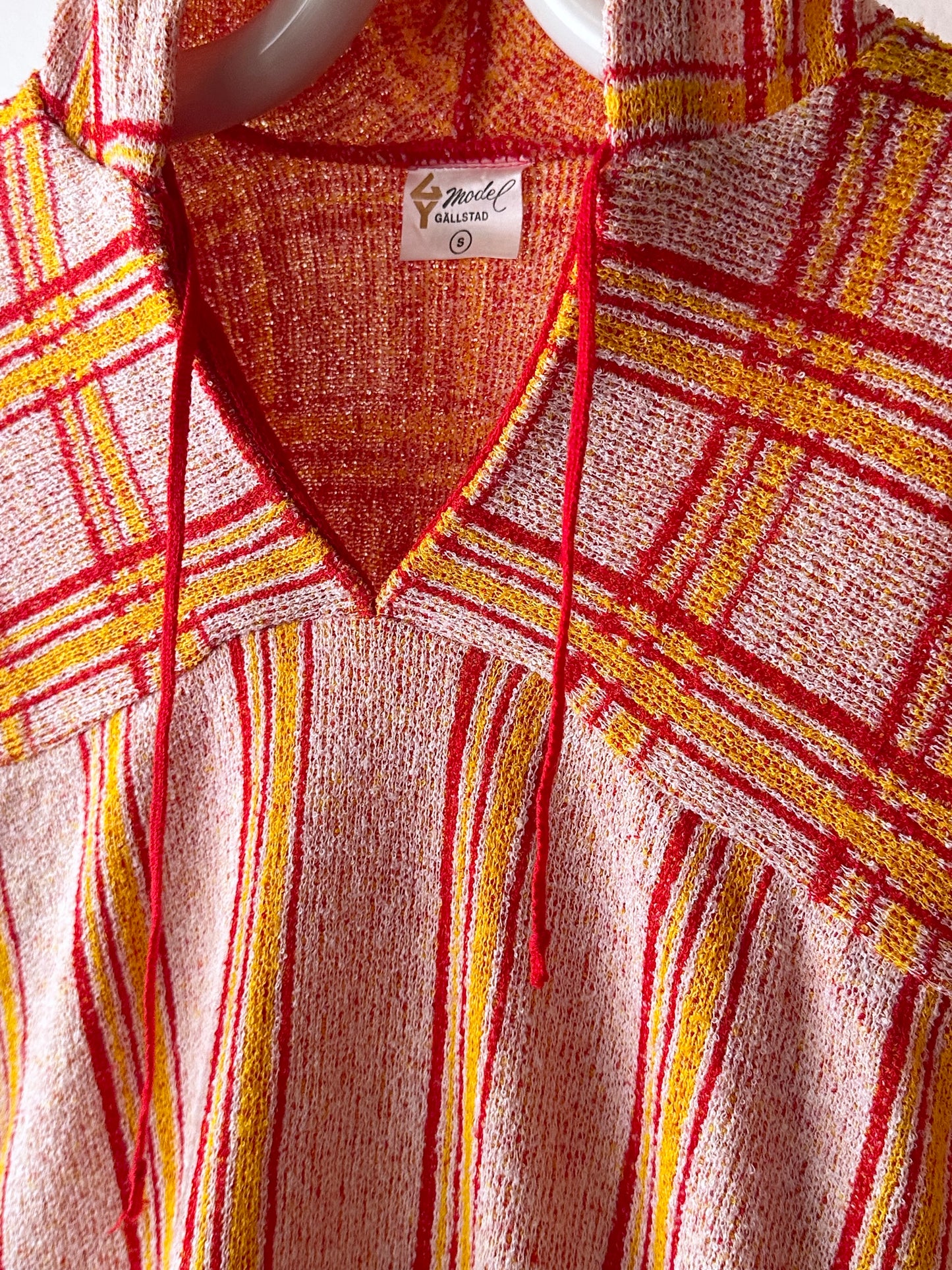 白をベースとした、黄色と赤のチェックのパイル生地、