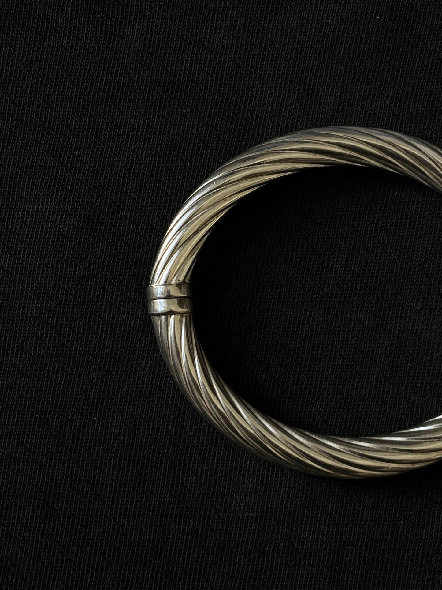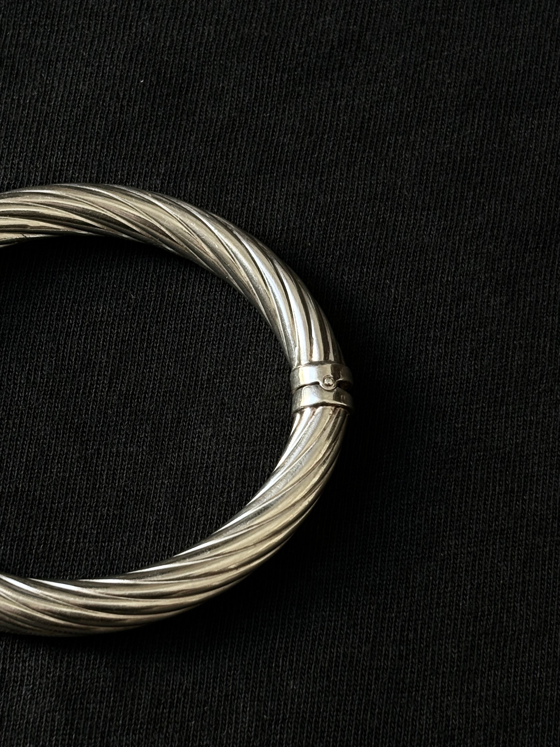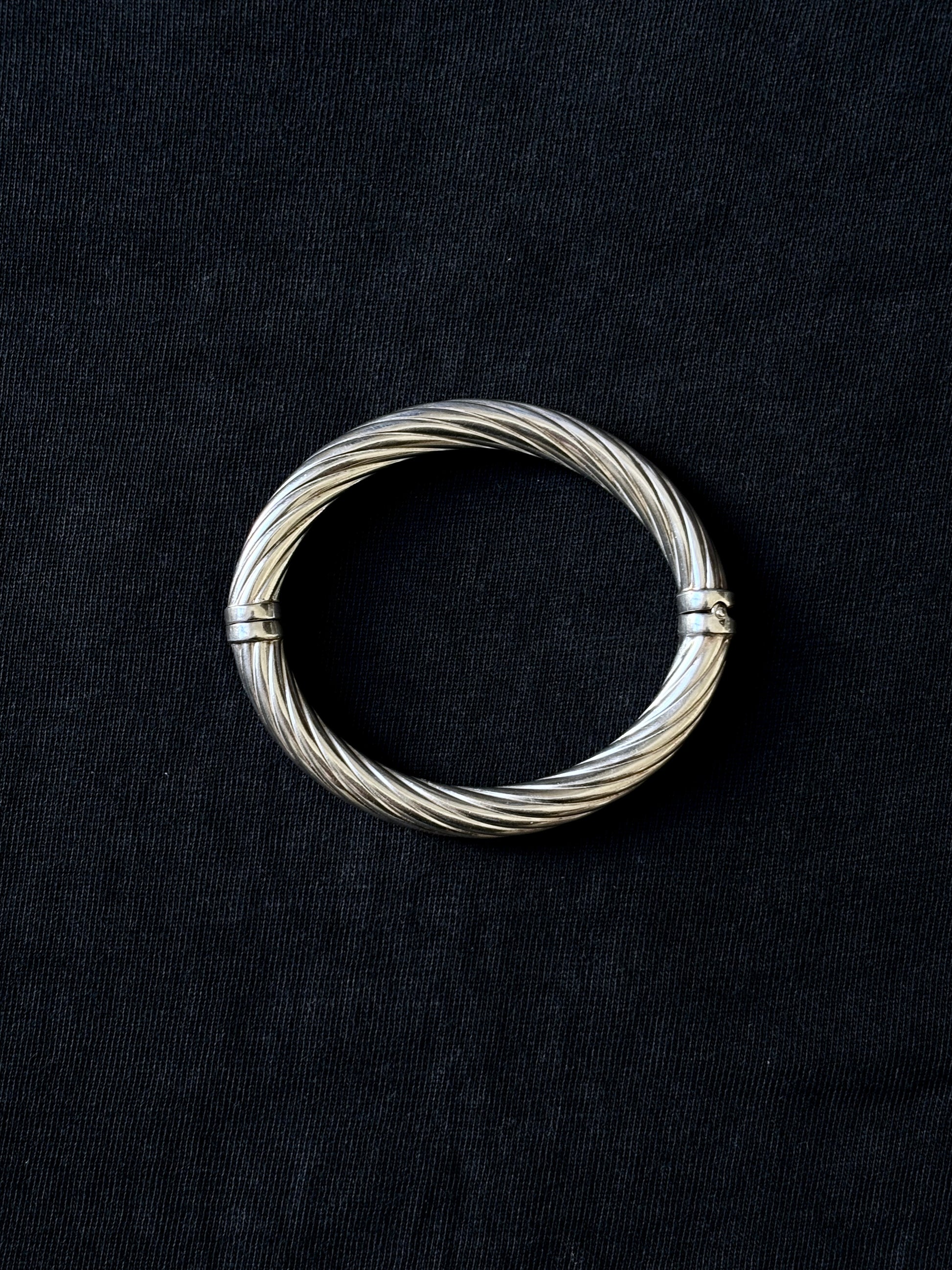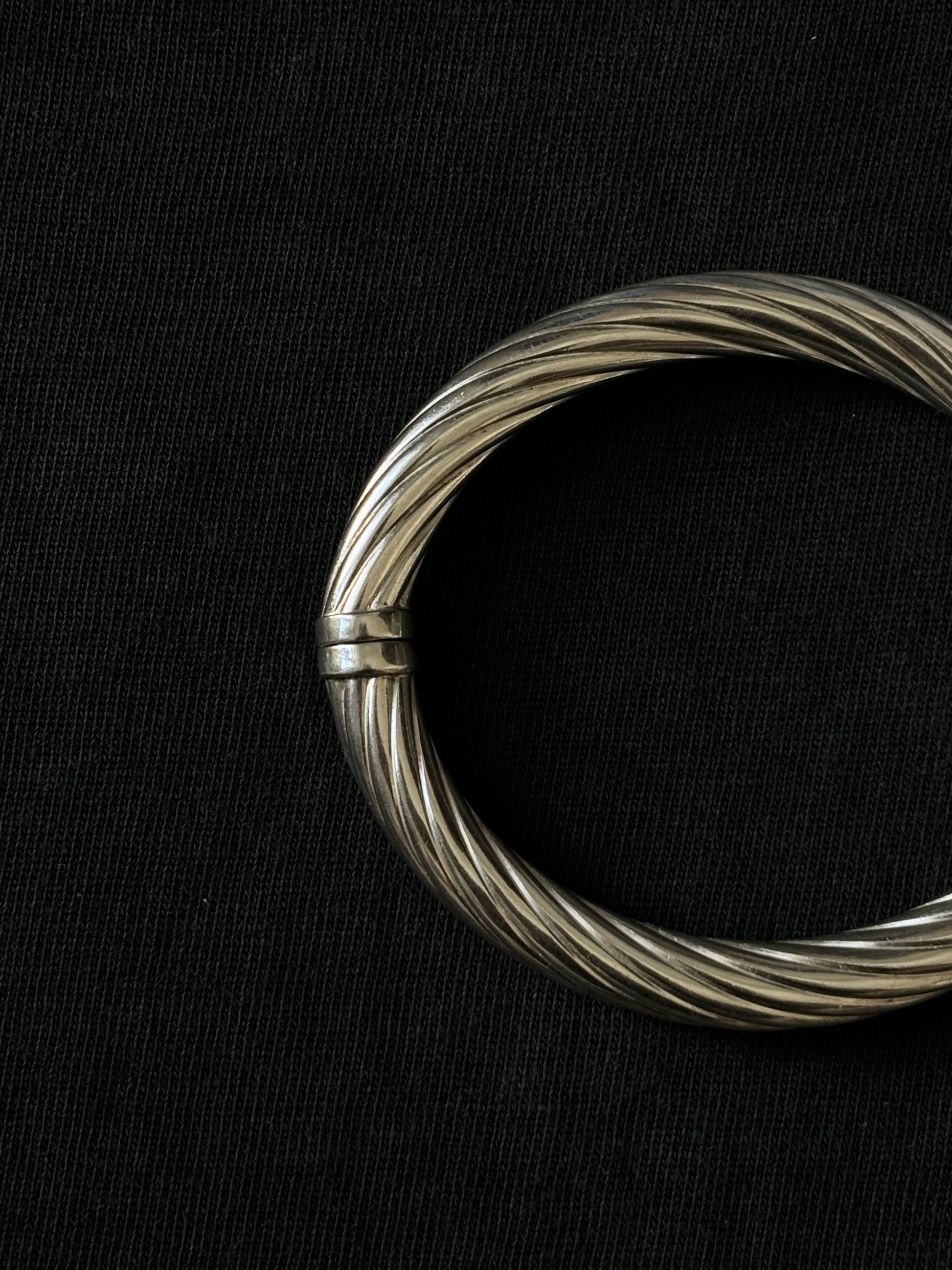 木の木目のような、自然で緩やかなねじれが美しいシルバーバングル。