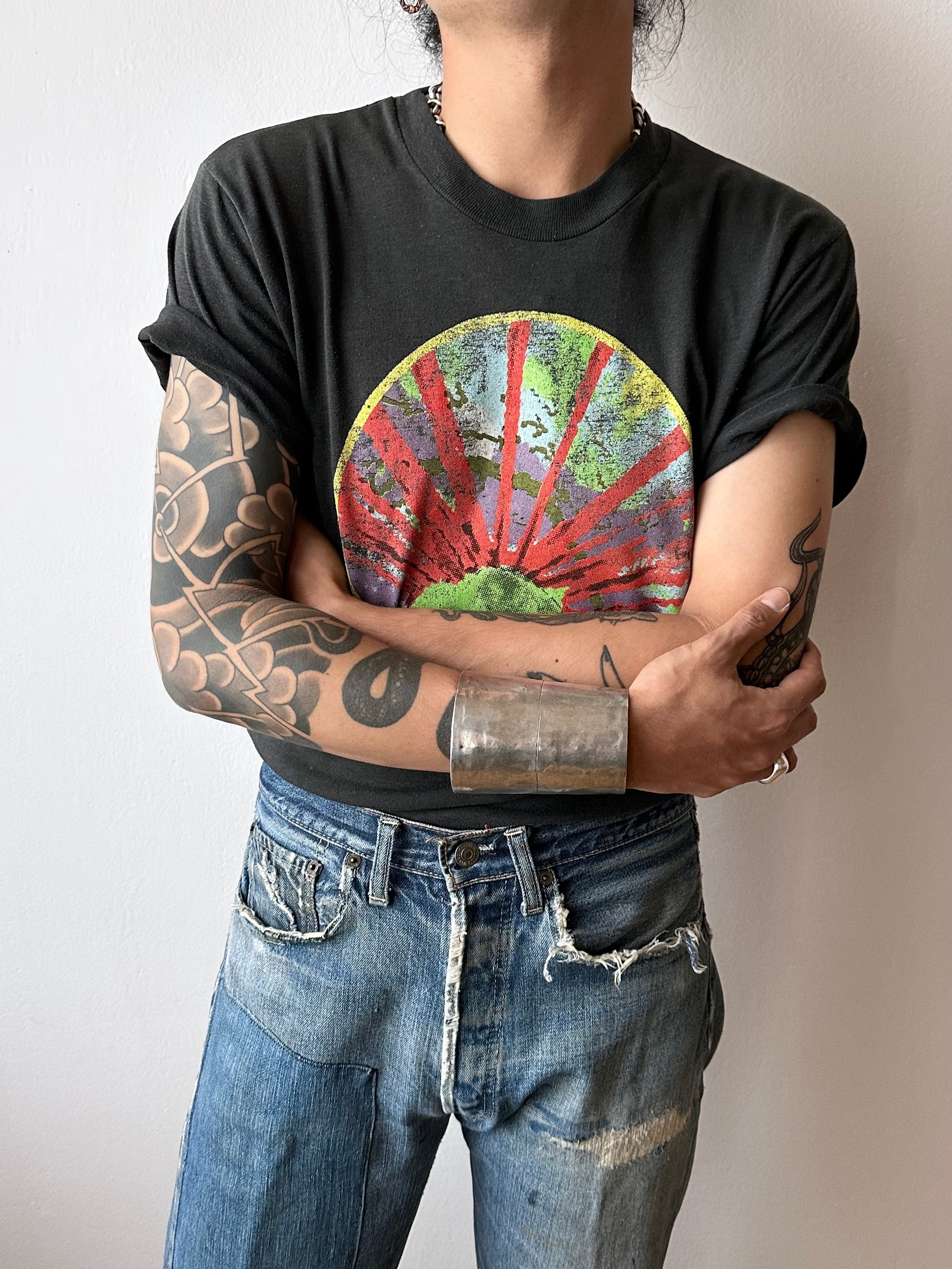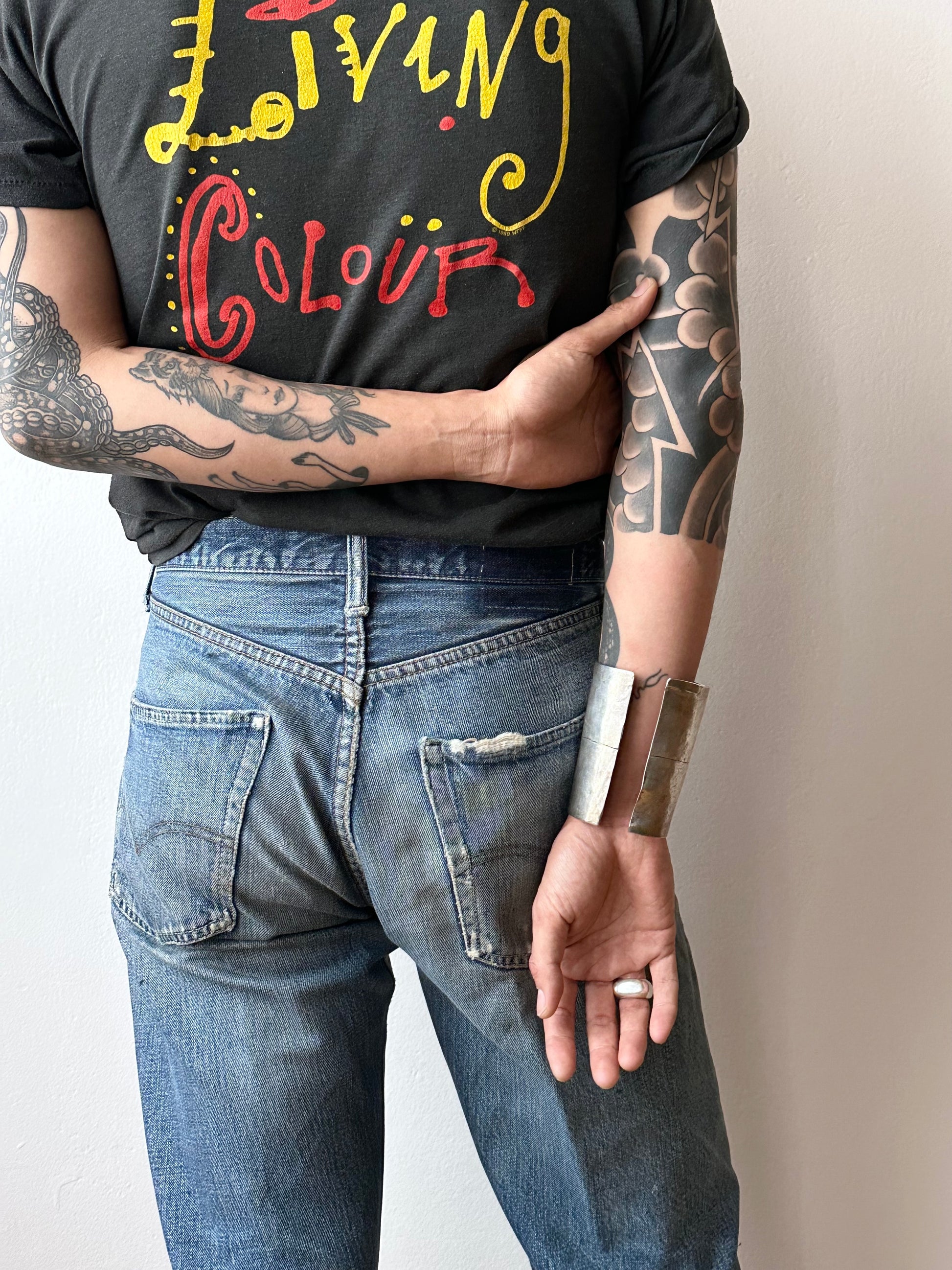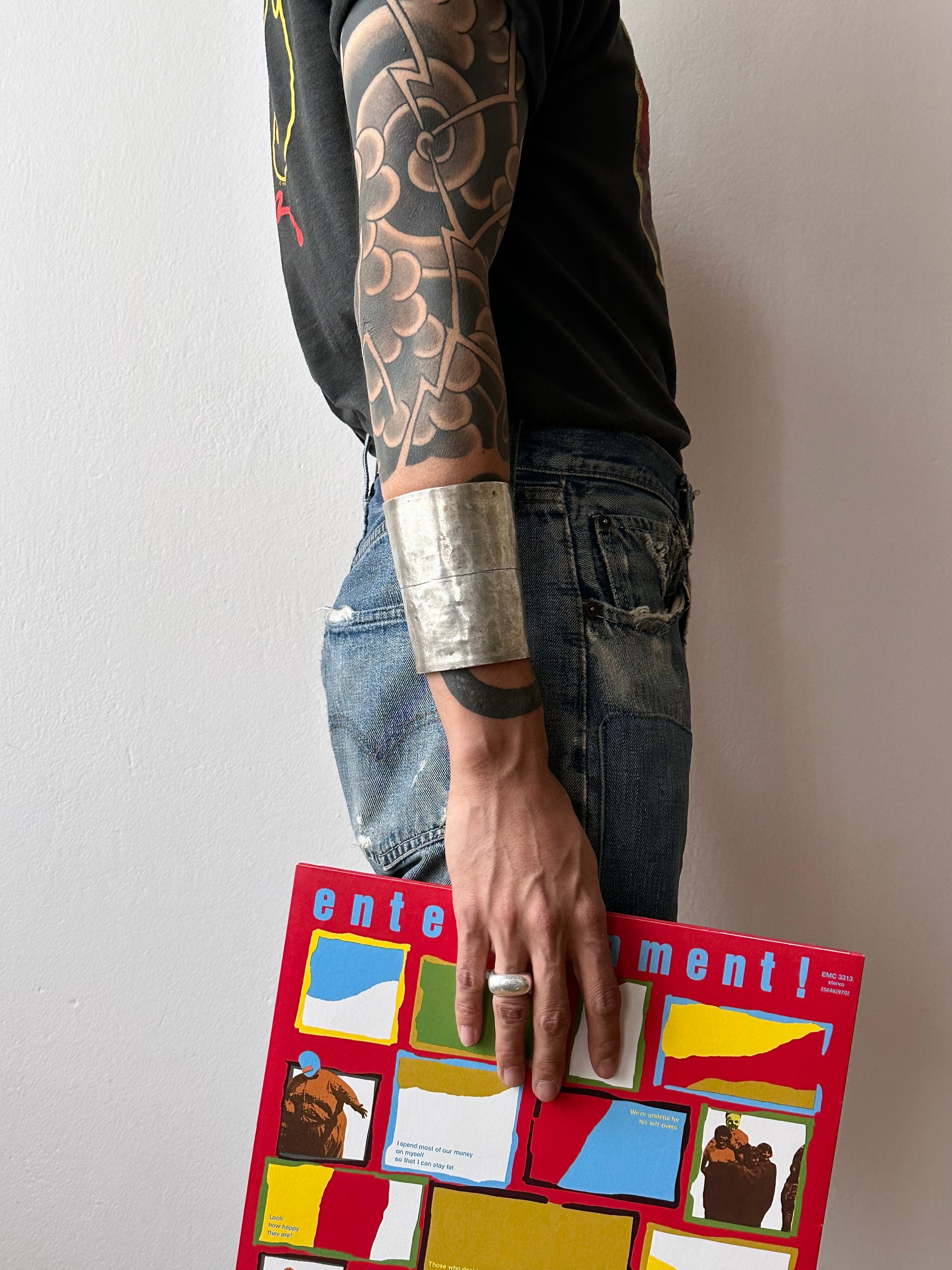 詳しい出どころ不明のアフリカンシルバージュエリーですが、この無機質で真っ直ぐなデザイン、凄いパワー。テクスチャは荒っぽく、歪みも傷もそのまま残した、生っぽい感じで、色はマットでくぐもった輝き方をするシルバー。ハンドグレイブでの1本線のみが中央に走ります。