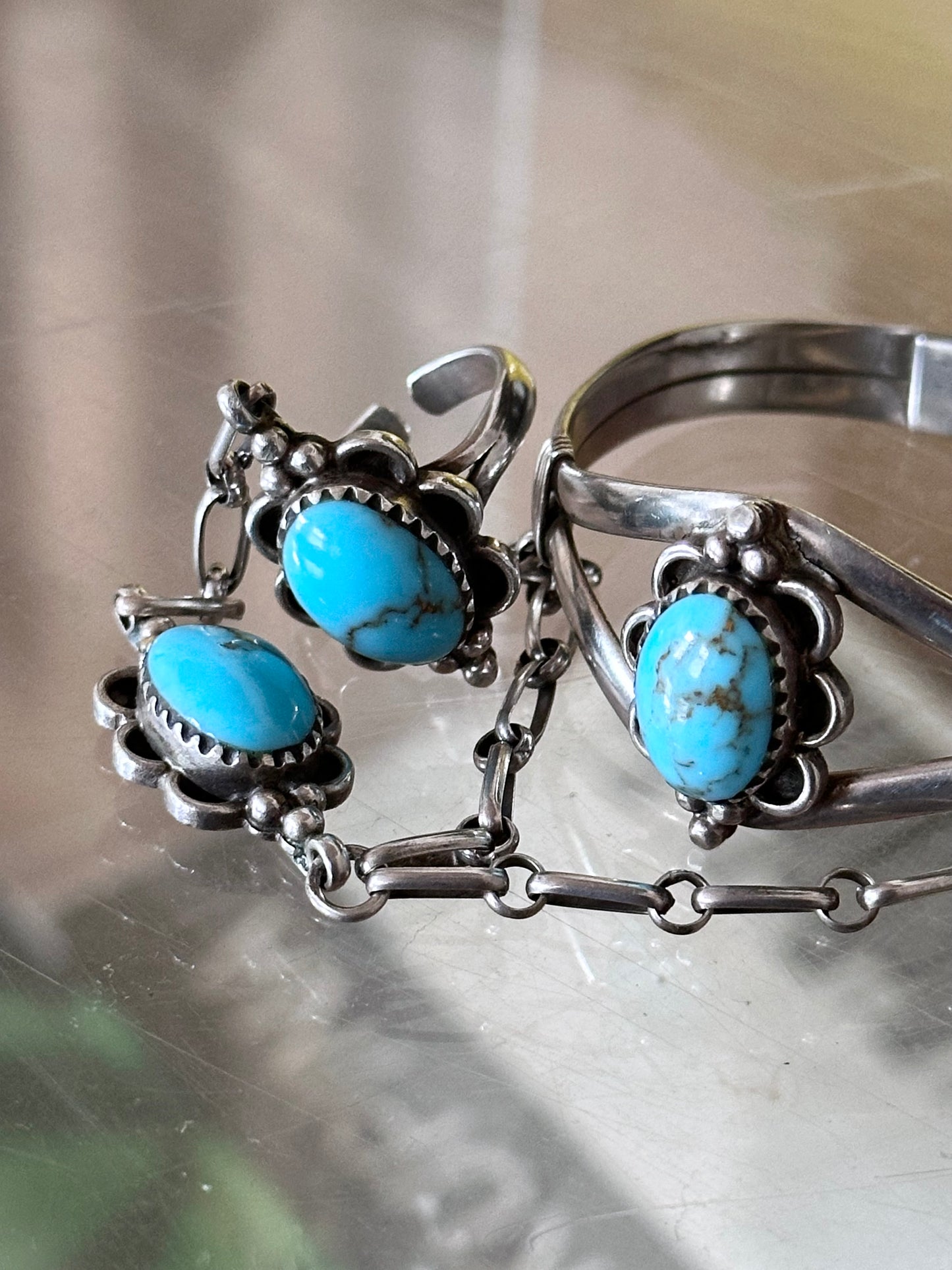 ターコイズの使い方や花弁のようなベゼル、球状の装飾はナバホやズニなどのネイティブアメリカンのジュエリーを彷彿とします。