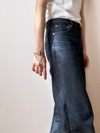 シルバー925とターコイズのバングルとリングがひと繋がりになったスレイブ・ブレスレット。