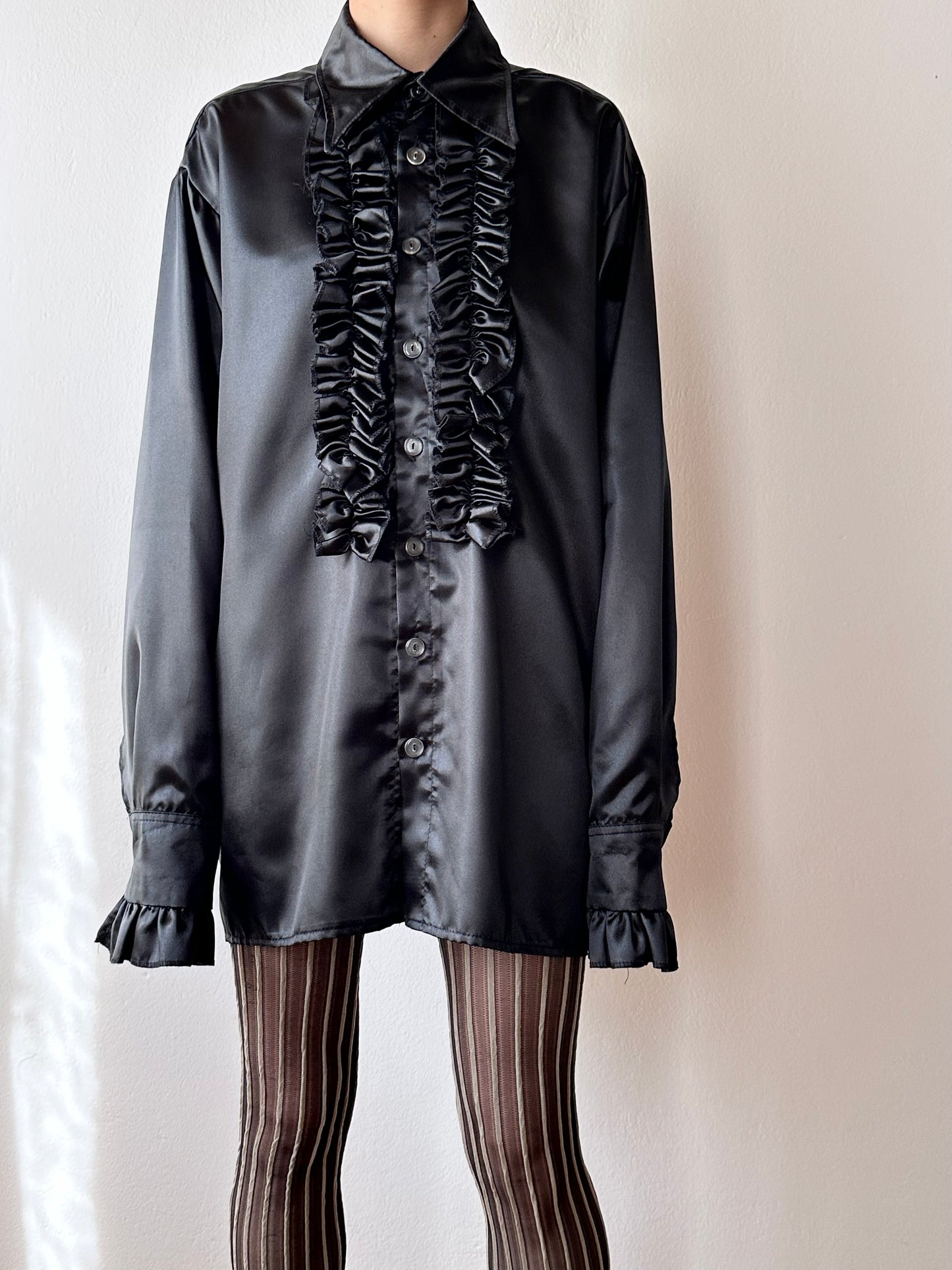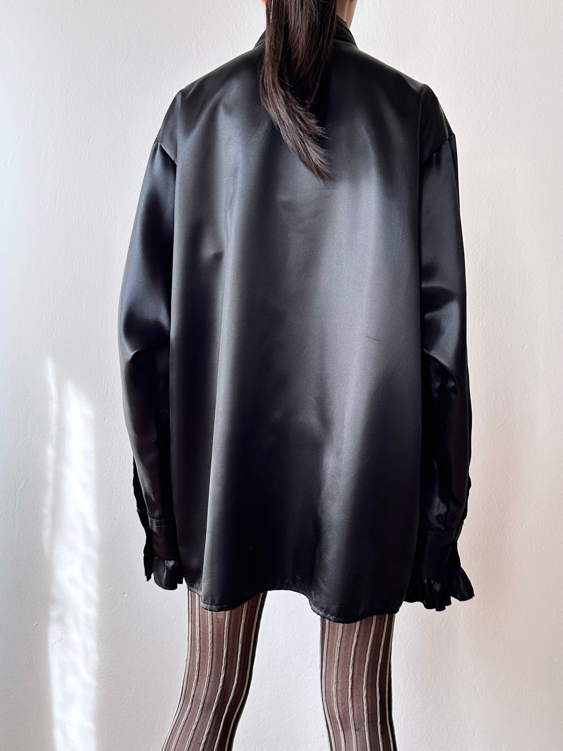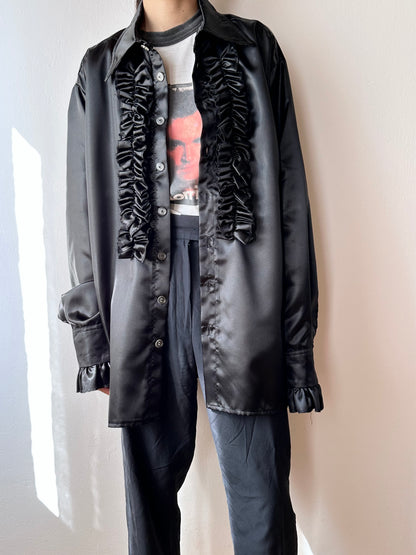 ブラックサテンの超ビッグサイズなフリルシャツ。