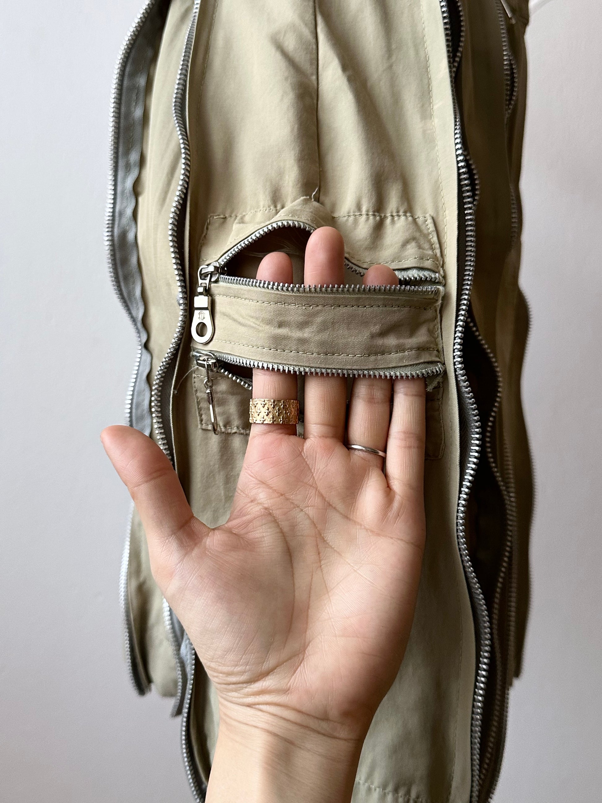 全面に走りまくったジップ、開くとマチになっていて、少し広がるシルエットに。