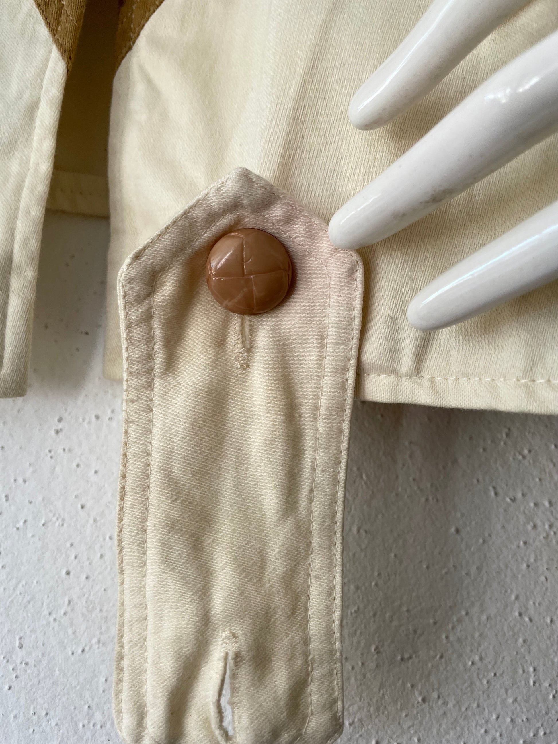 Condition - コンディション 全体的に綺麗ですが、2ヶ所に赤っぽい色移りが薄くあります。フロントボタンとバック右腕側。該当箇所を白い手で差して撮影しております。着ていて特に目立たない程度。