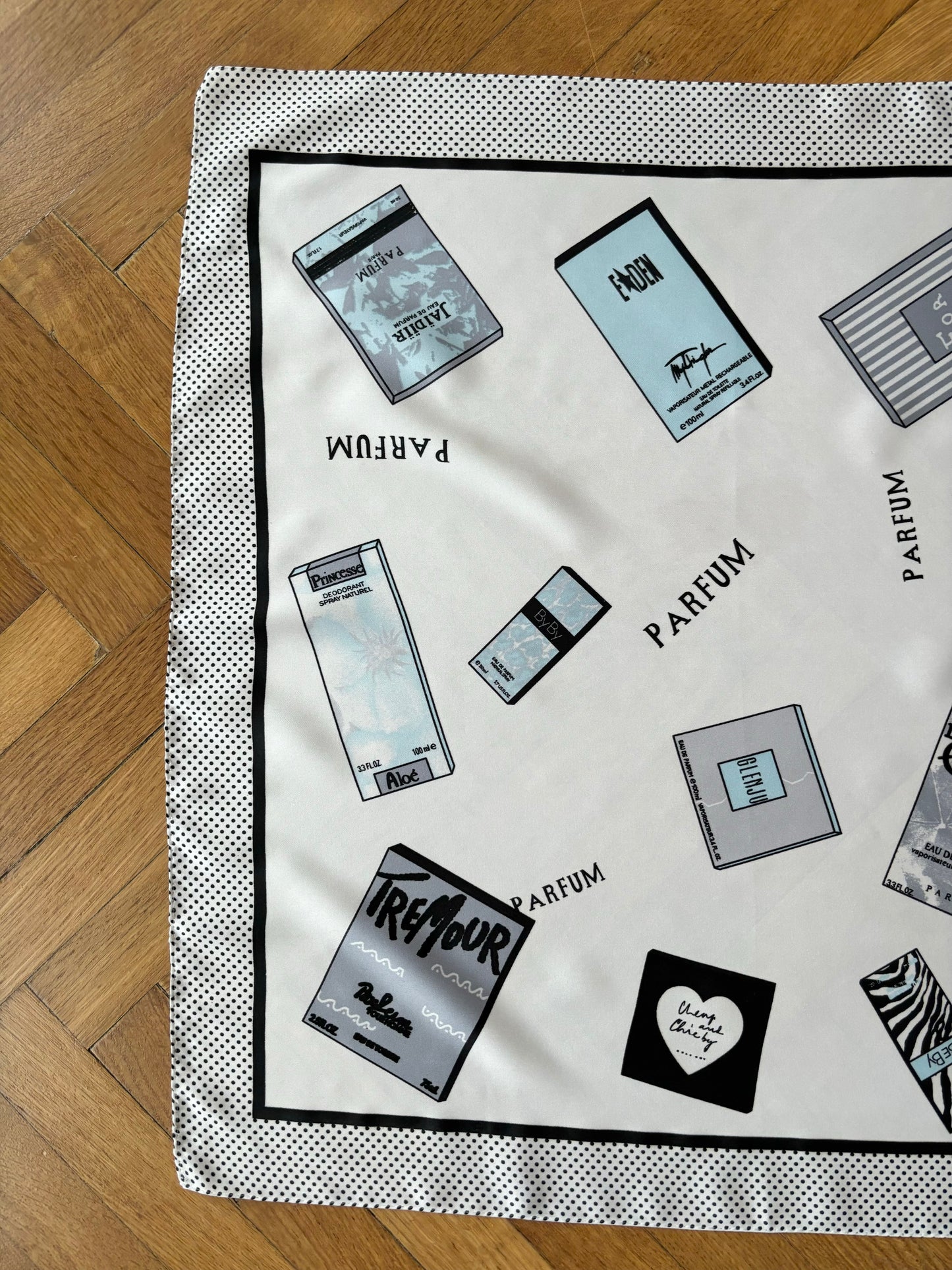 フランスで見つけた香水柄のスカーフ。