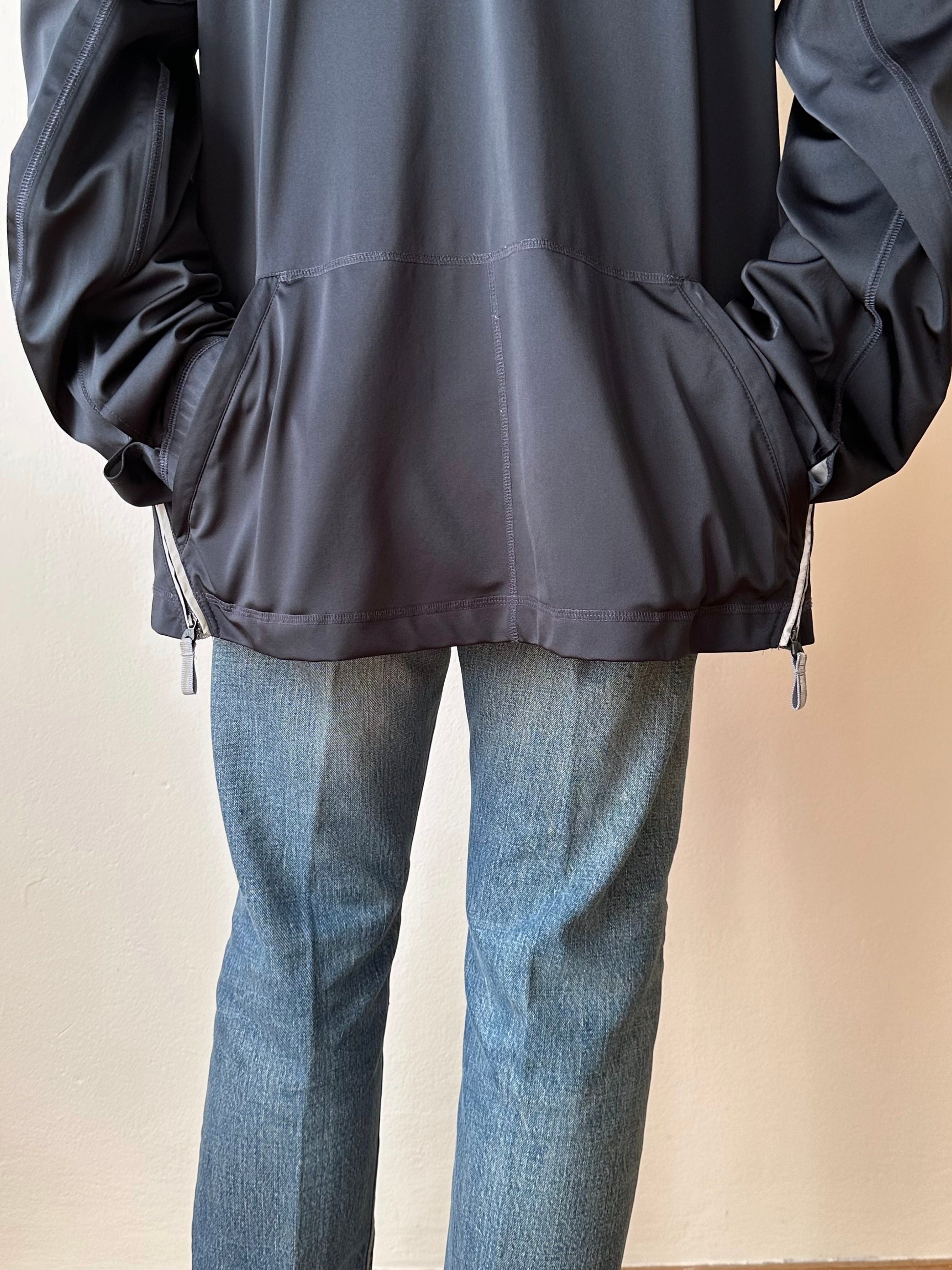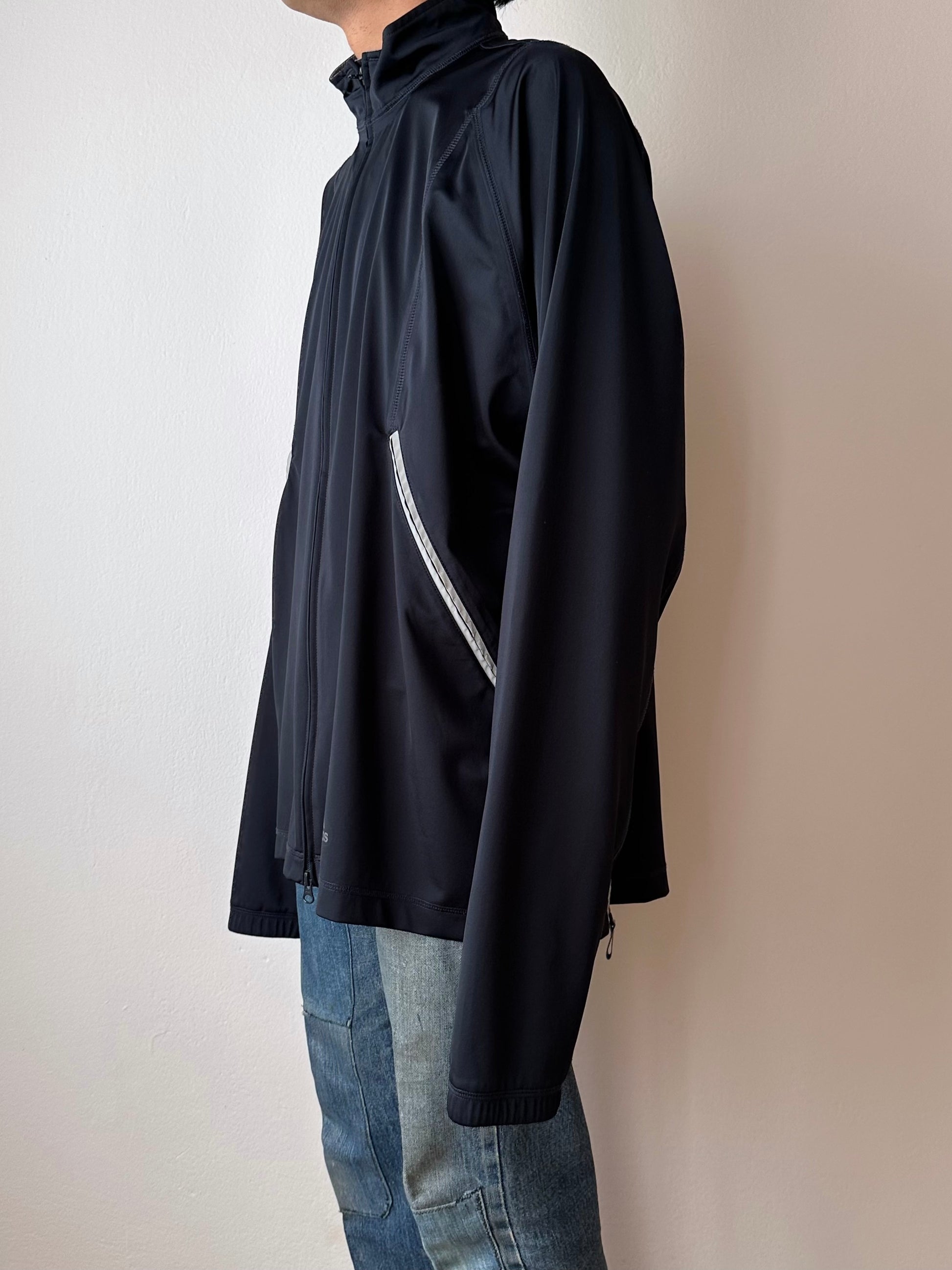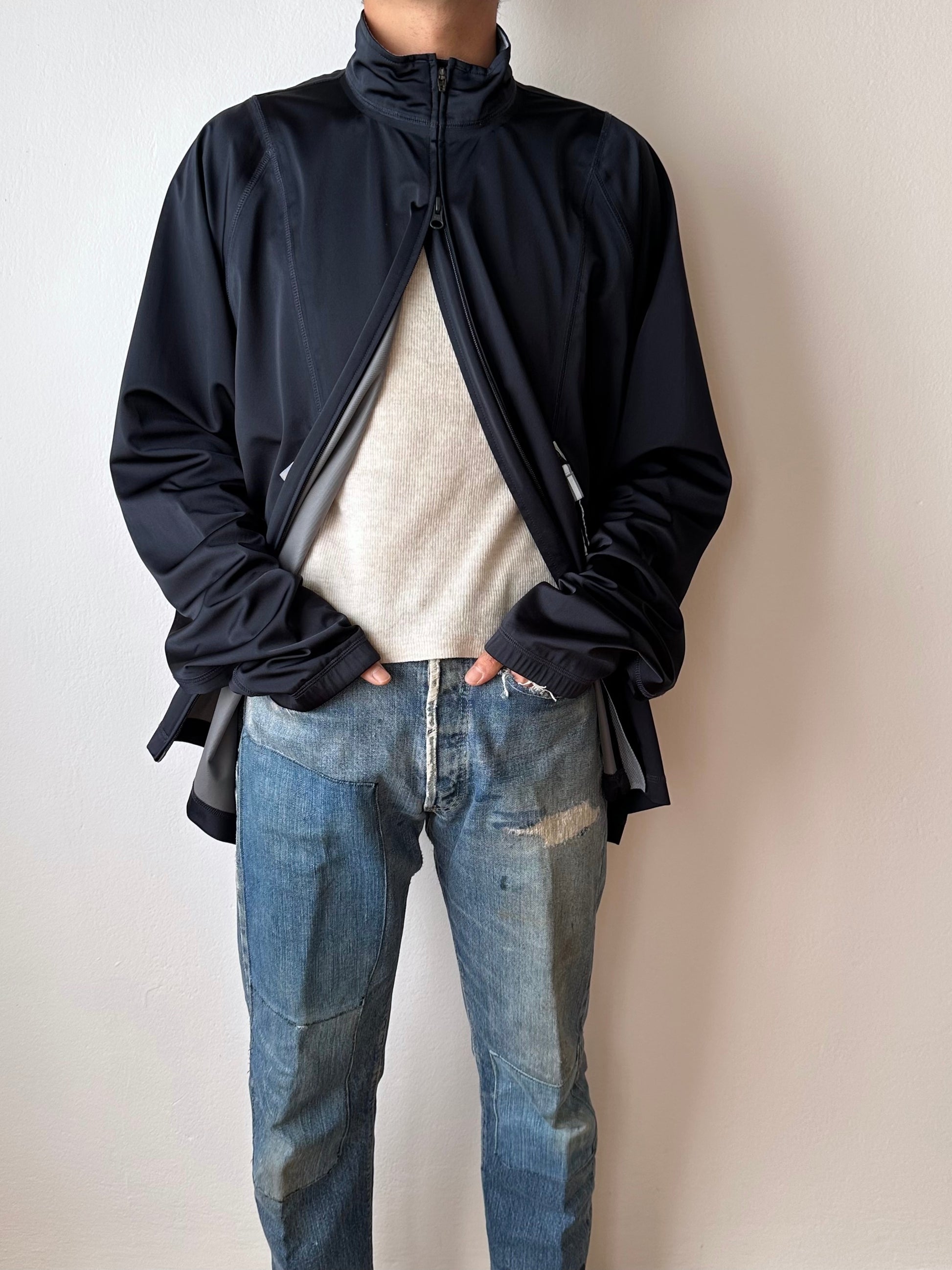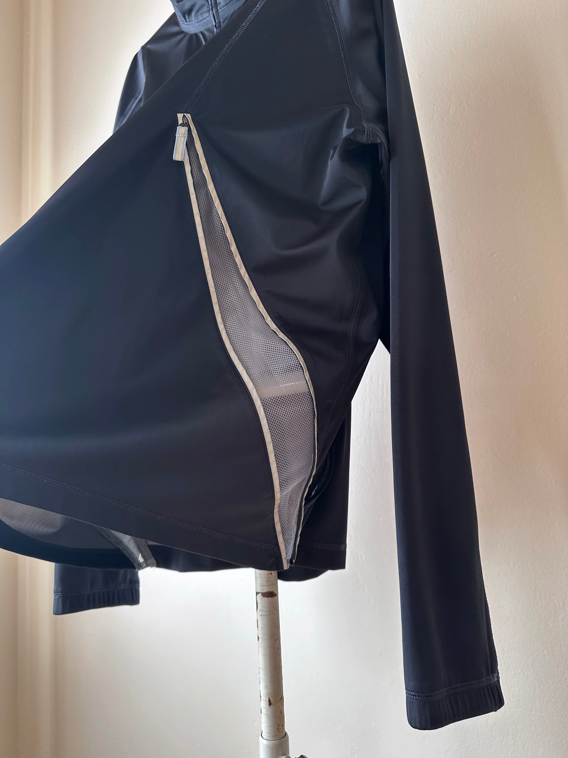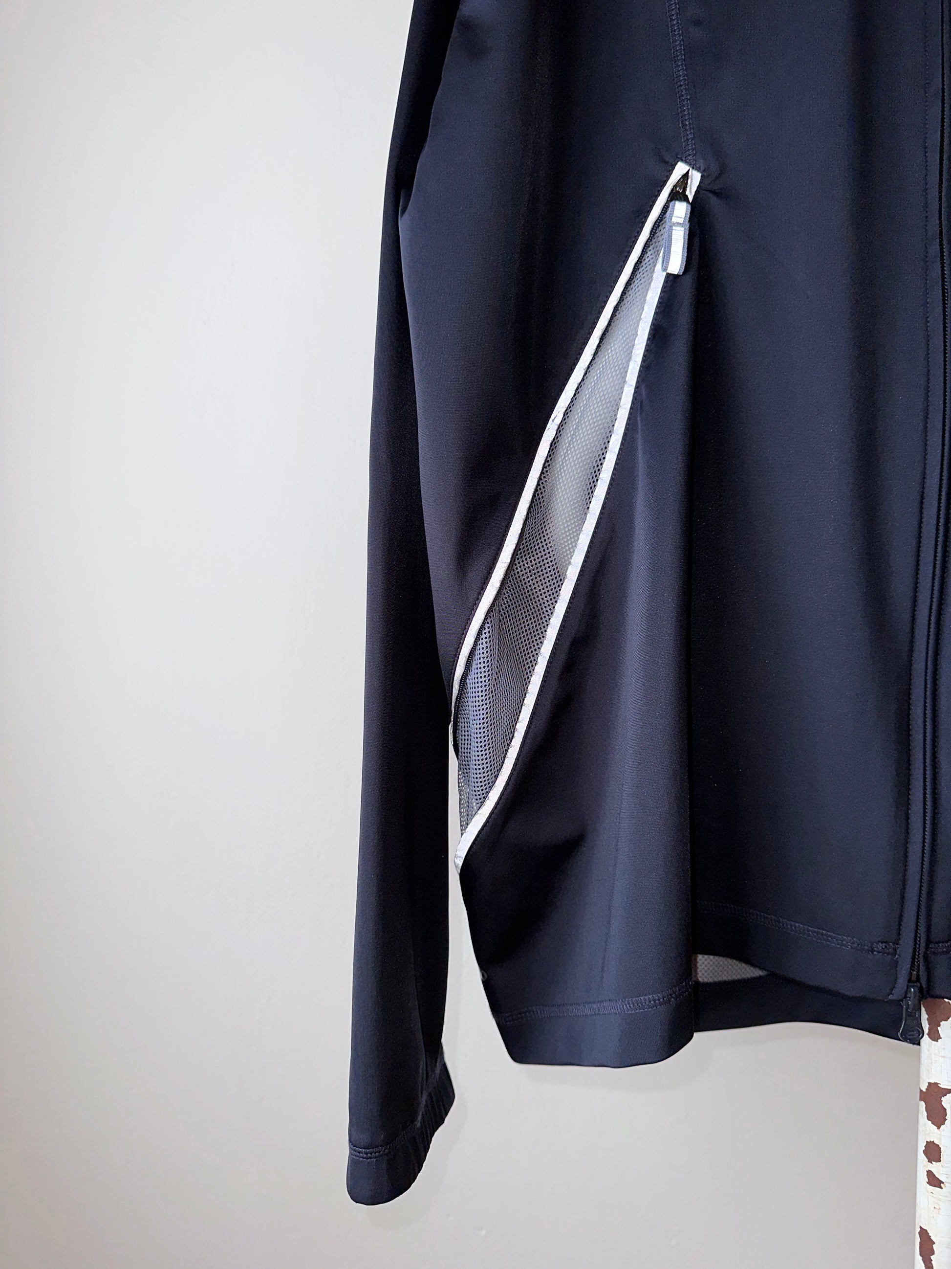 色は黒。量裾から胸元まで走るジップはリフレクターになっています。ここのジッパーを開けるとポケットではなく、裏地のメッシュ素材が出てきてマチになっているというデザインです。