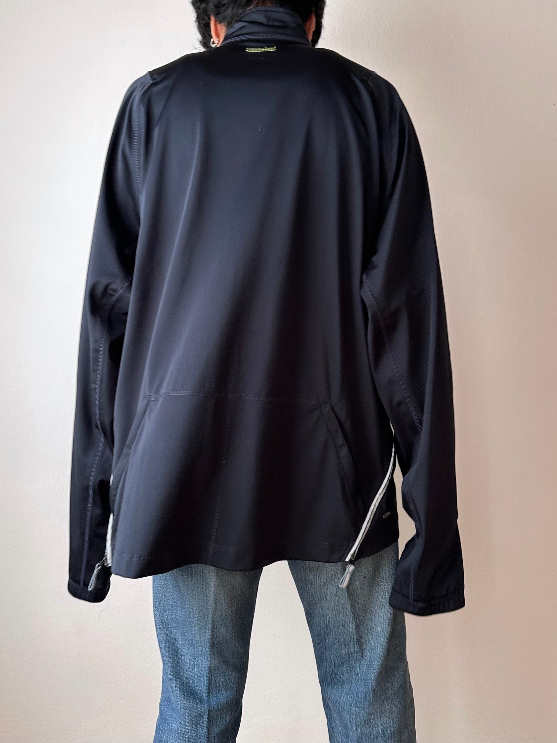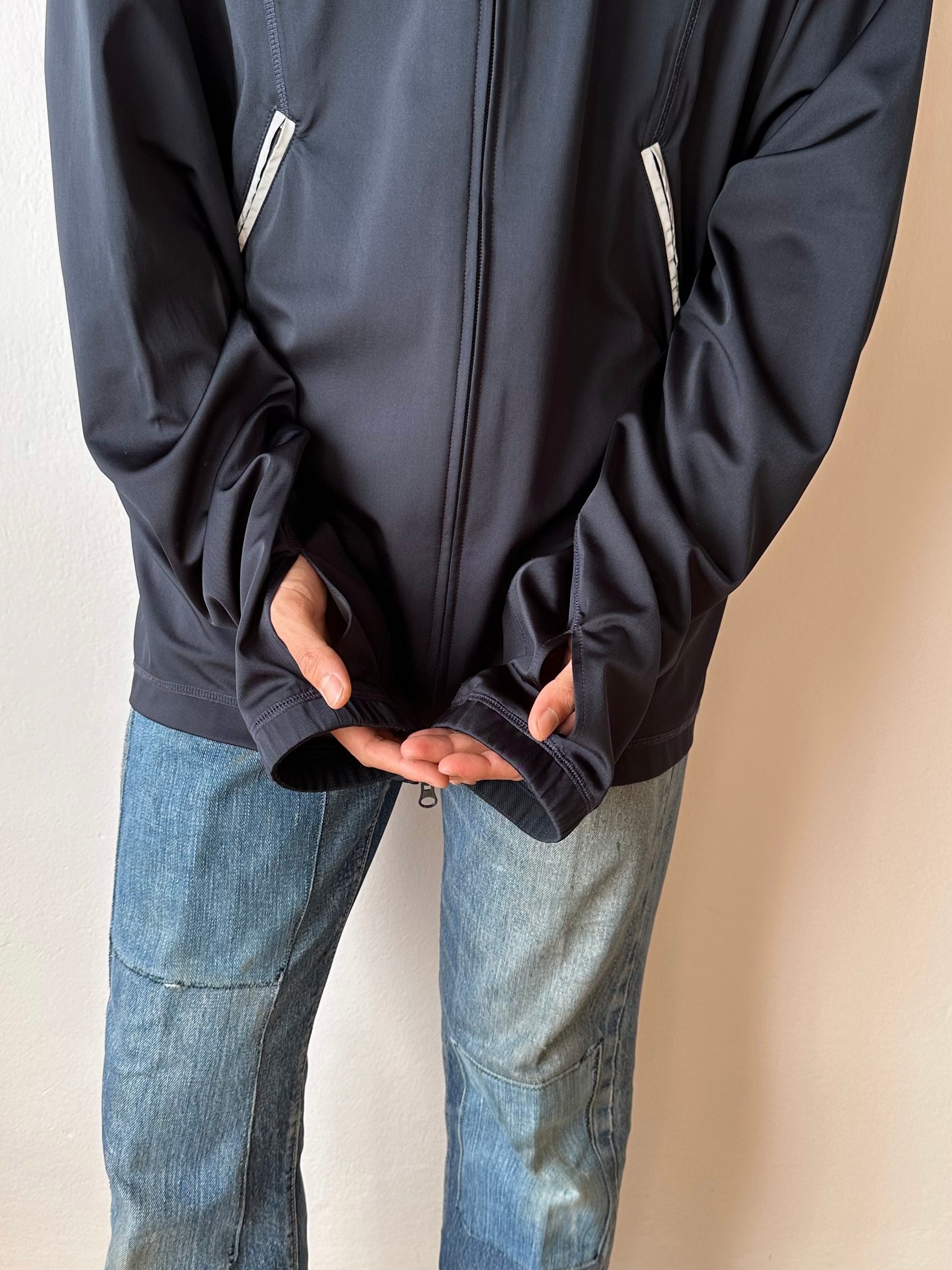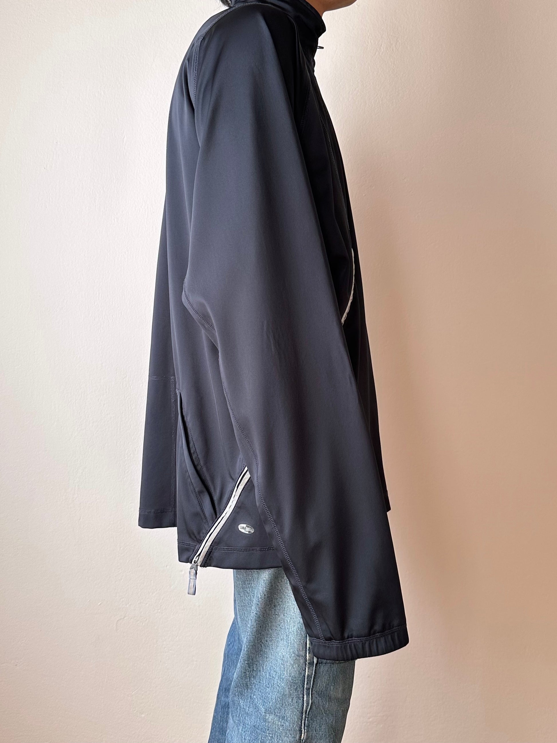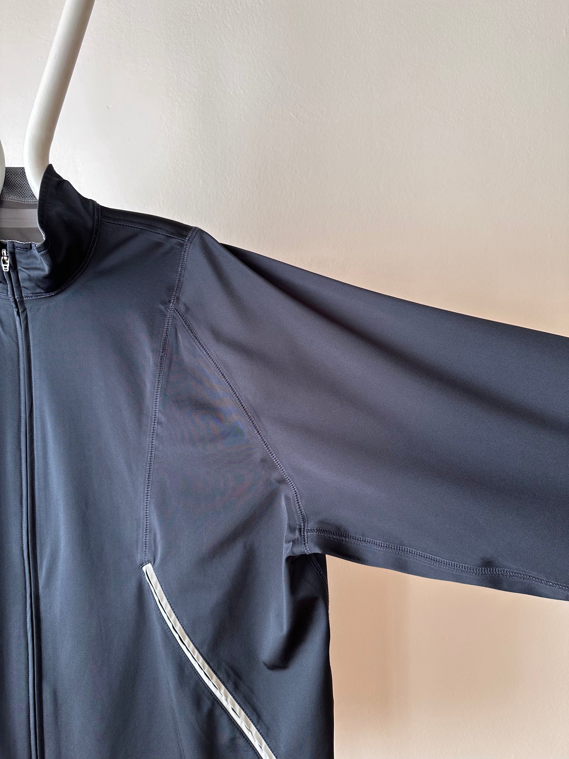 色は黒。量裾から胸元まで走るジップはリフレクターになっています。ここのジッパーを開けるとポケットではなく、裏地のメッシュ素材が出てきてマチになっているというデザインです。