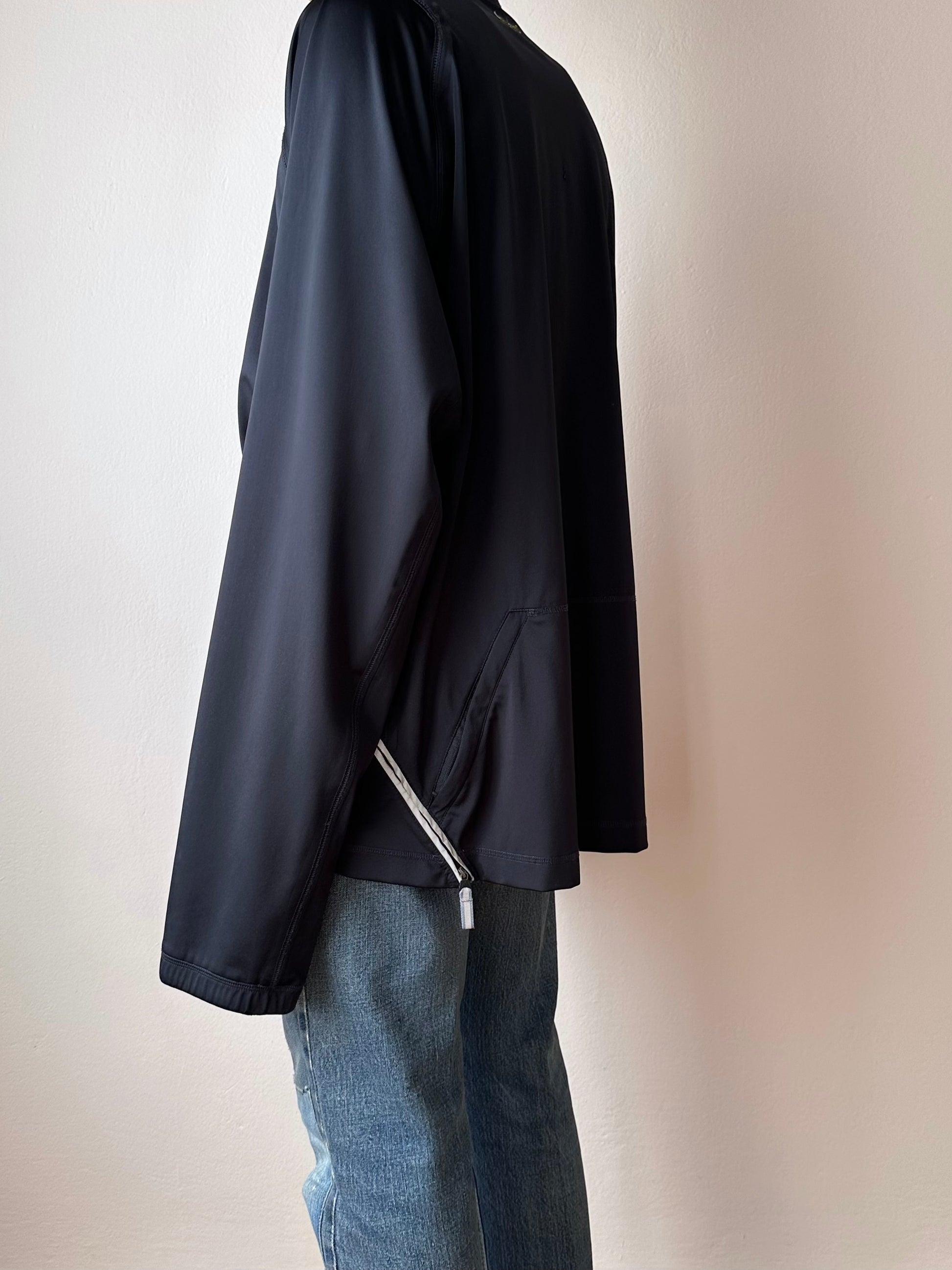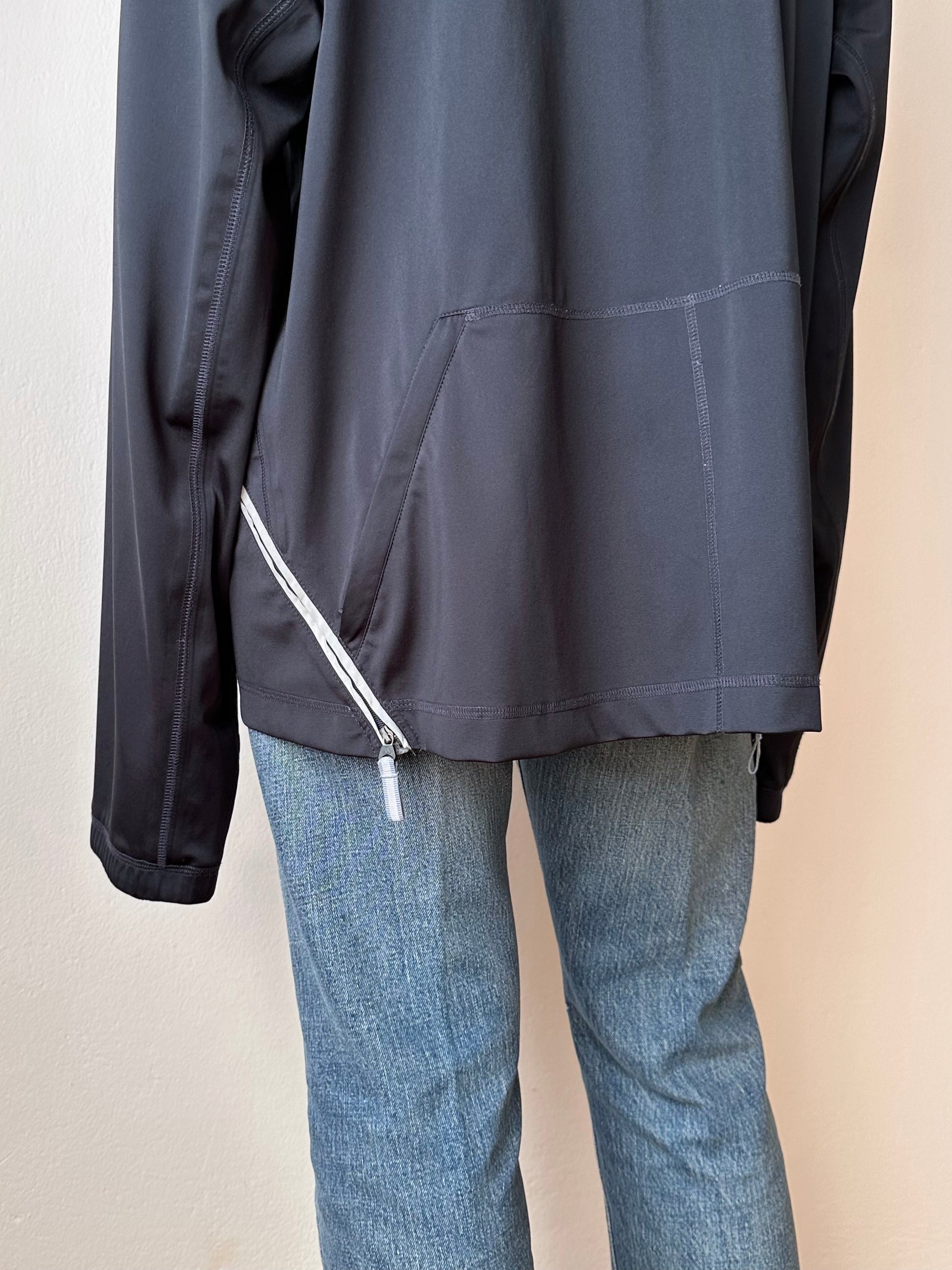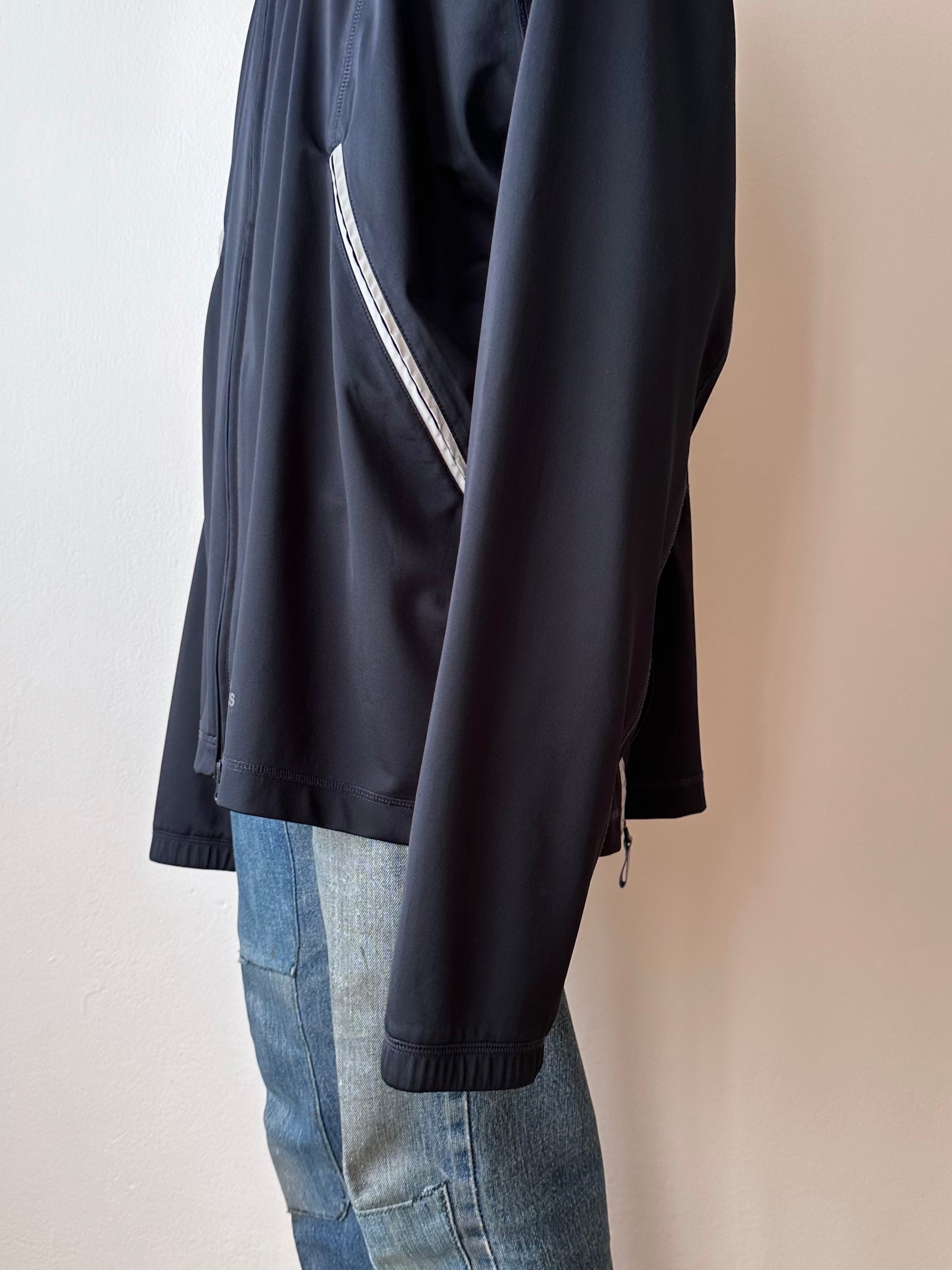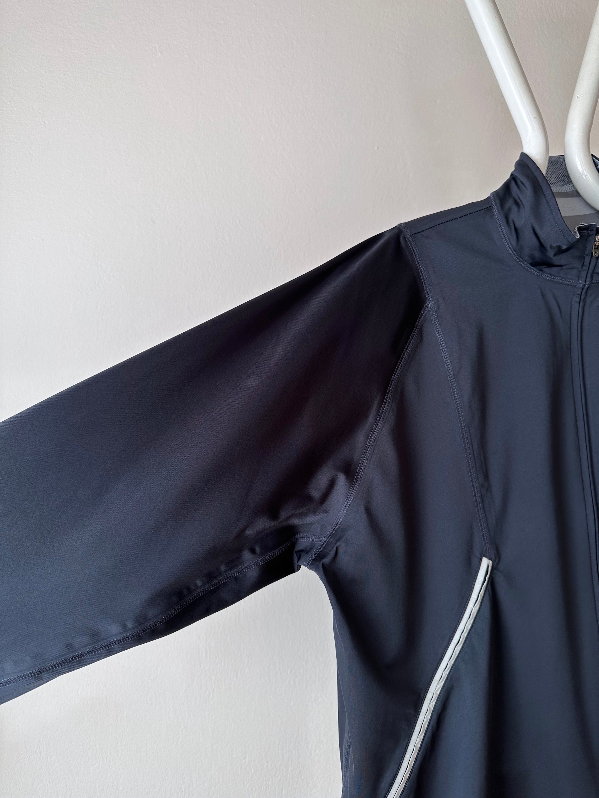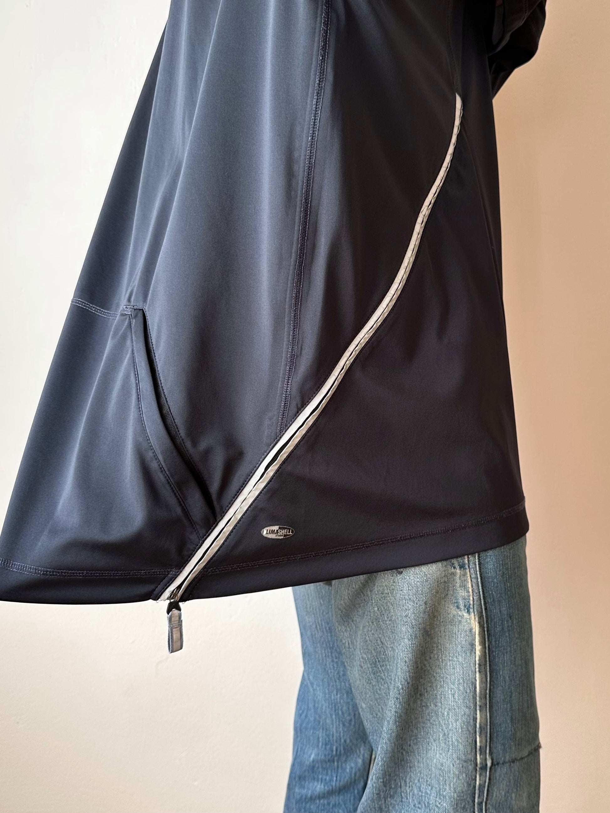 色は黒。量裾から胸元まで走るジップはリフレクターになっています。ここのジッパーを開けるとポケットではなく、裏地のメッシュ素材が出てきてマチになっているというデザインです。