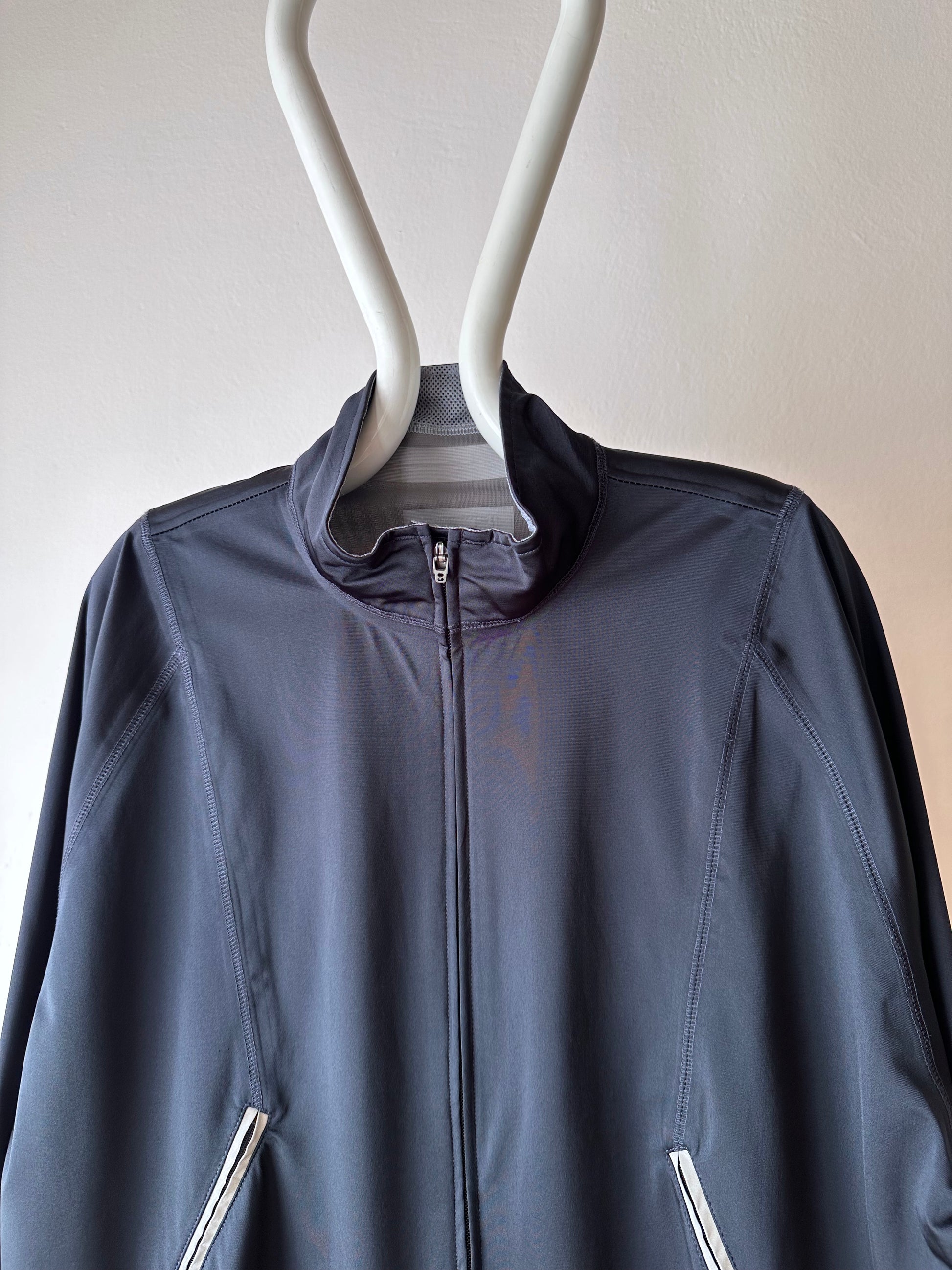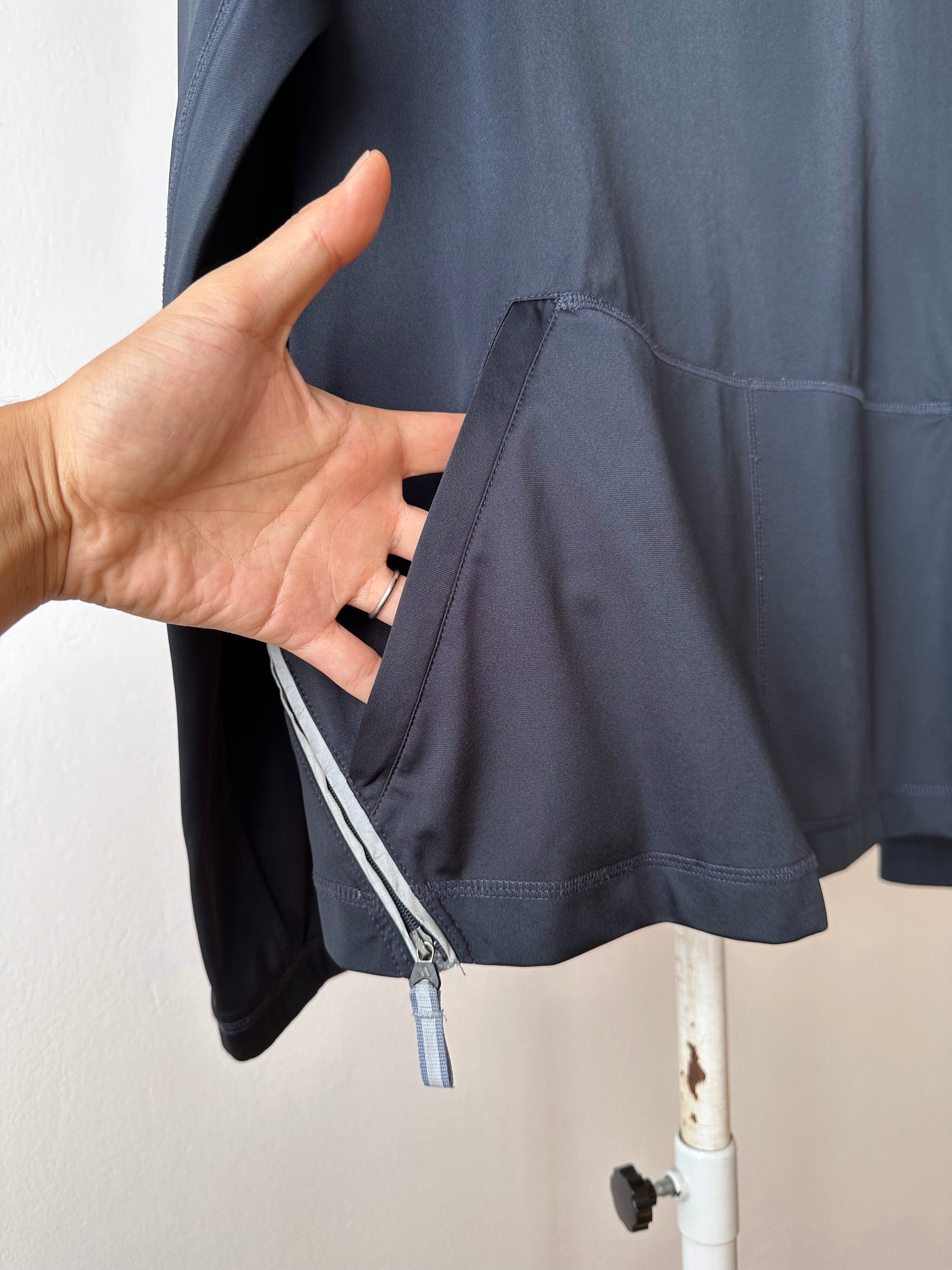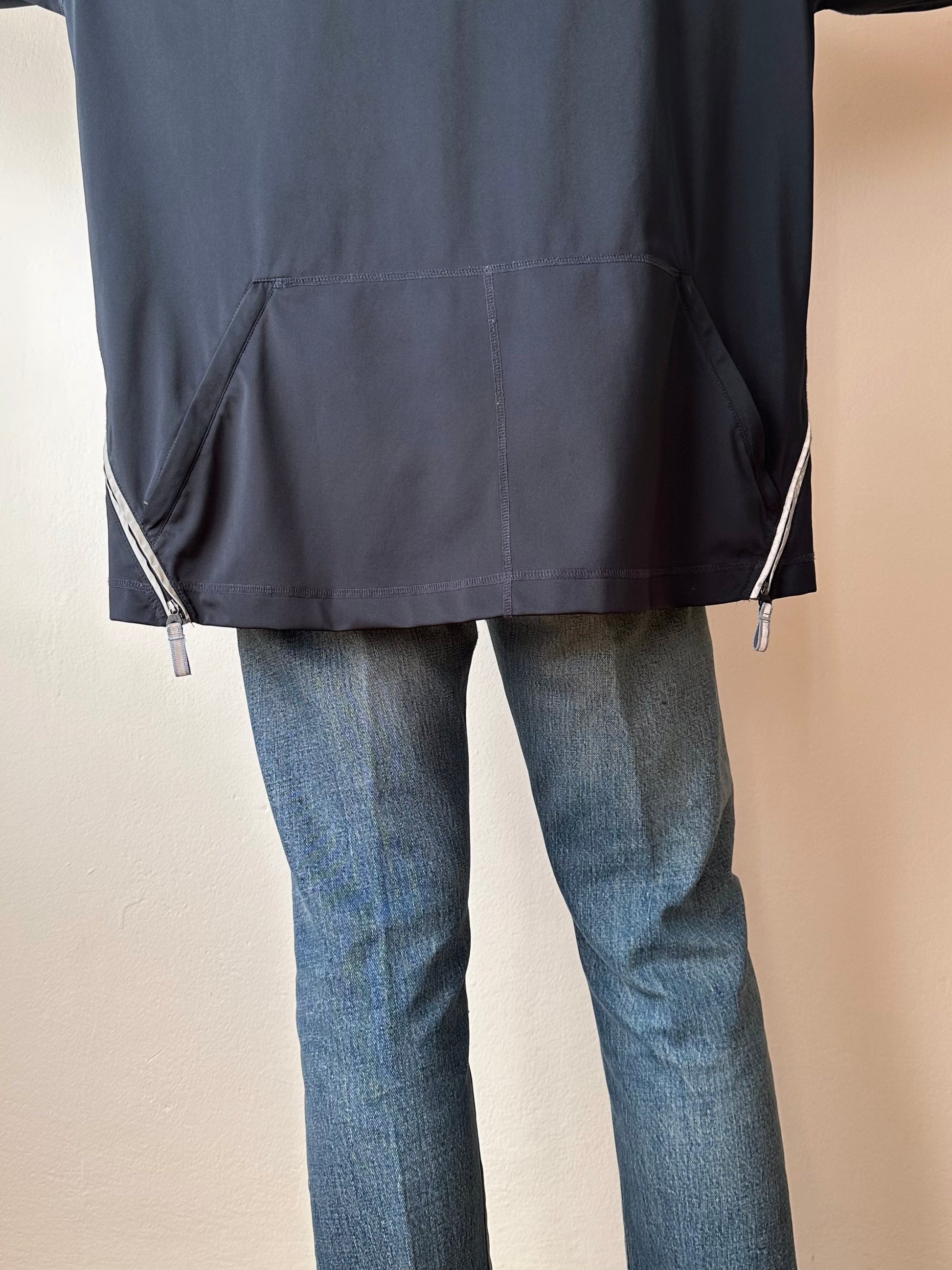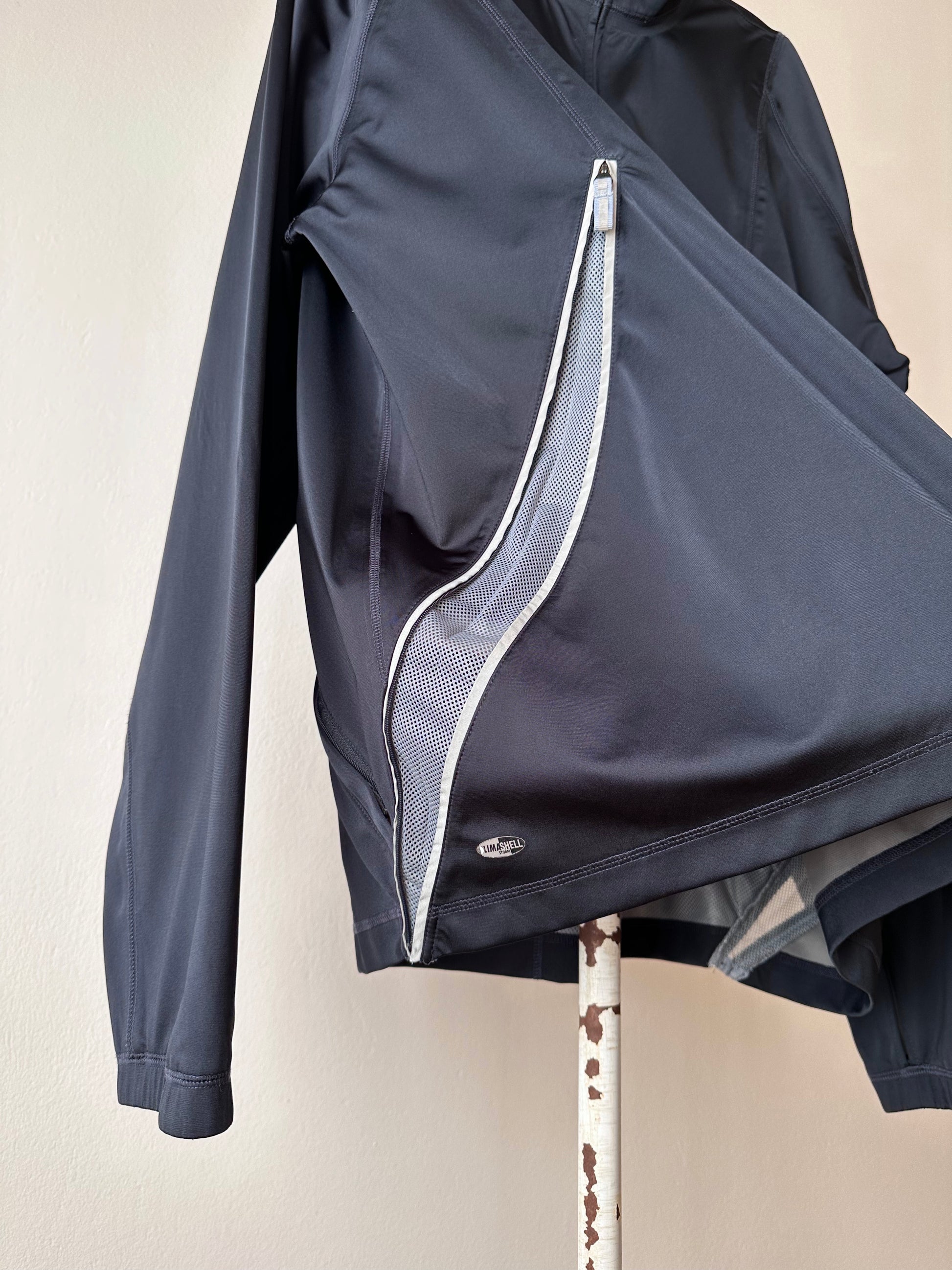 色は黒。量裾から胸元まで走るジップはリフレクターになっています。ここのジッパーを開けるとポケットではなく、裏地のメッシュ素材が出てきてマチになっているというデザインです。