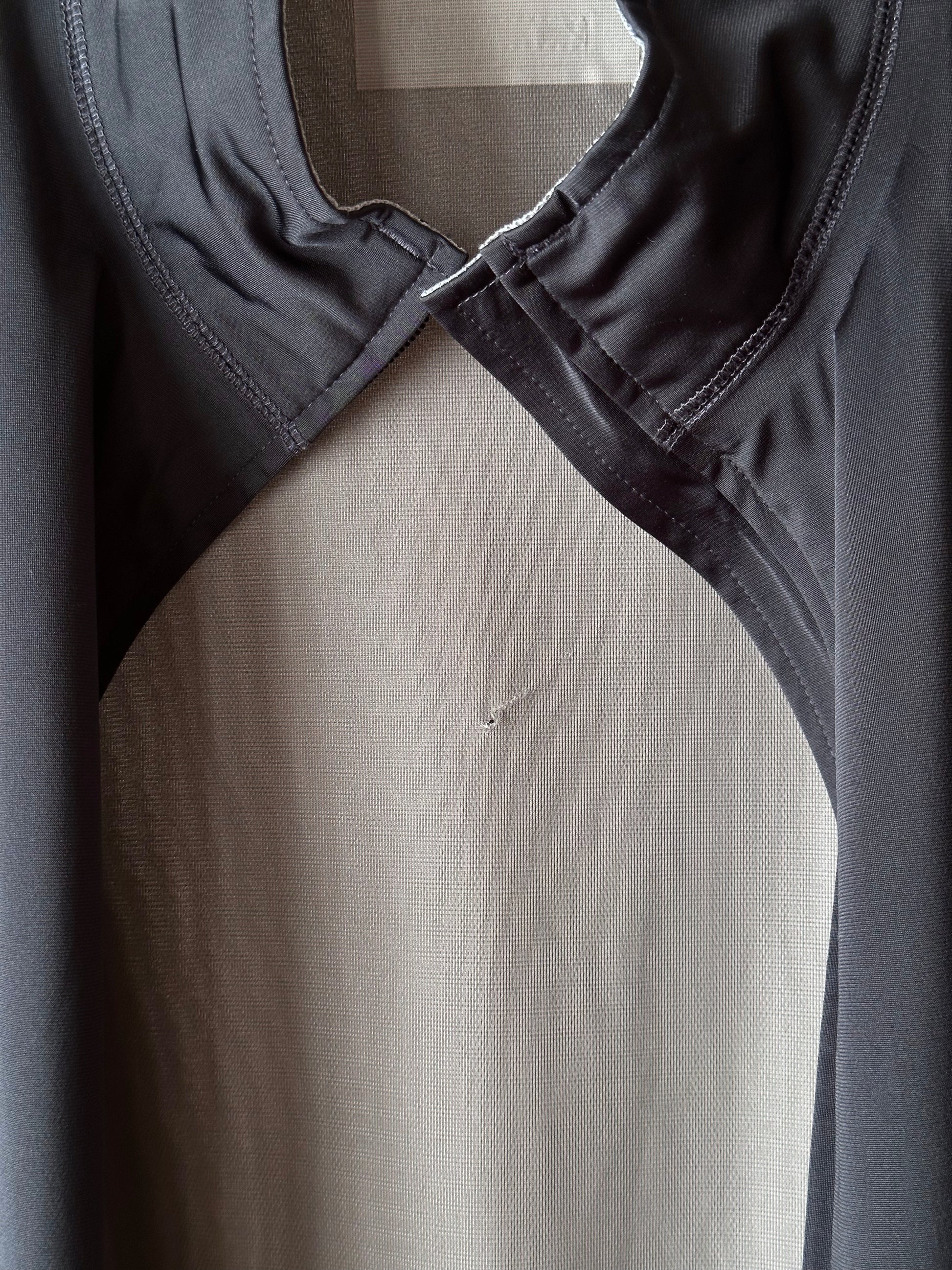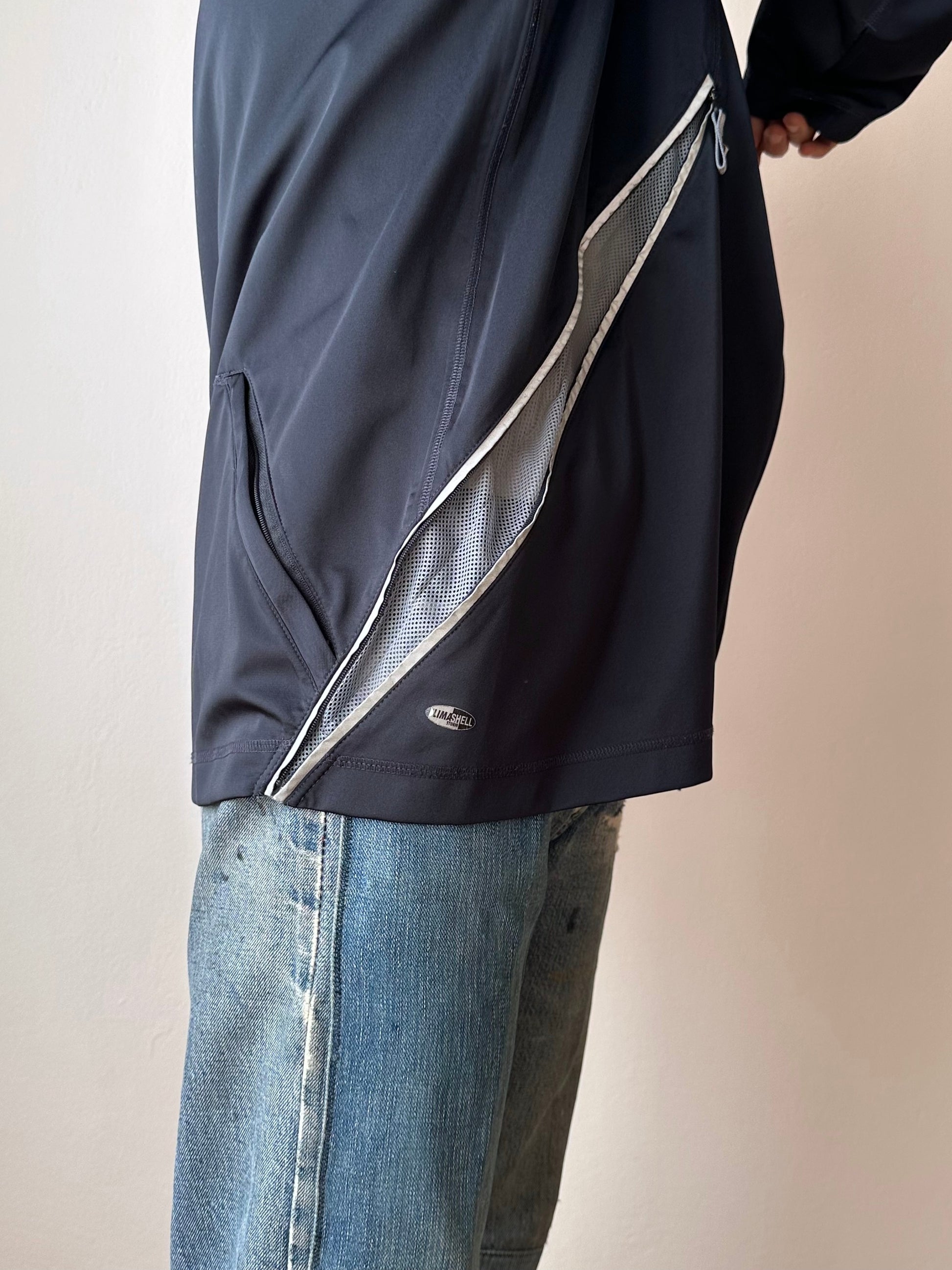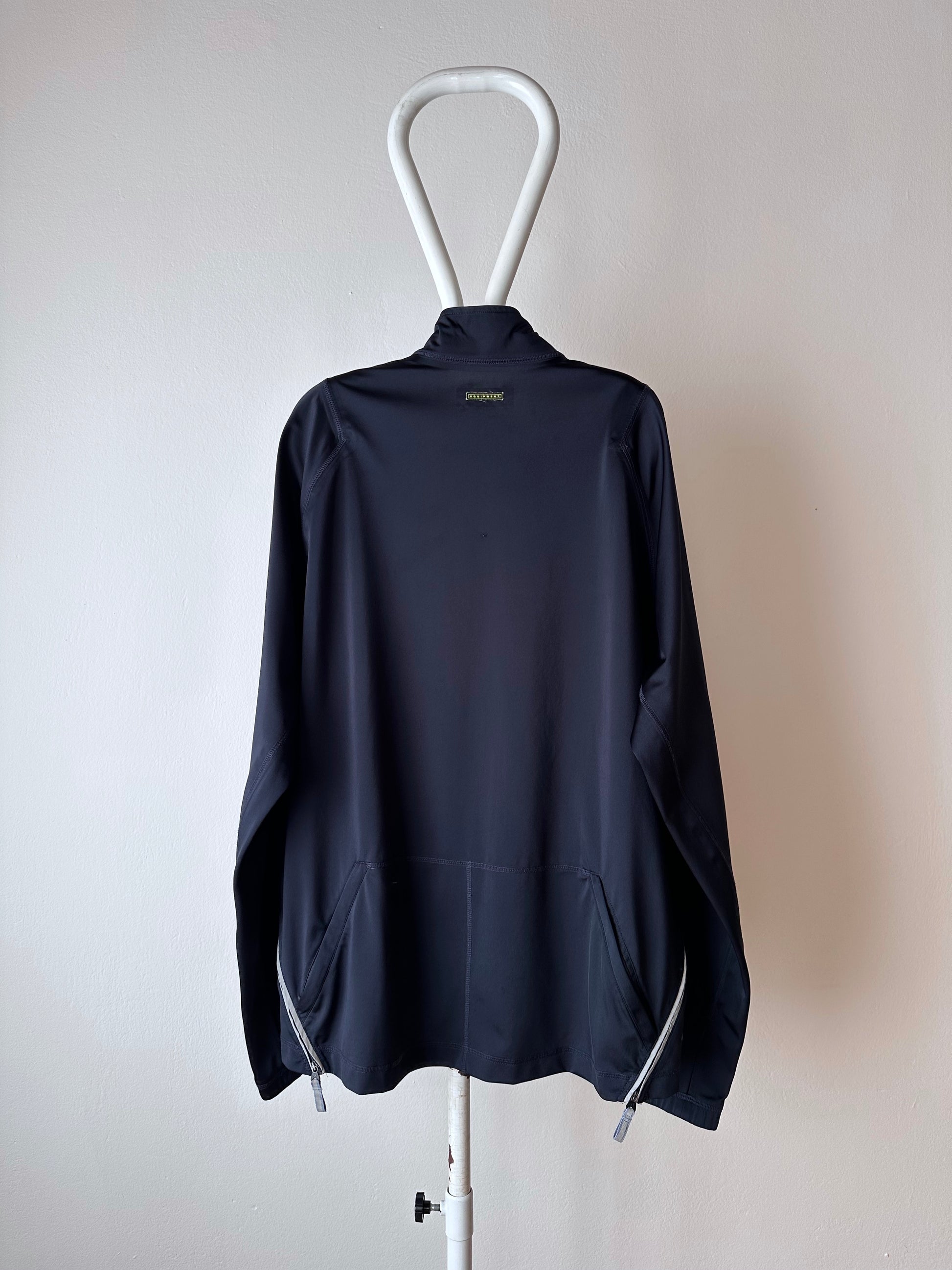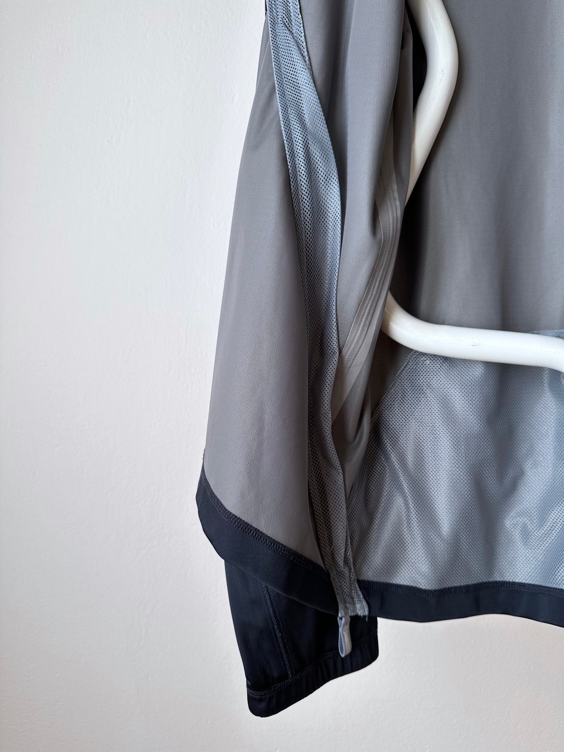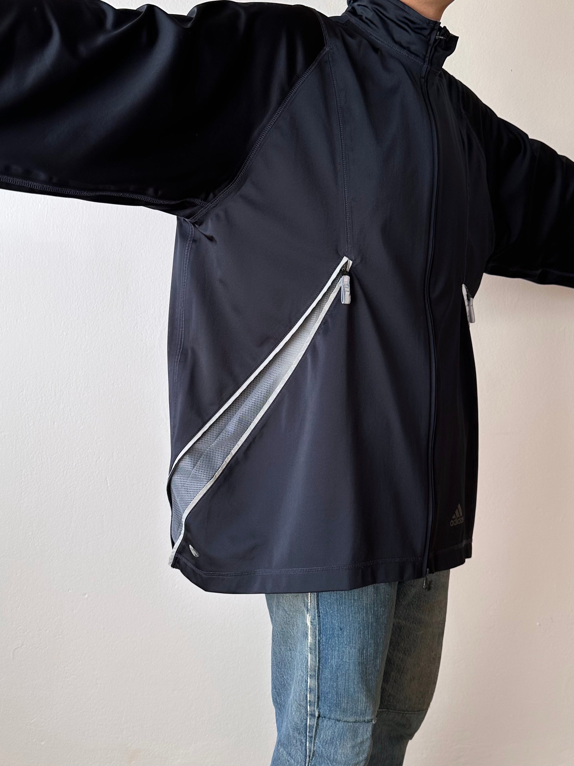 色は黒。量裾から胸元まで走るジップはリフレクターになっています。ここのジッパーを開けるとポケットではなく、裏地のメッシュ素材が出てきてマチになっているというデザインです。