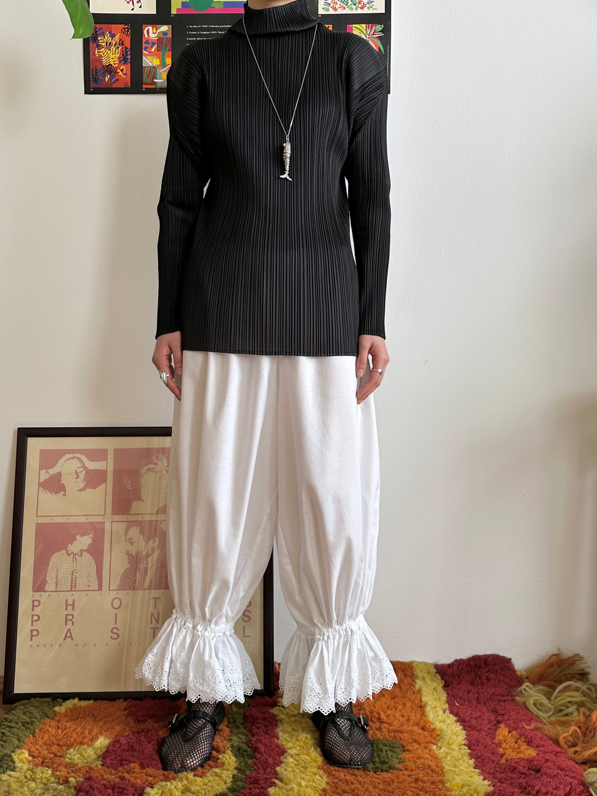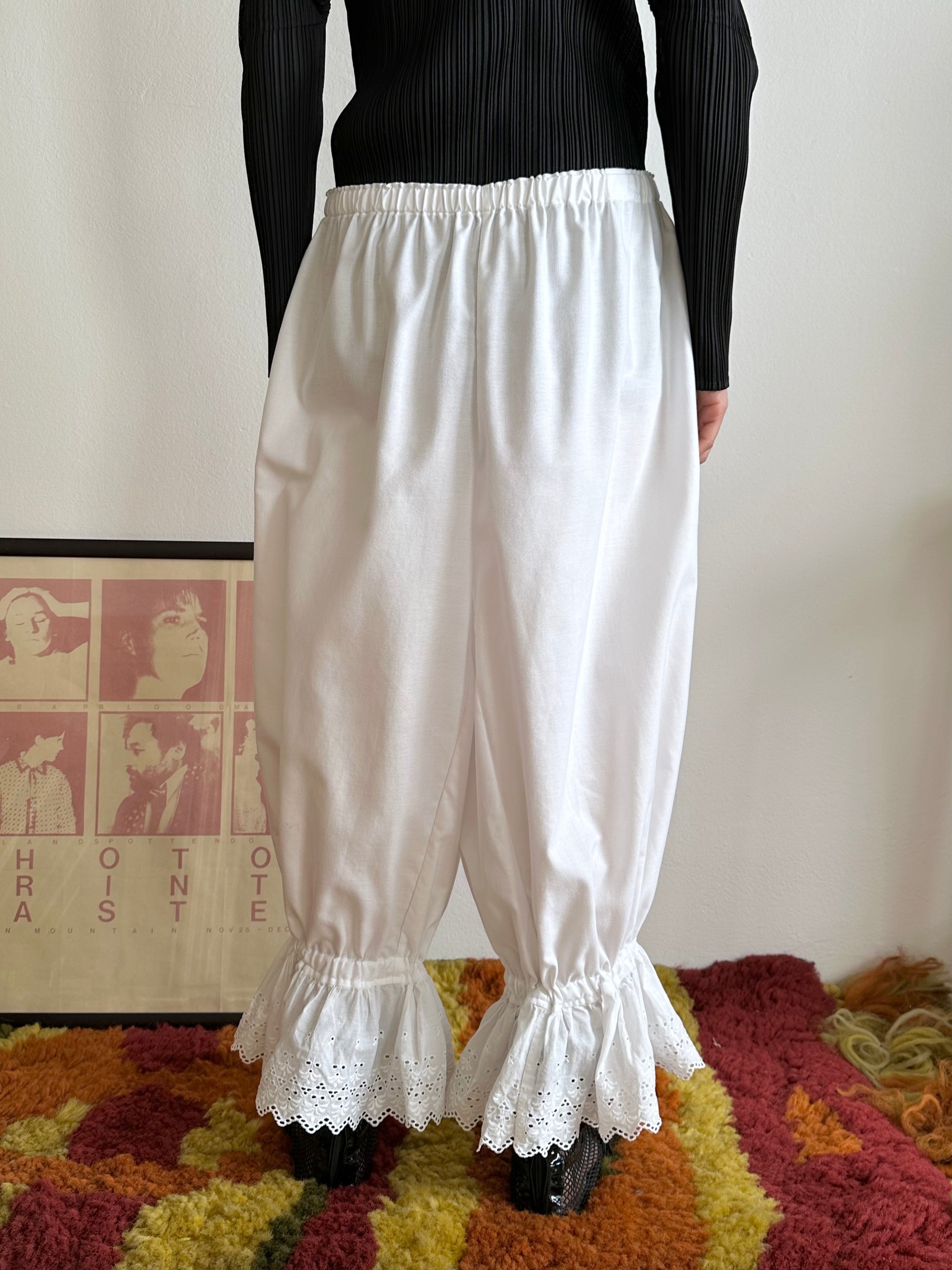 もったり膨らんだブルマの形と、広がるレースがピエロみたいなパンツ。