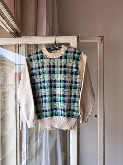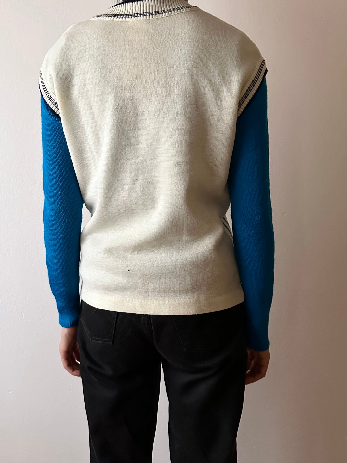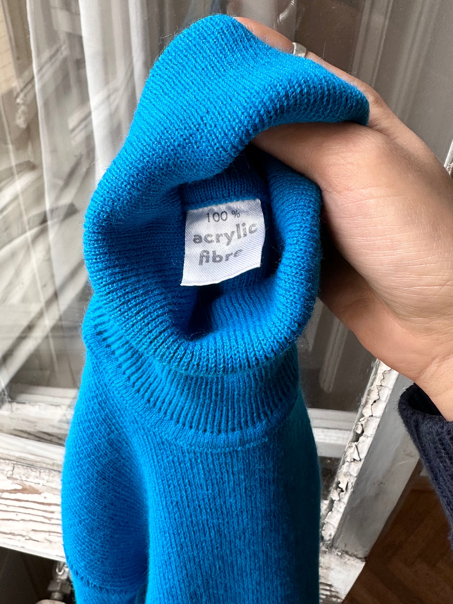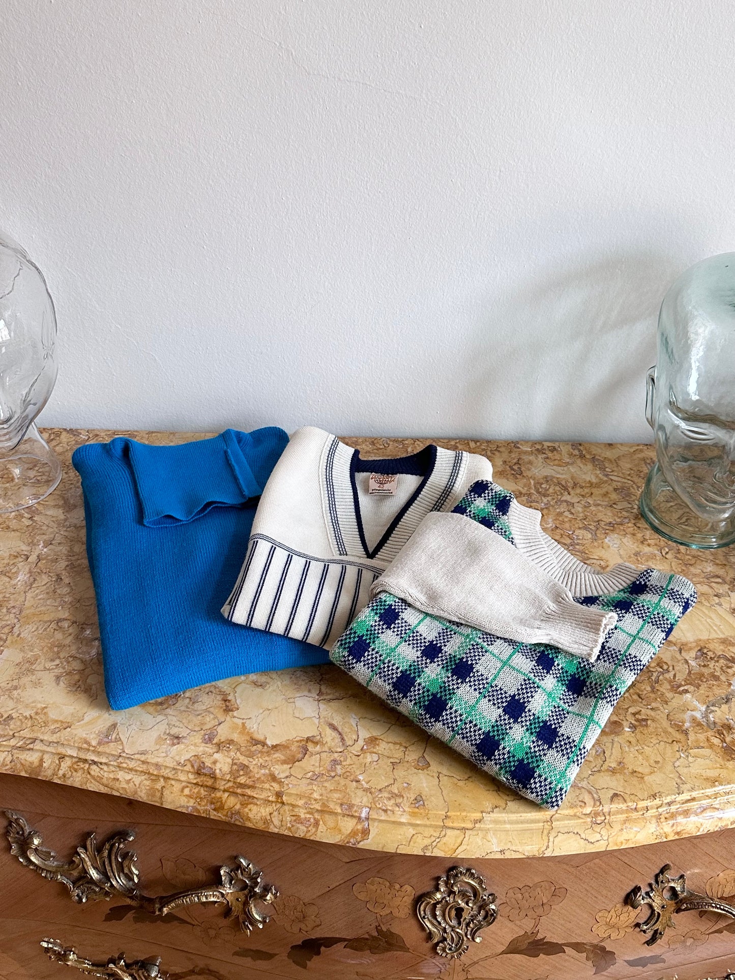 綺麗なブルーのタートルネックニット(そのまま良い色味出せた)、それに合わせたネイビーピンストライプの爽やかなニットベスト、そしてチェック柄のちびニットです。