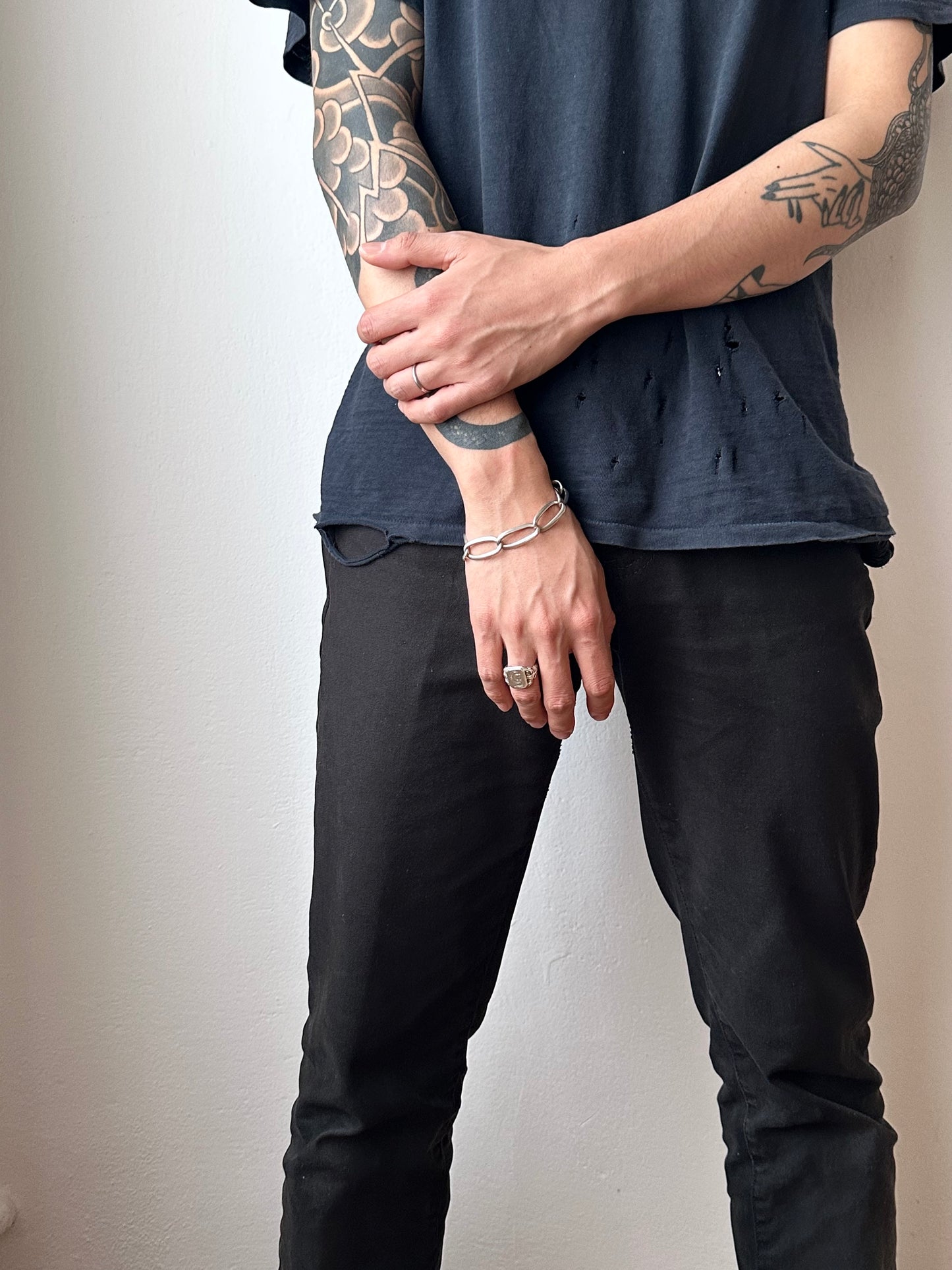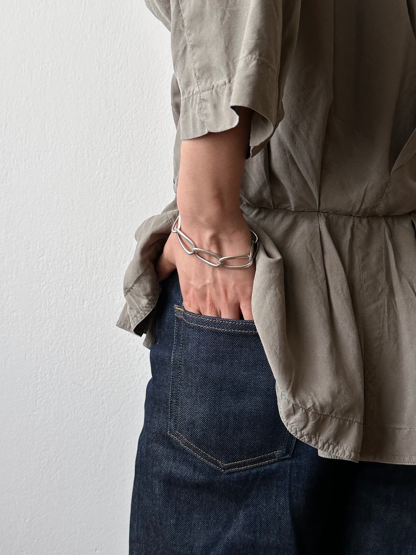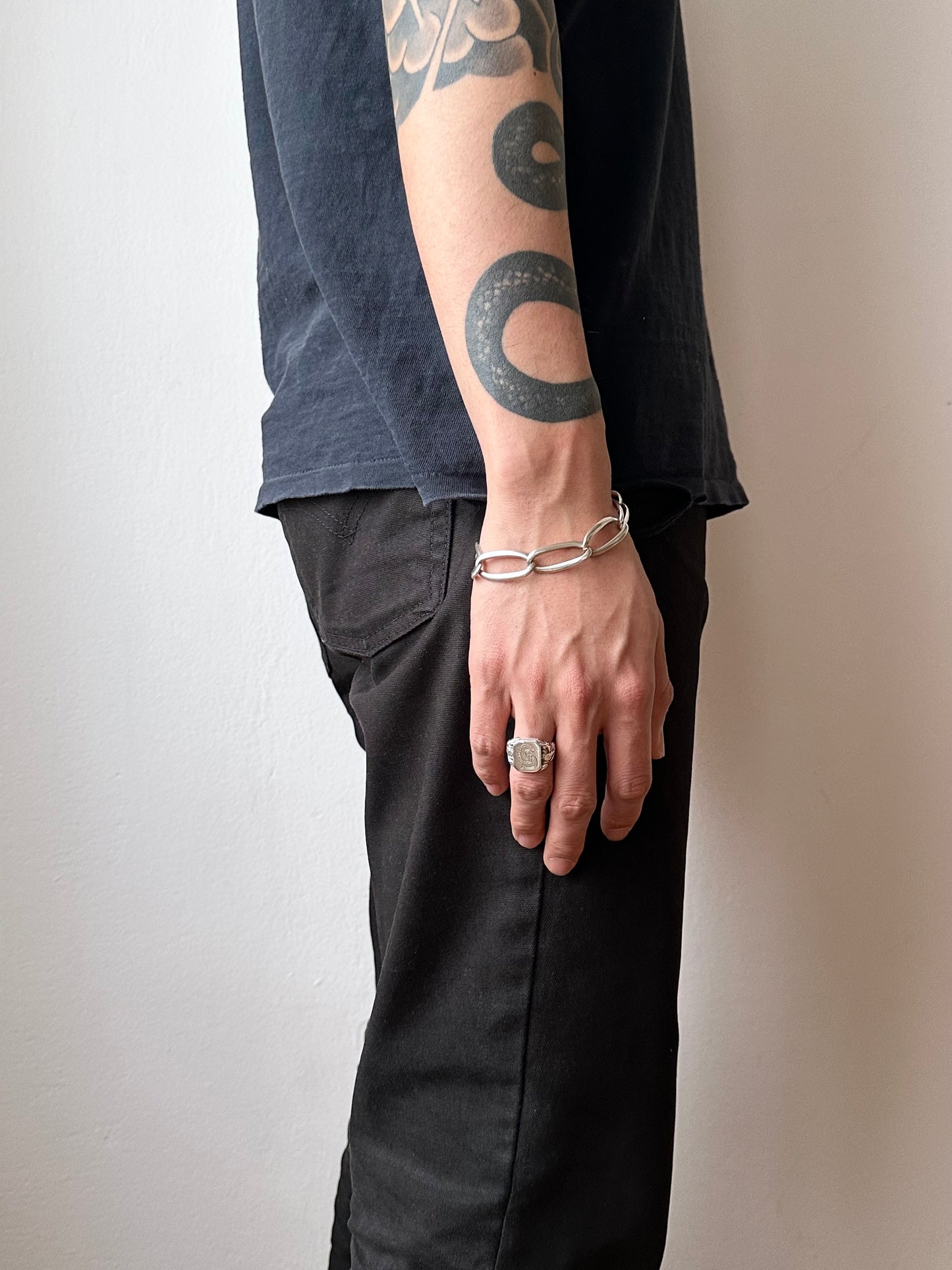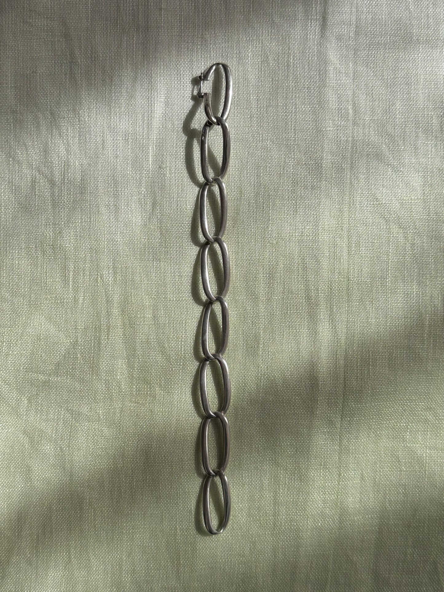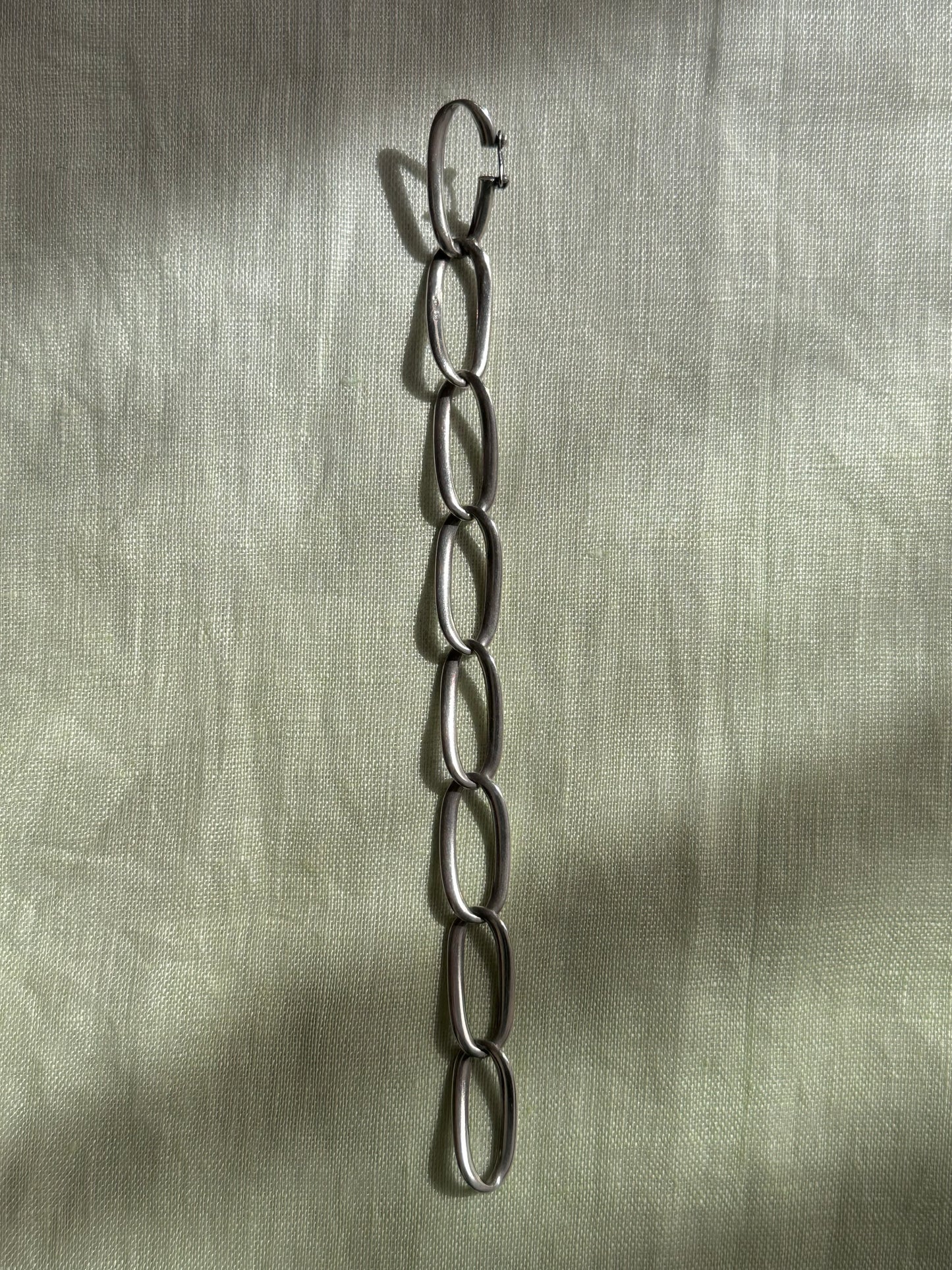 細身で大きめなオーバルパーツのチェーンは手首につけると真価を発揮します。