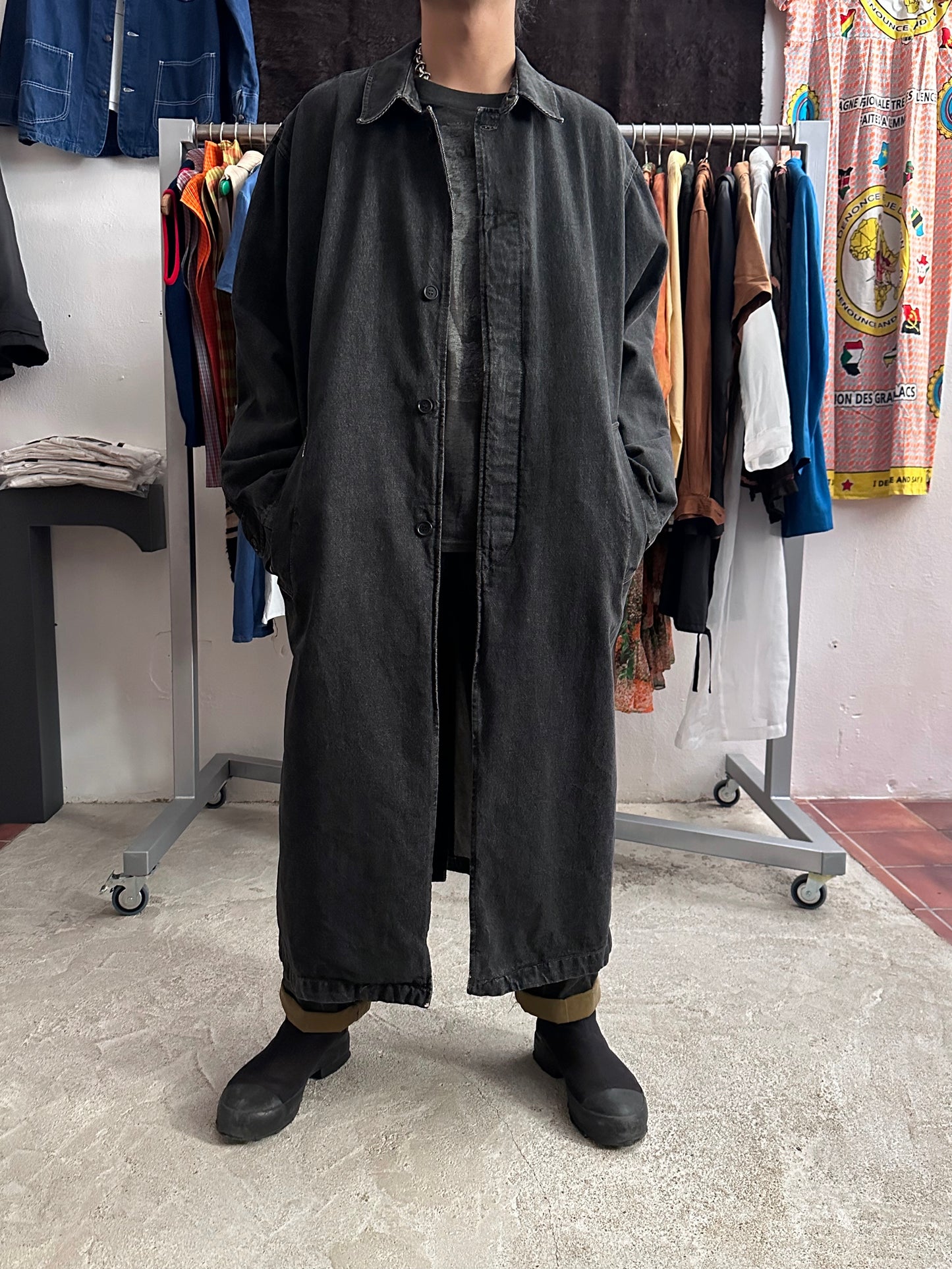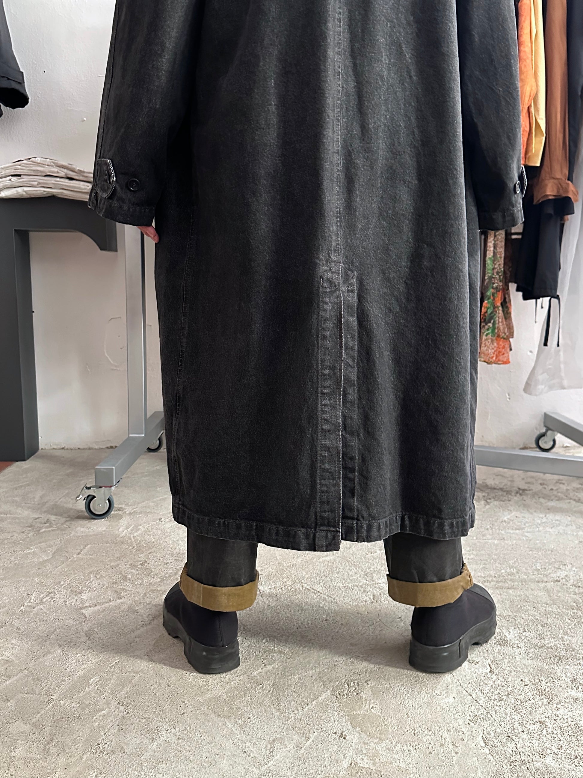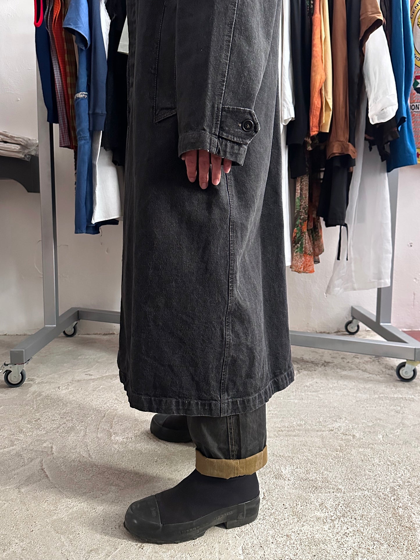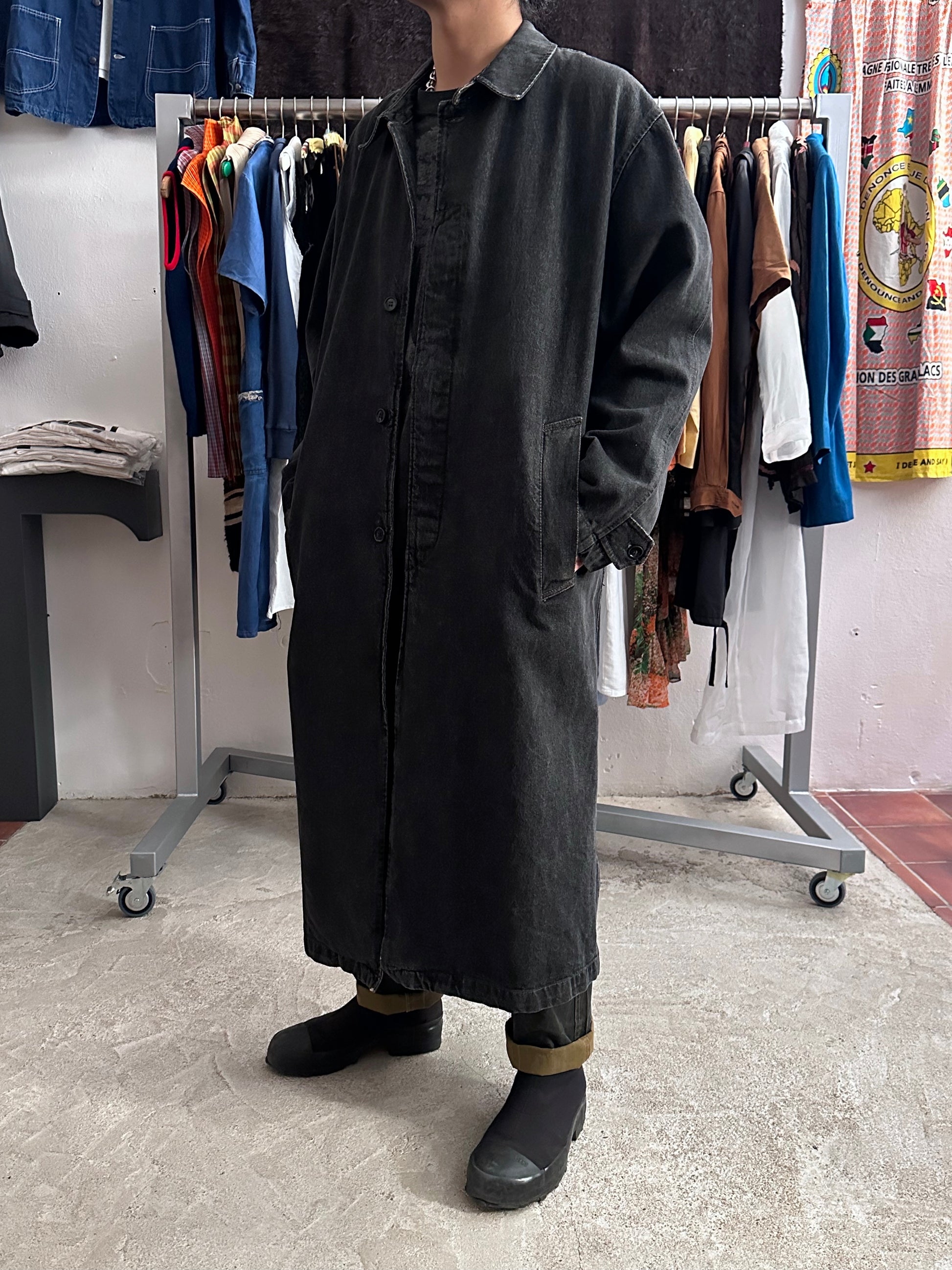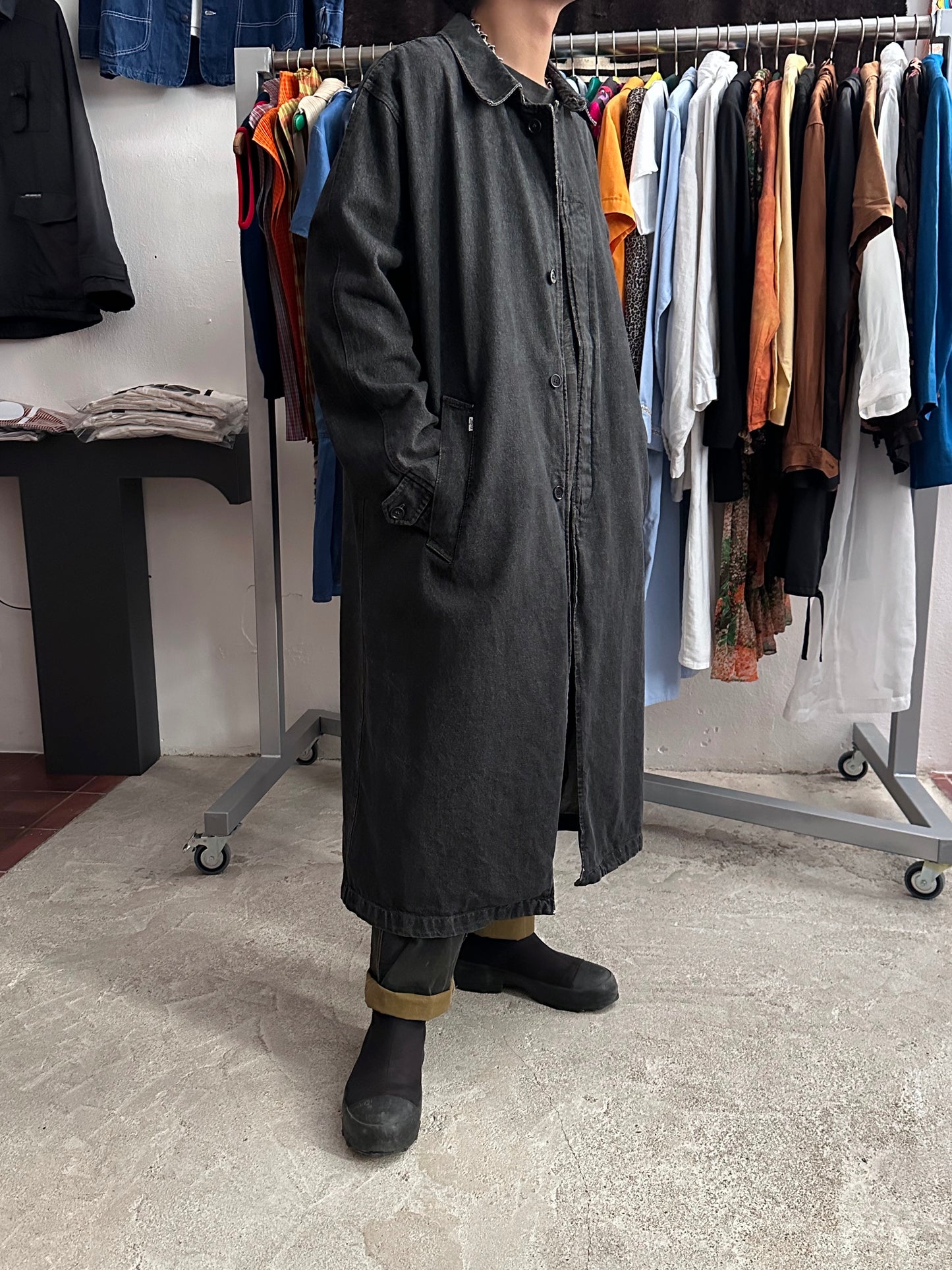 この長さでブラックデニムなのでそれなりに重さはありますが、着るとそこまで重たくありません、コート単体を手で持つと重たいです。