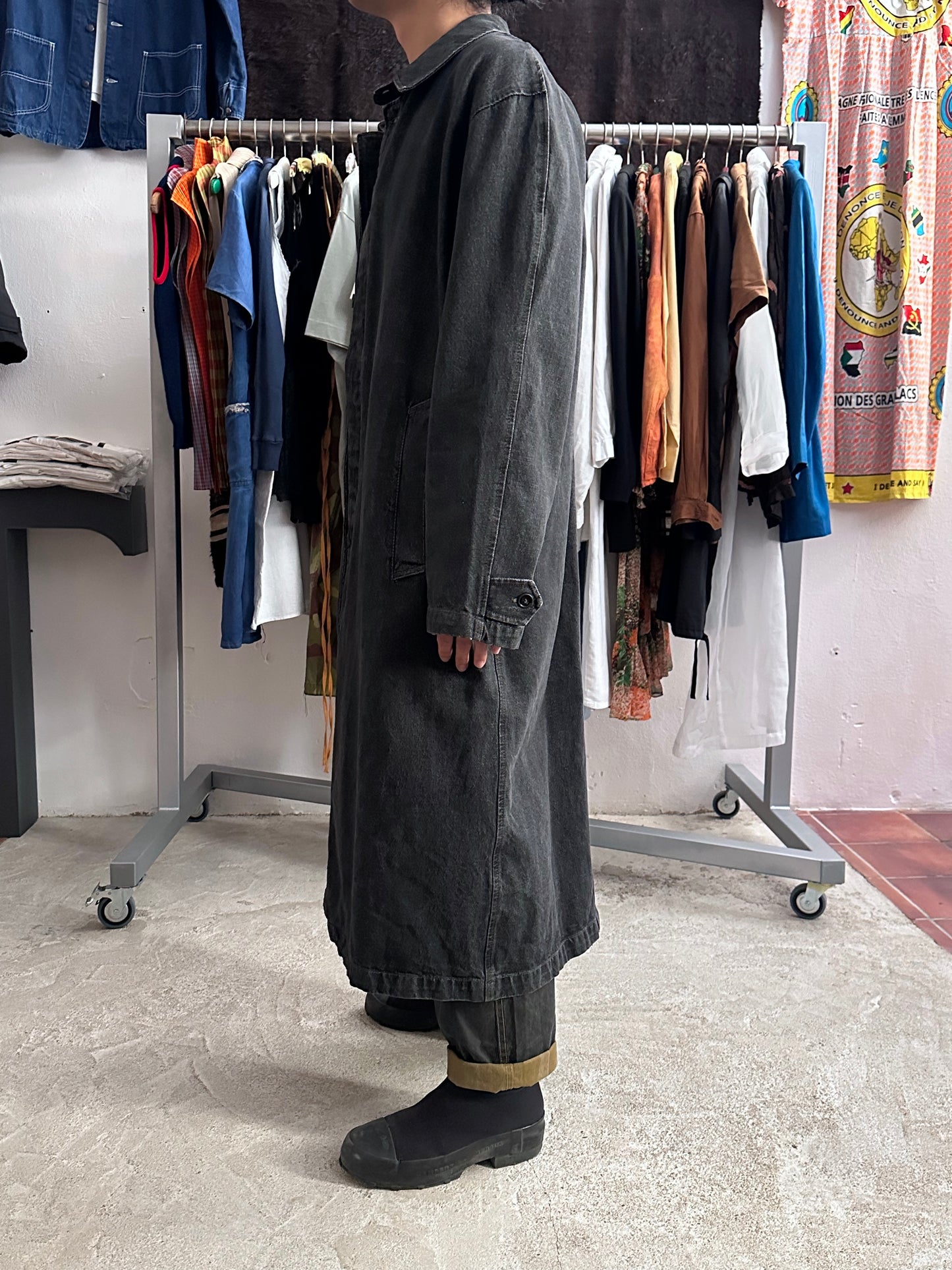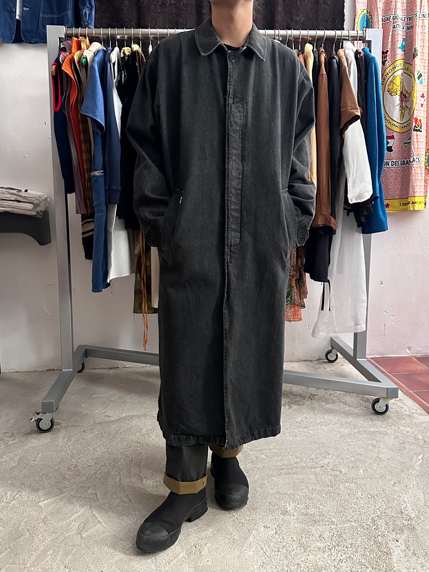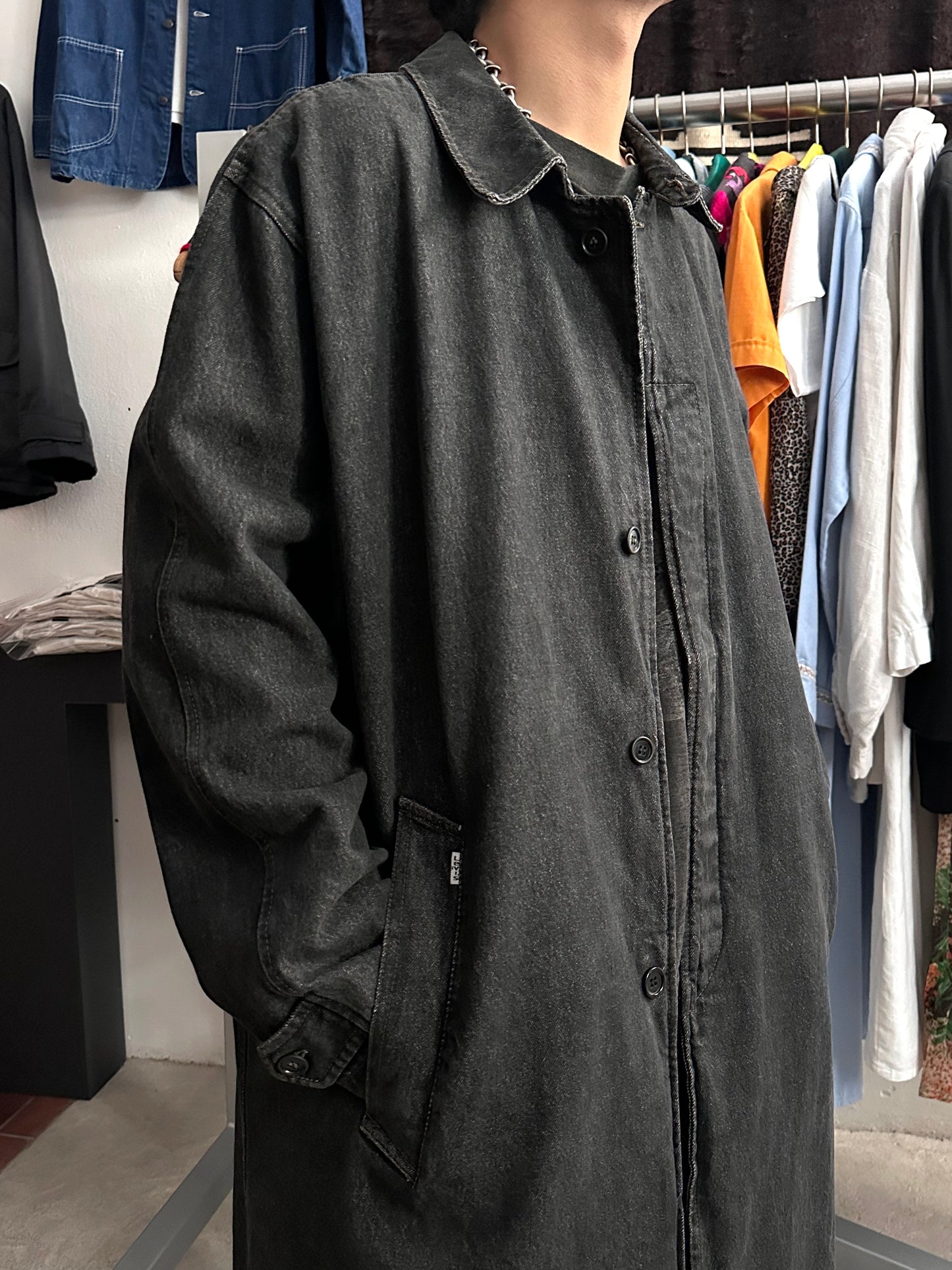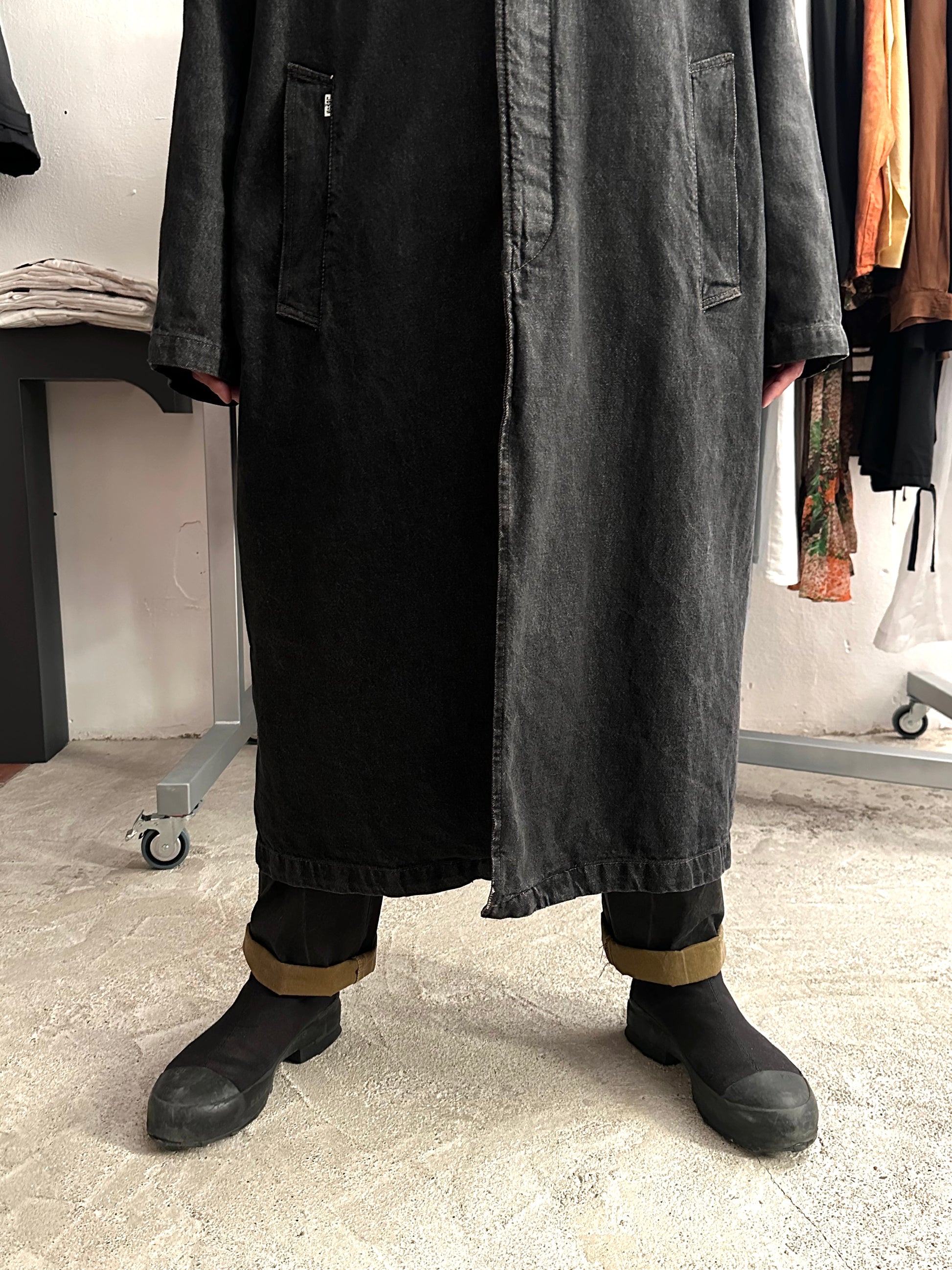 この長さでブラックデニムなのでそれなりに重さはありますが、着るとそこまで重たくありません、コート単体を手で持つと重たいです。