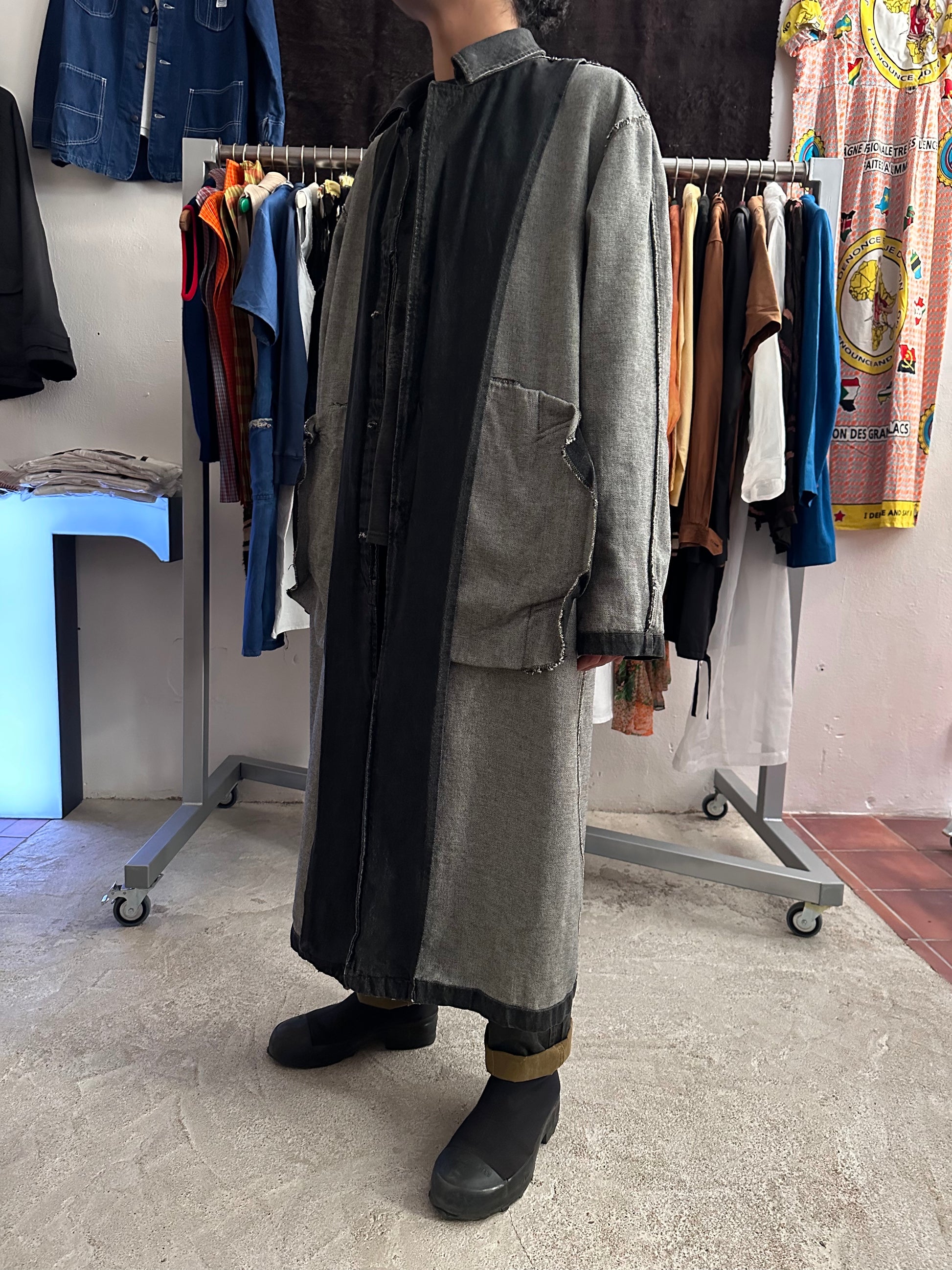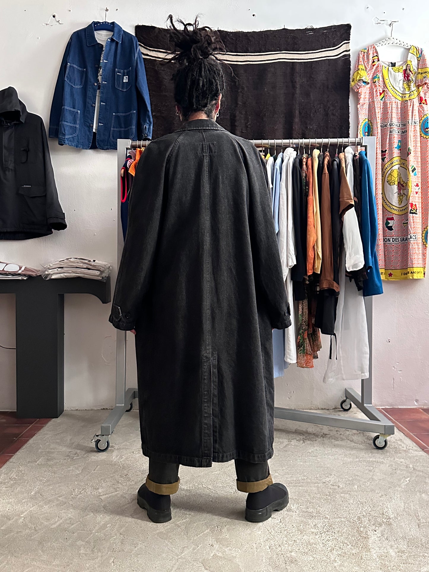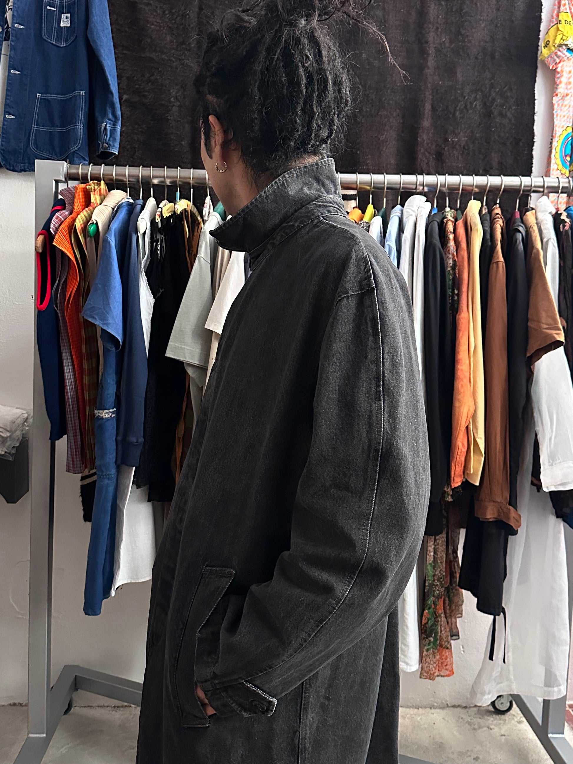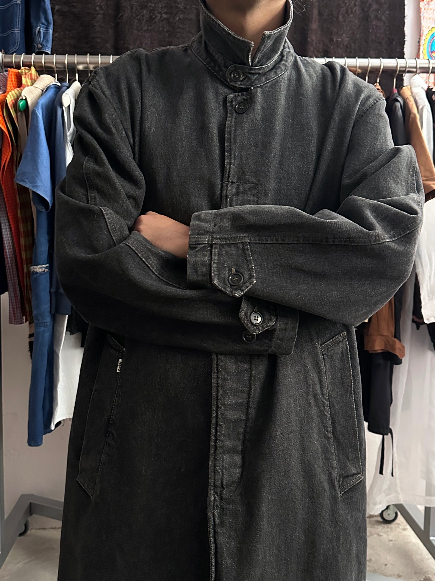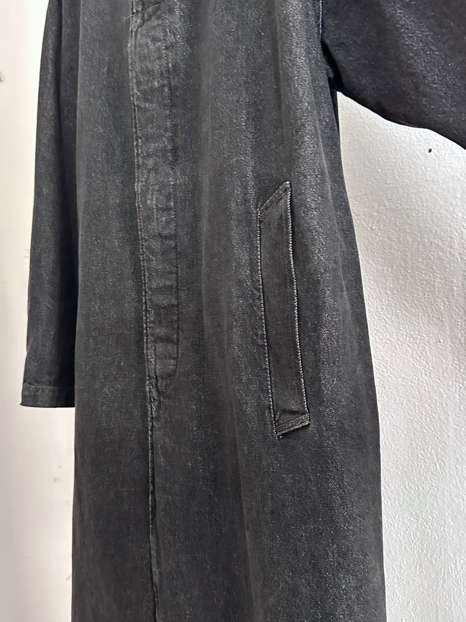 この長さでブラックデニムなのでそれなりに重さはありますが、着るとそこまで重たくありません、コート単体を手で持つと重たいです。