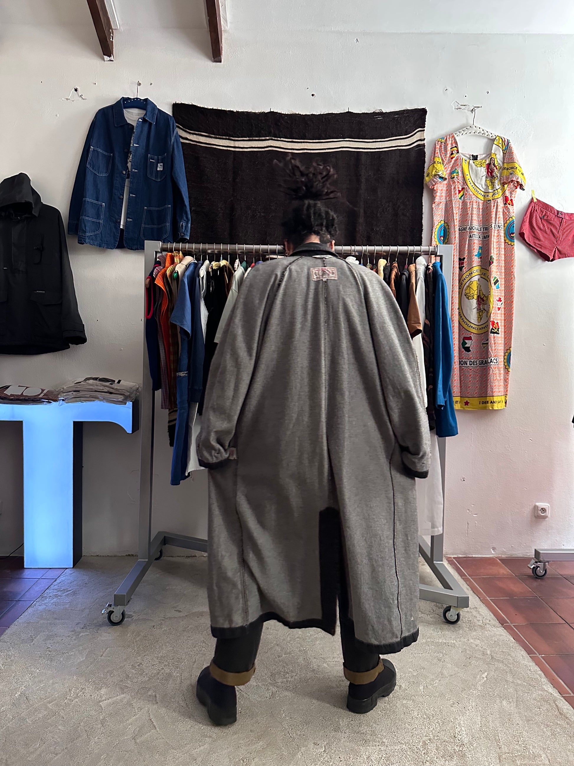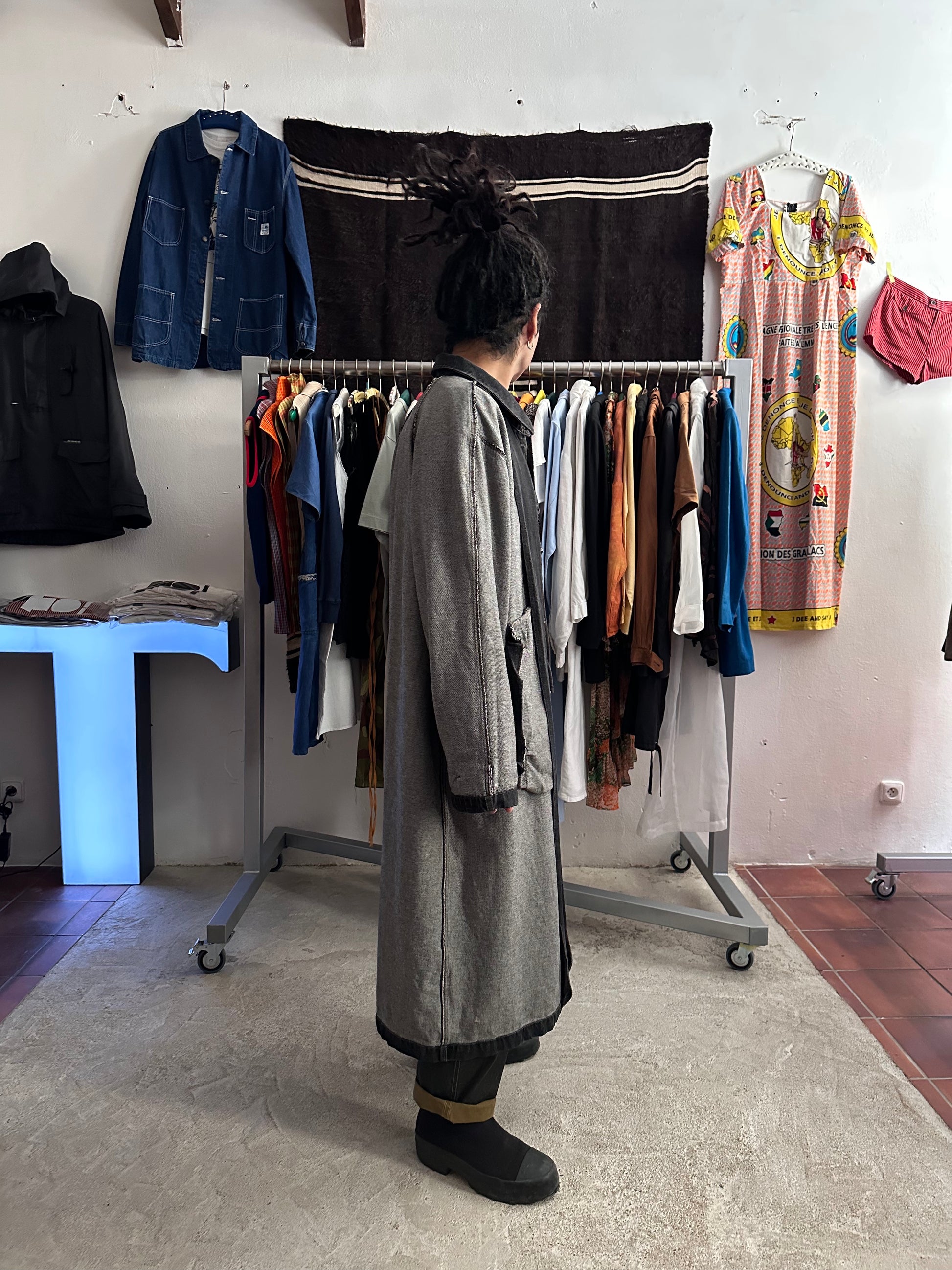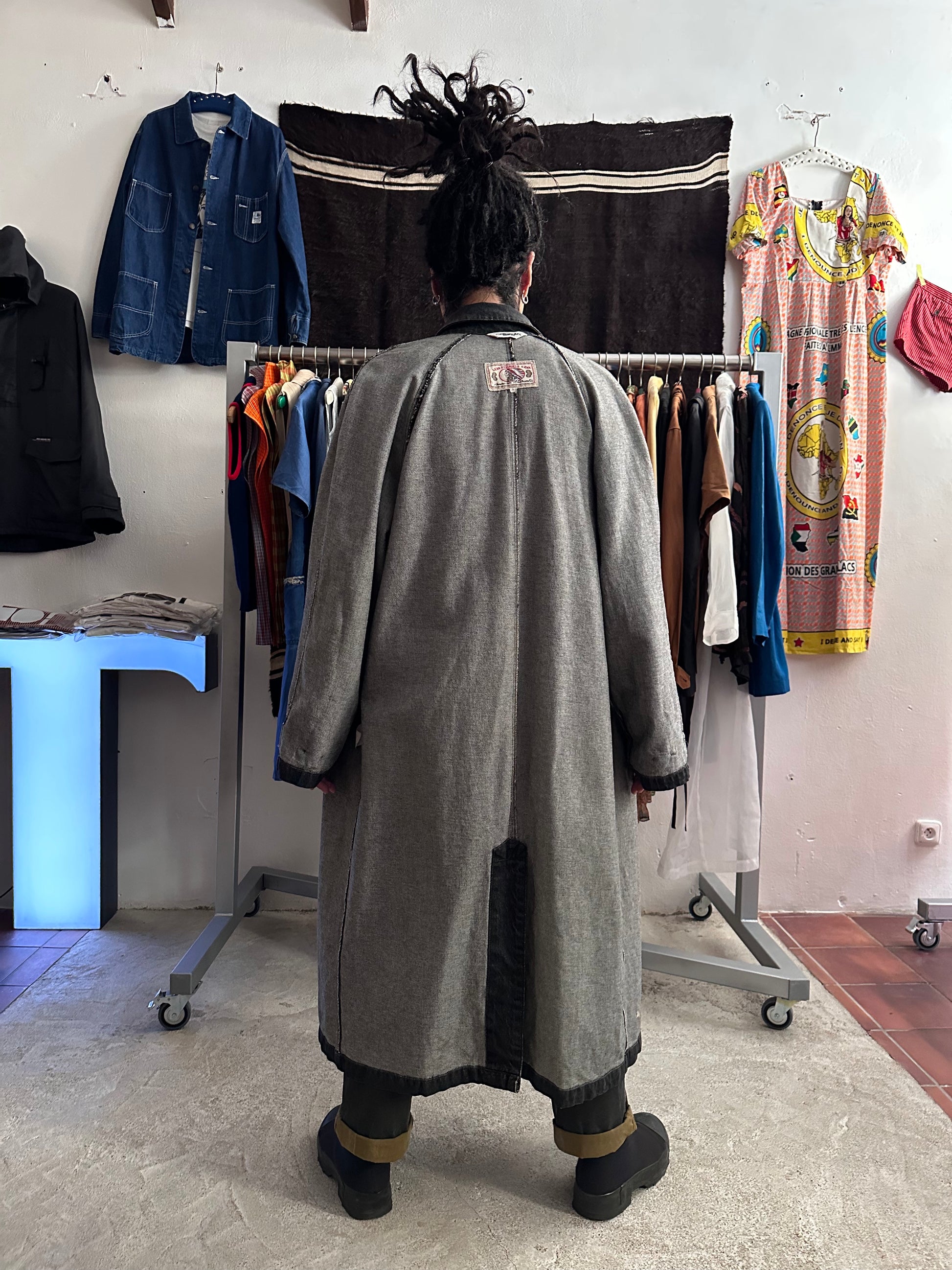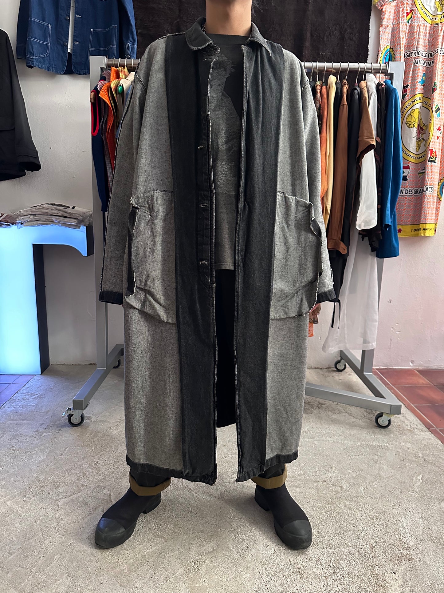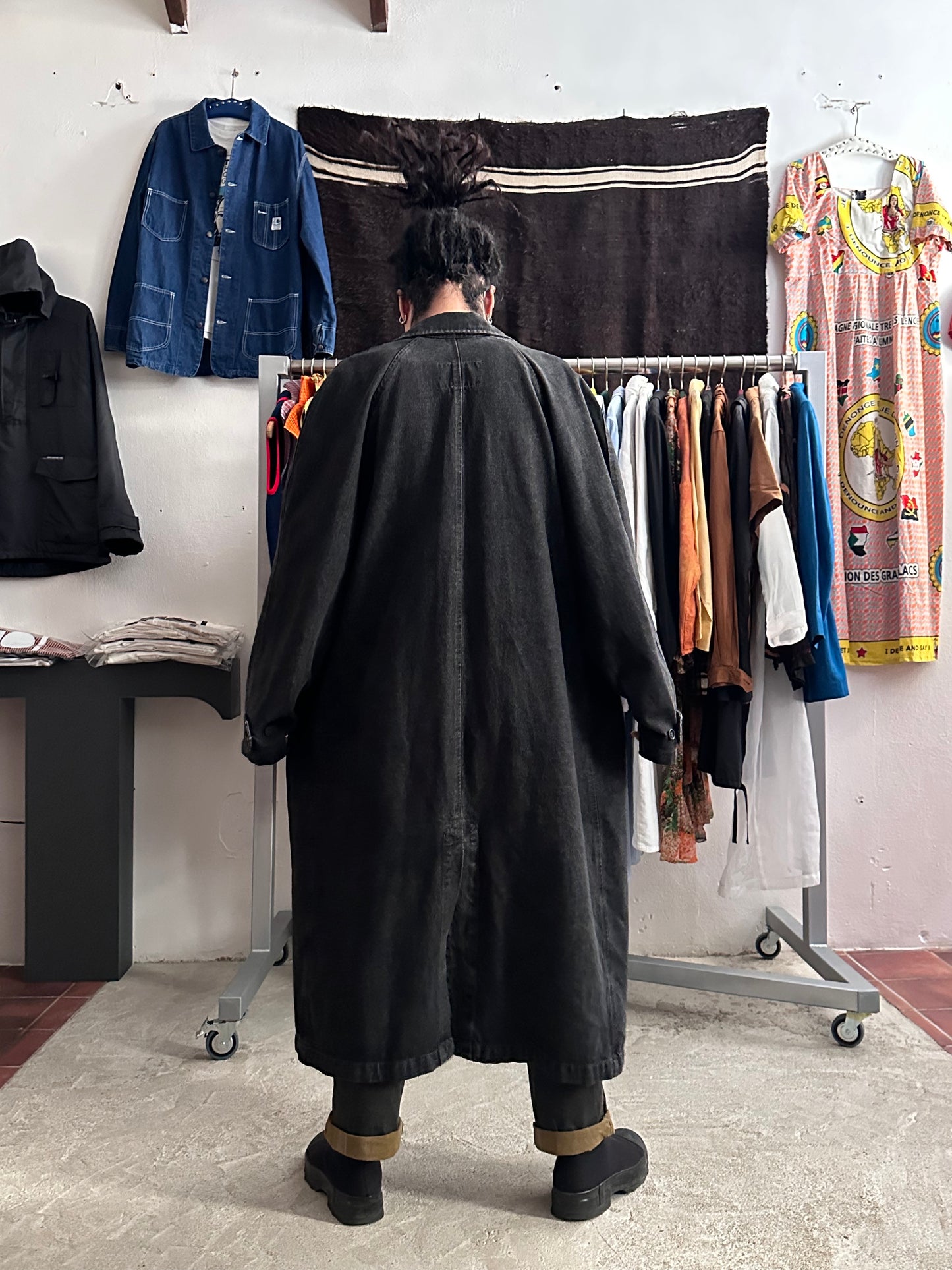 この長さでブラックデニムなのでそれなりに重さはありますが、着るとそこまで重たくありません、コート単体を手で持つと重たいです。