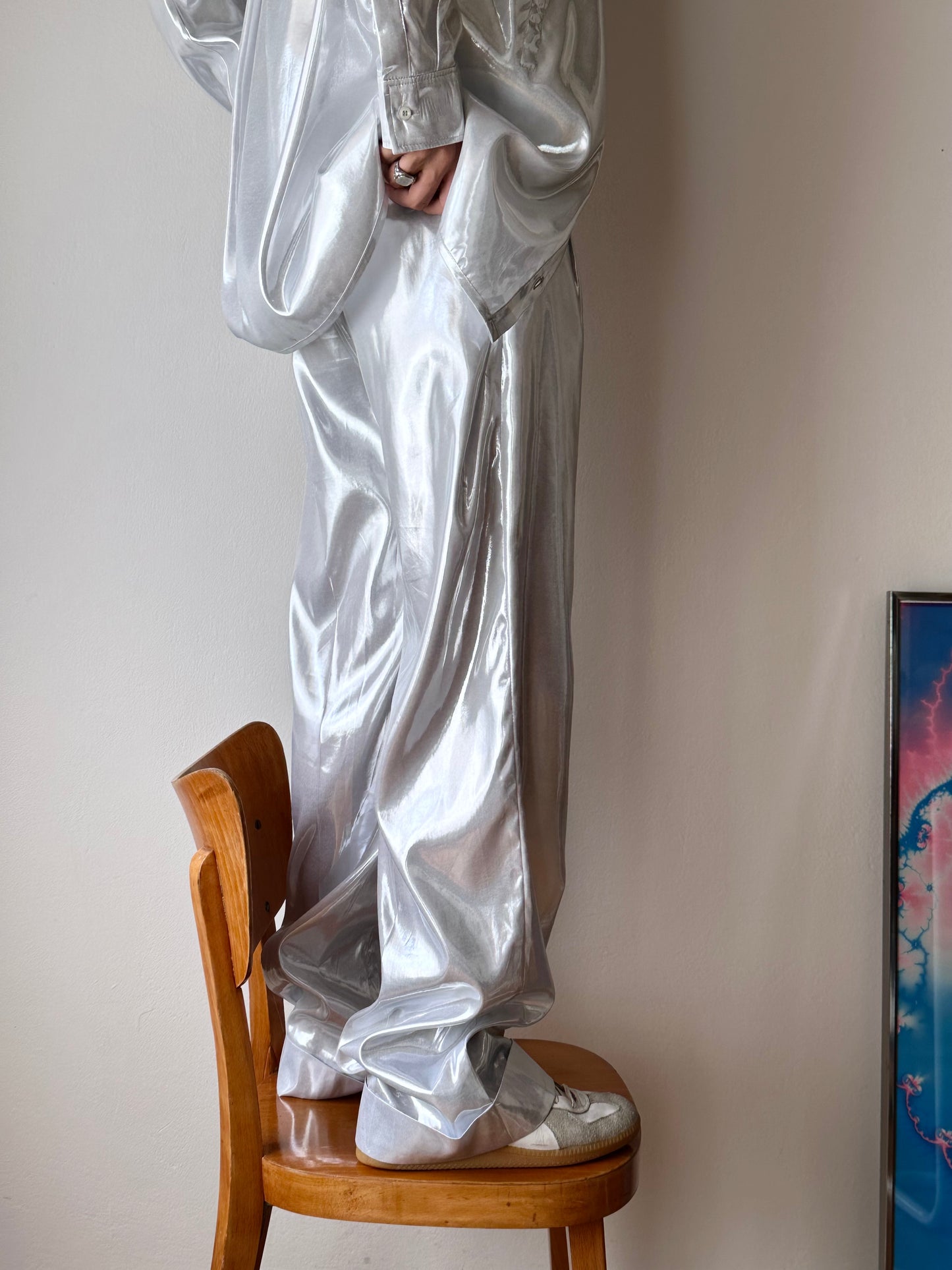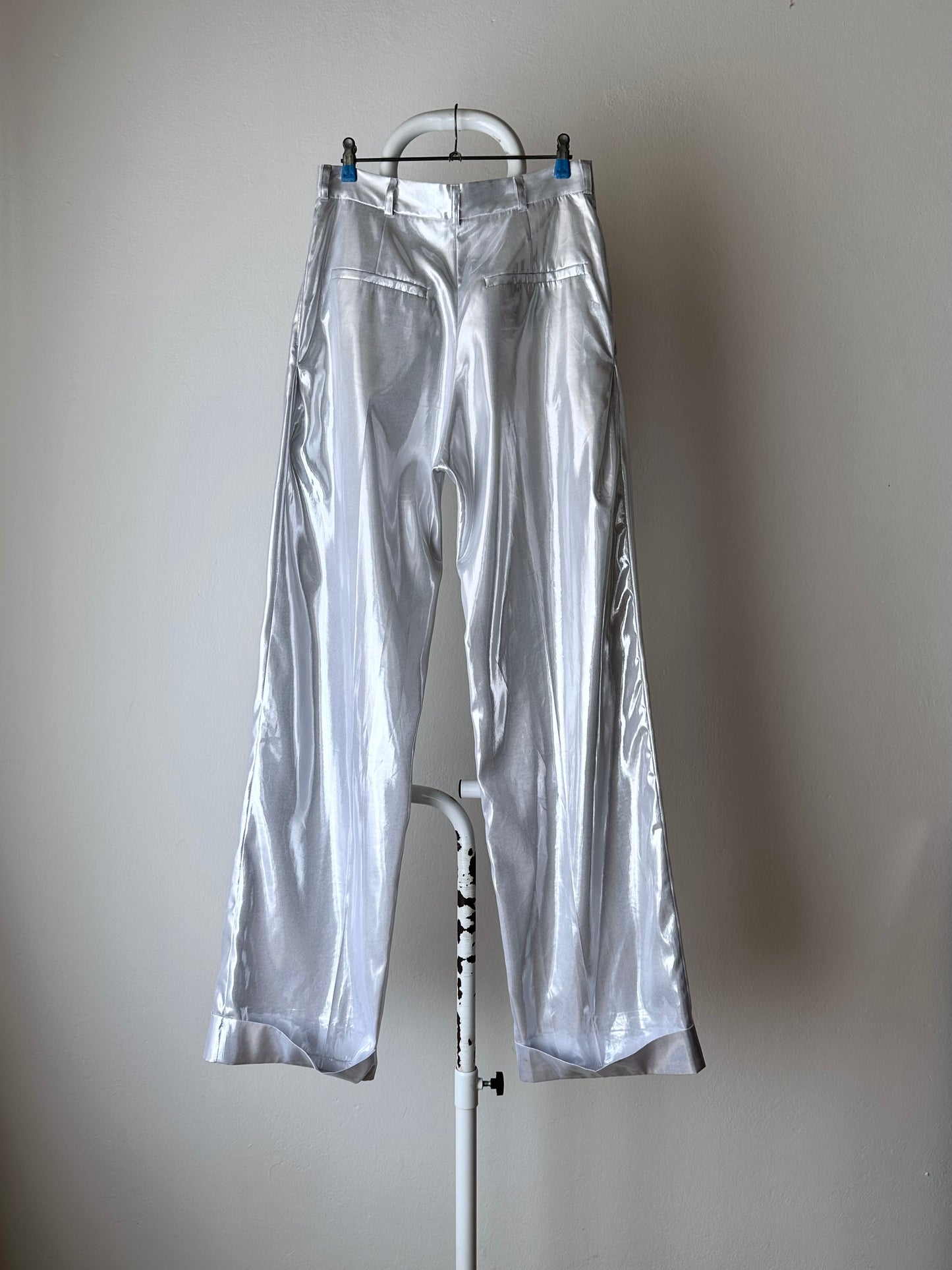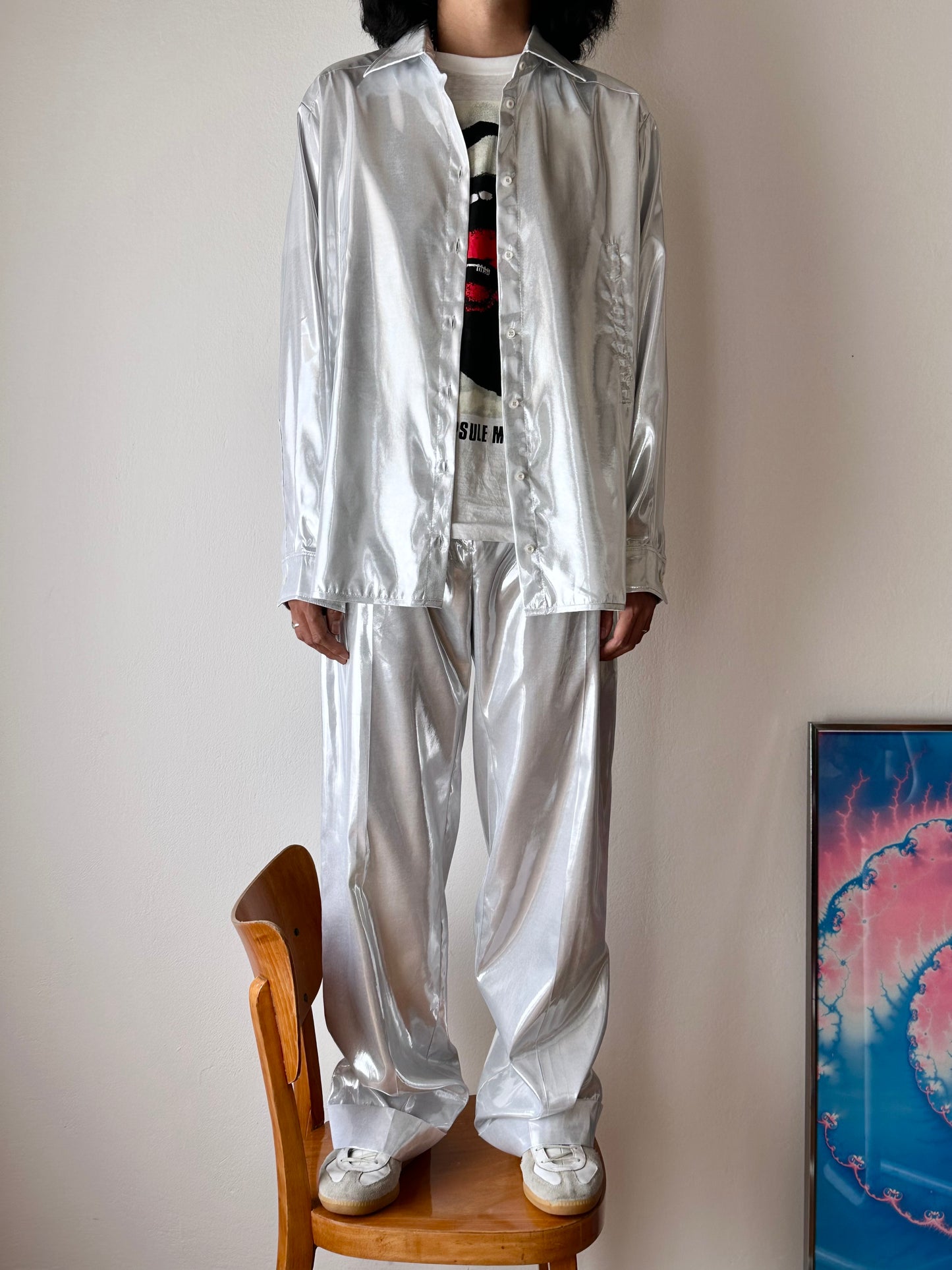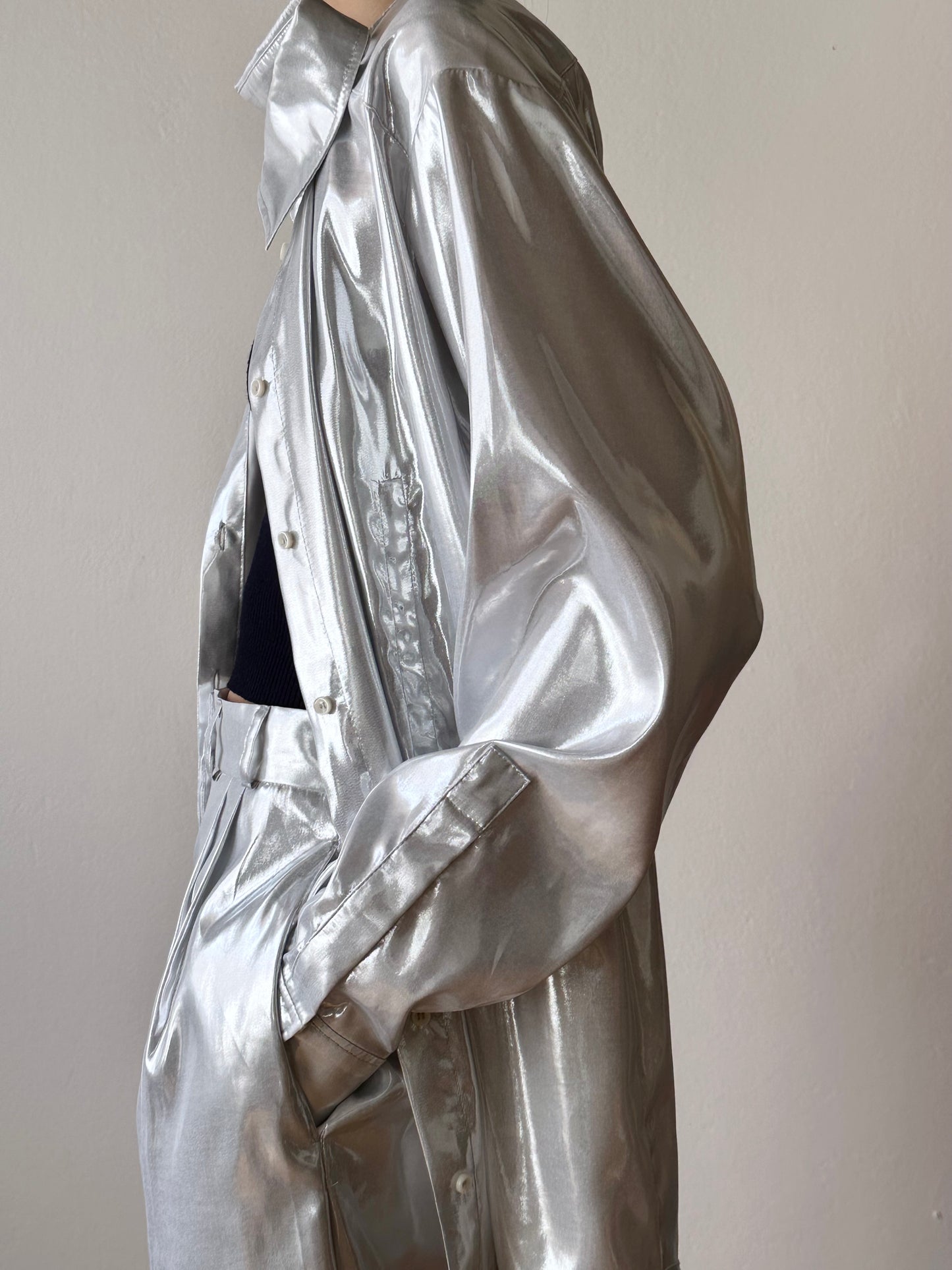 メタリックホワイトのセットアップスーツ。
