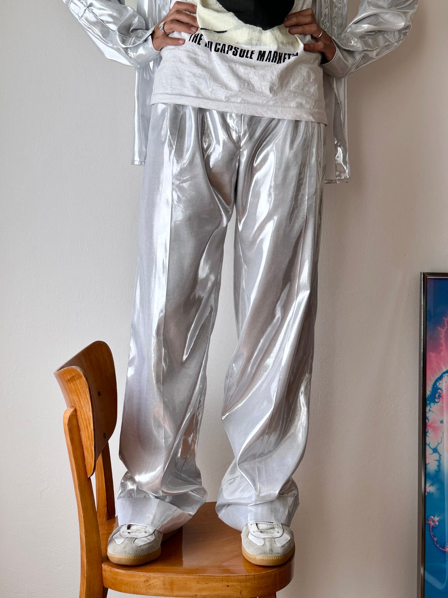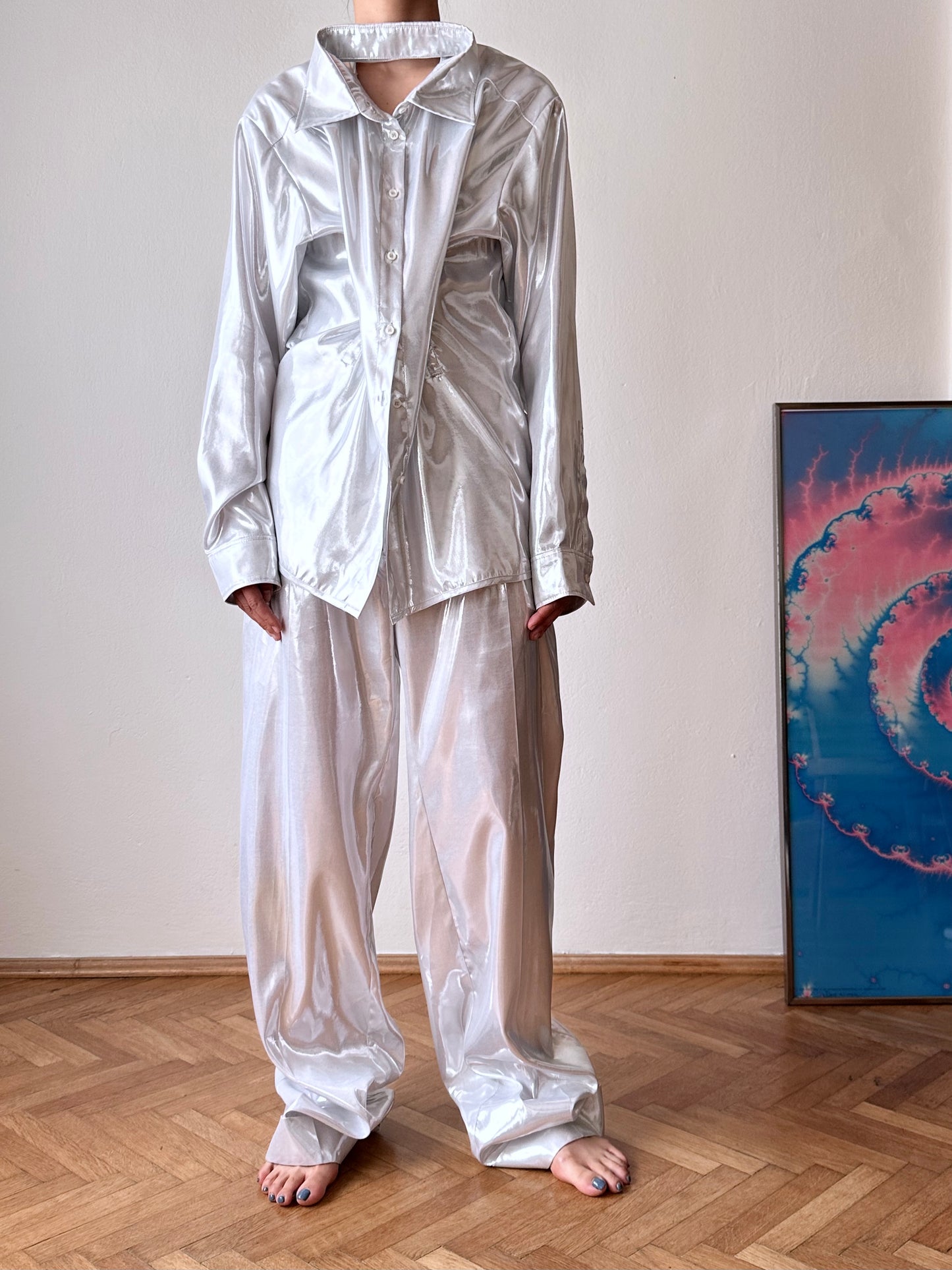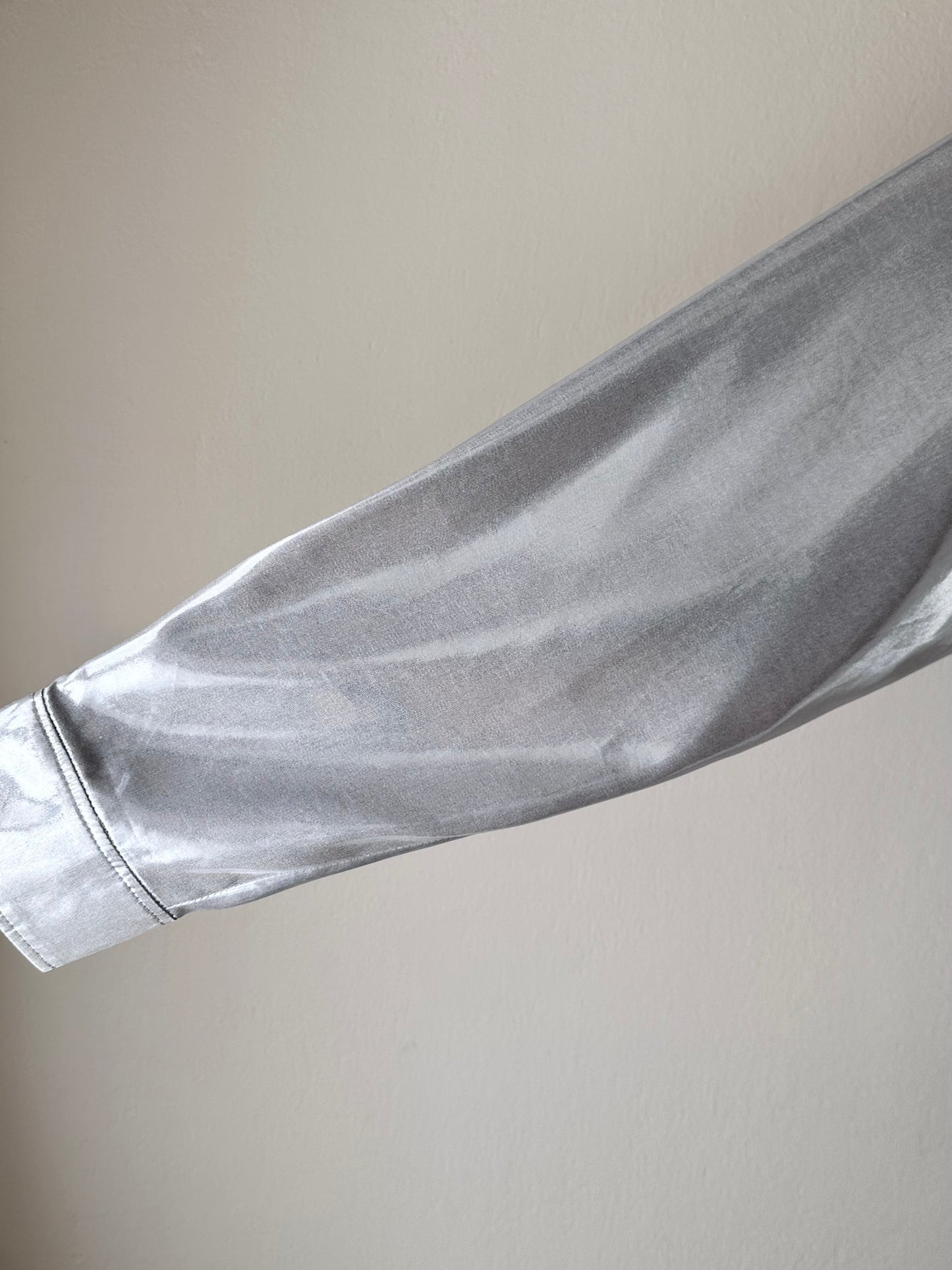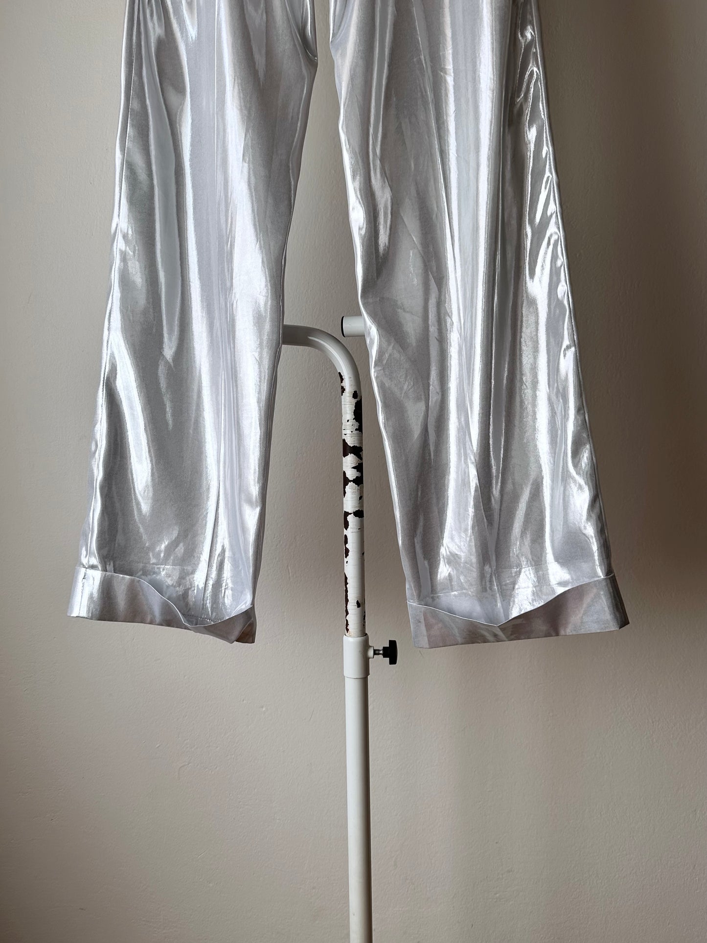 メタリックホワイトのセットアップスーツ。