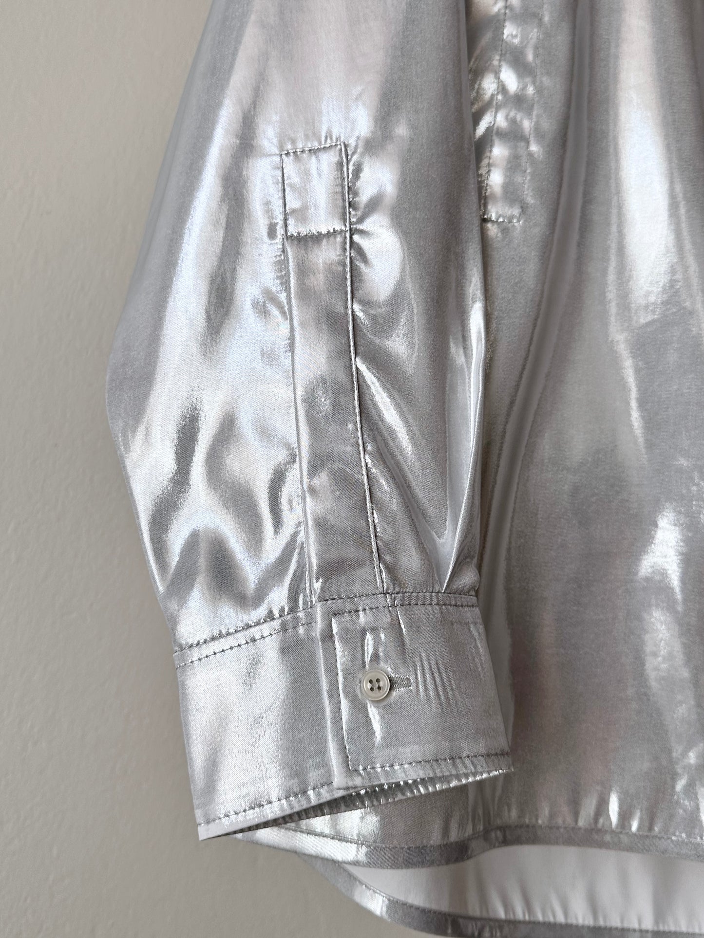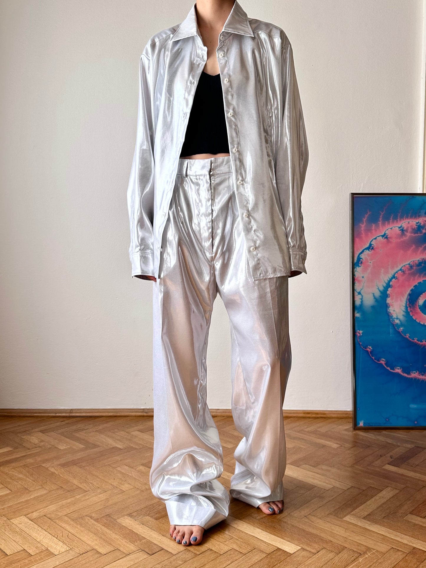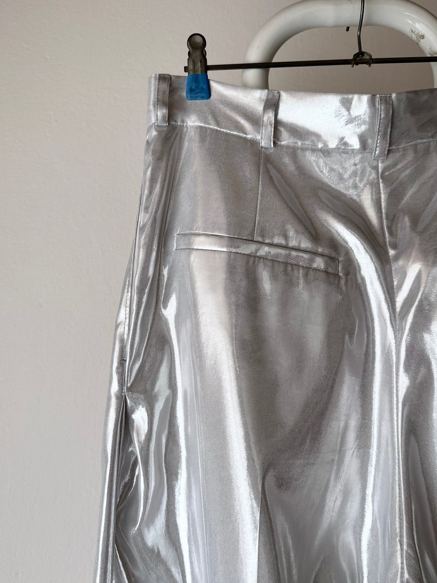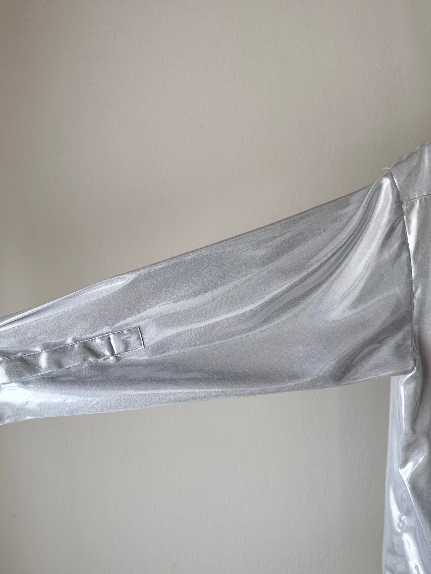 メタリックホワイトのセットアップスーツ。