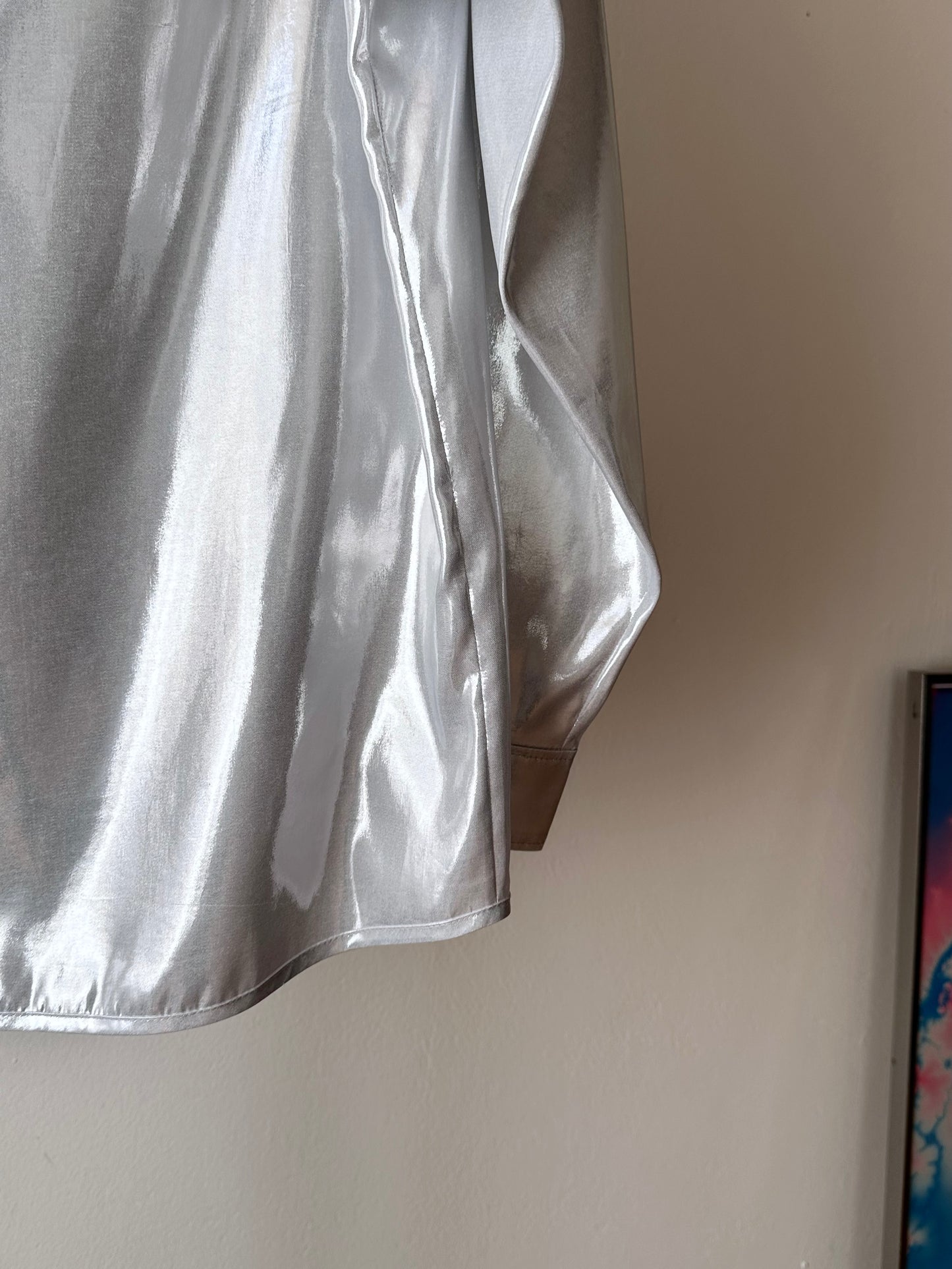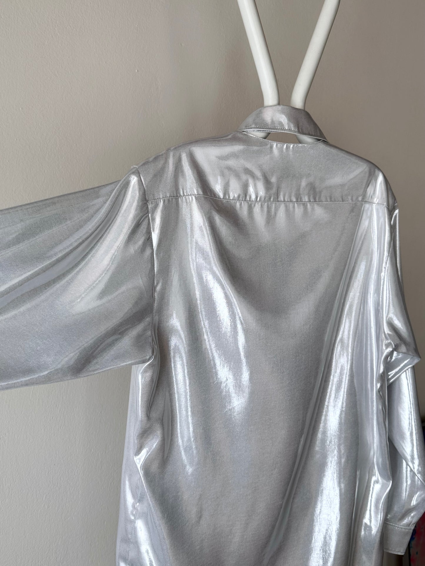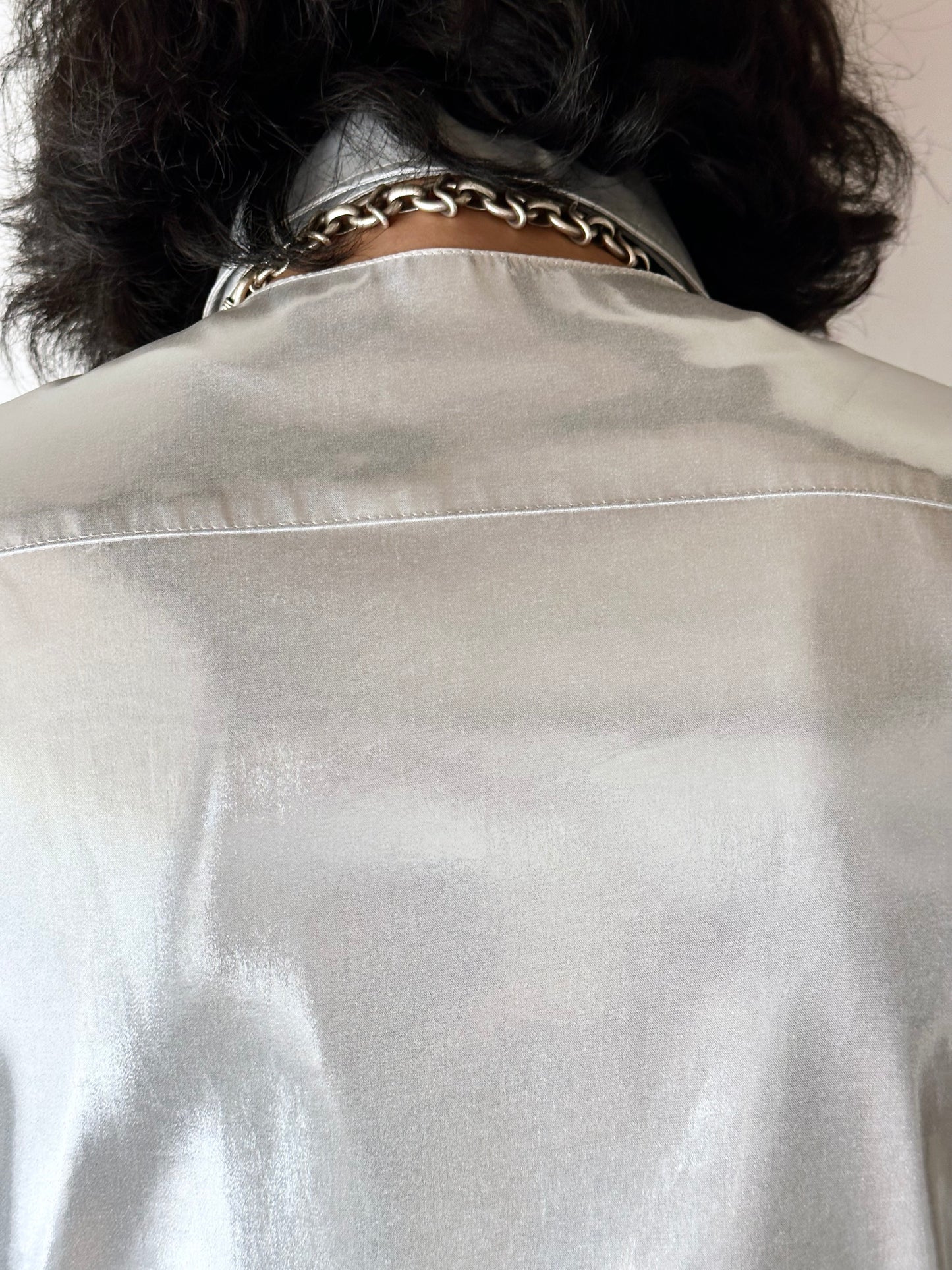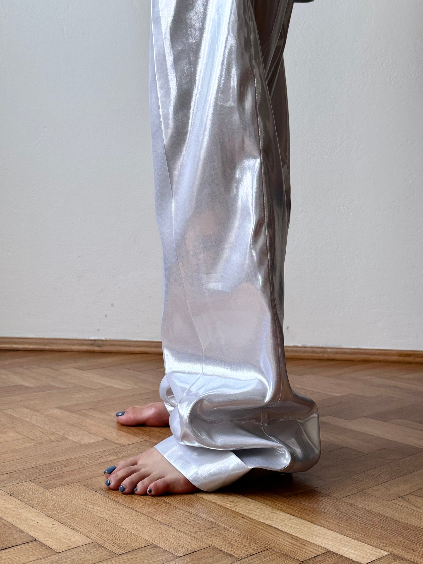 メタリックホワイトのセットアップスーツ。