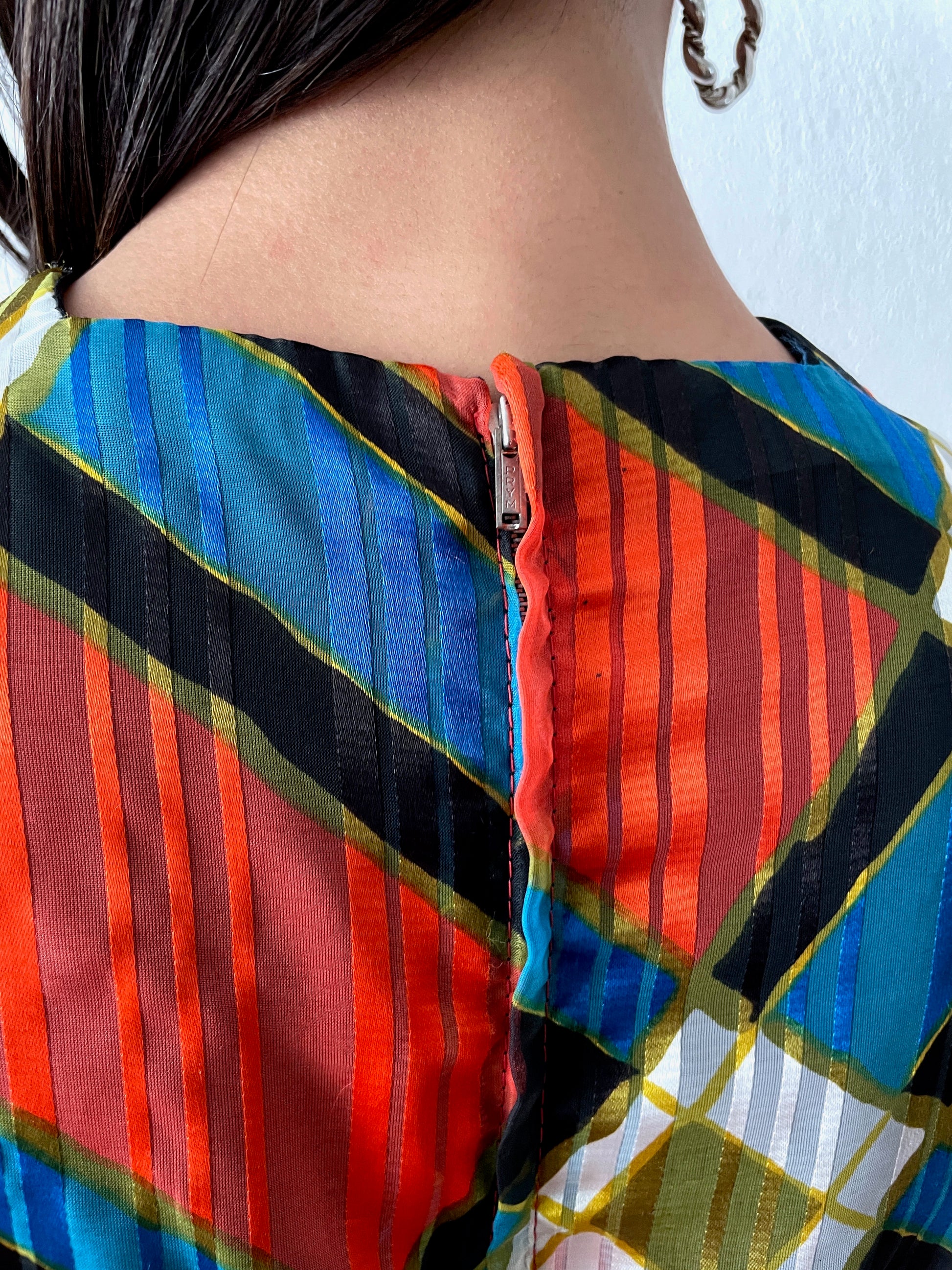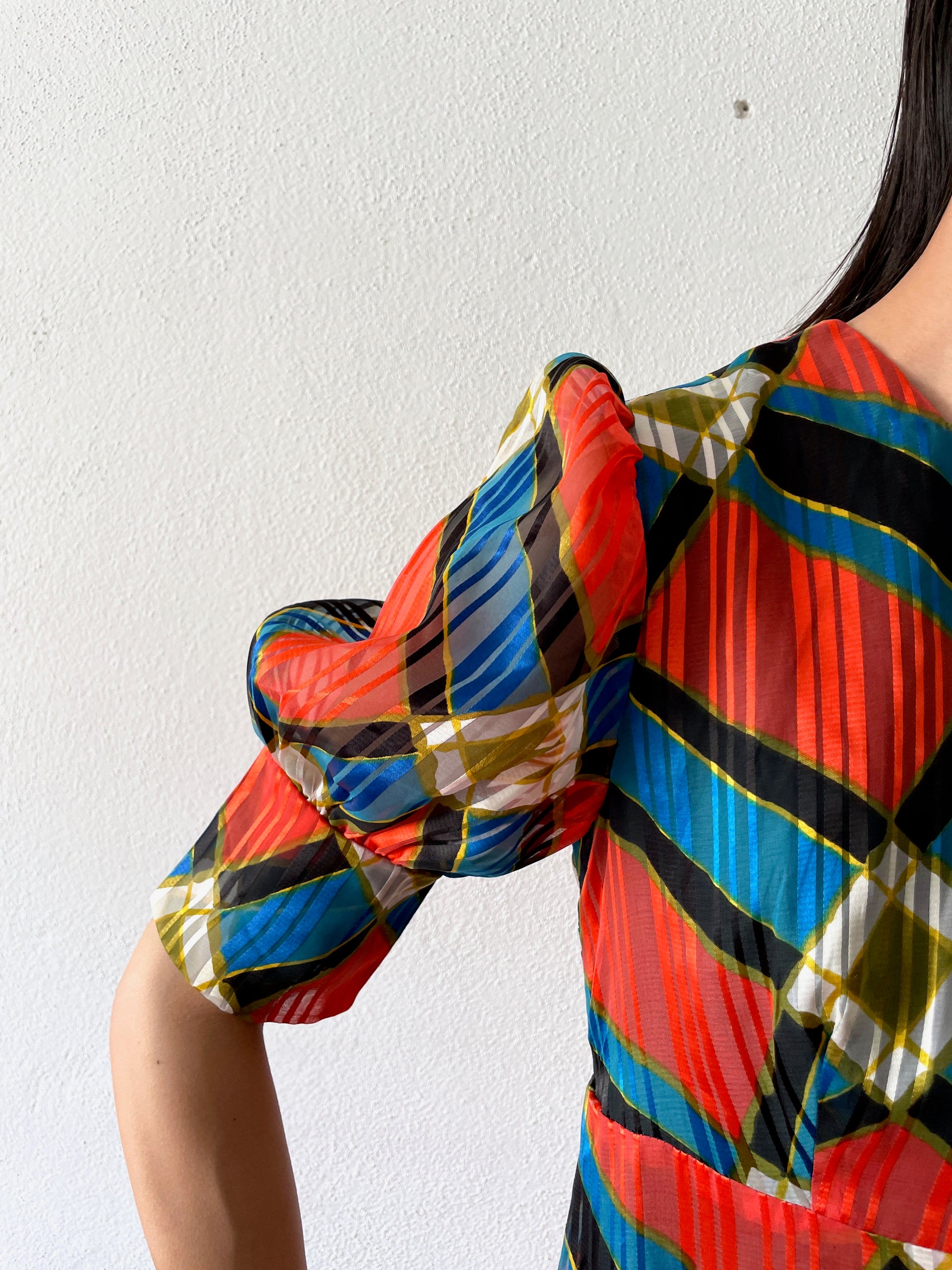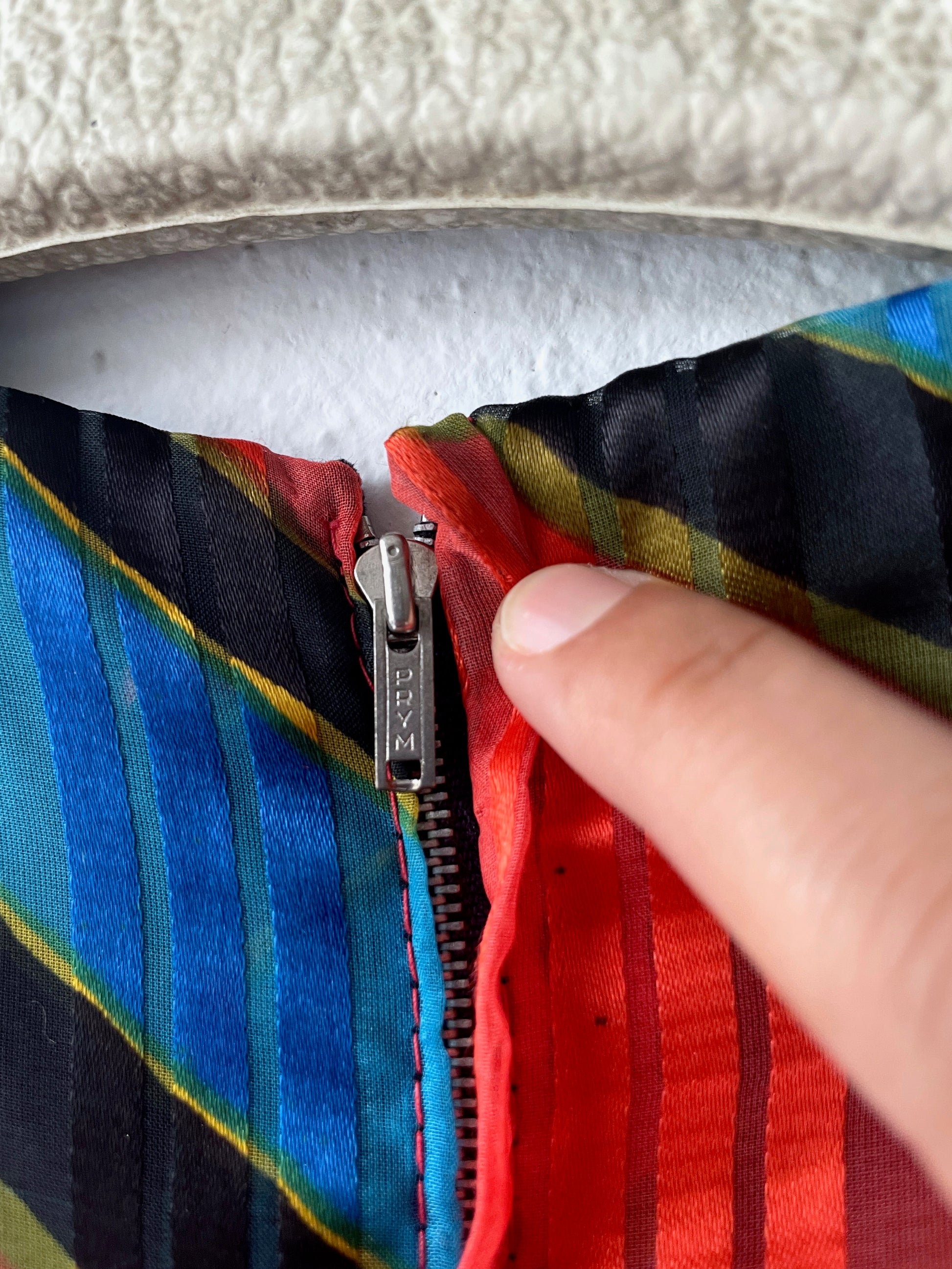 Material - 素材 表記ありませんが、silkとpolyesterのような柔らかなさらりとした素材で、シースルーのストライプのような生地です。中におそらくPolyesterのペチコート付です。