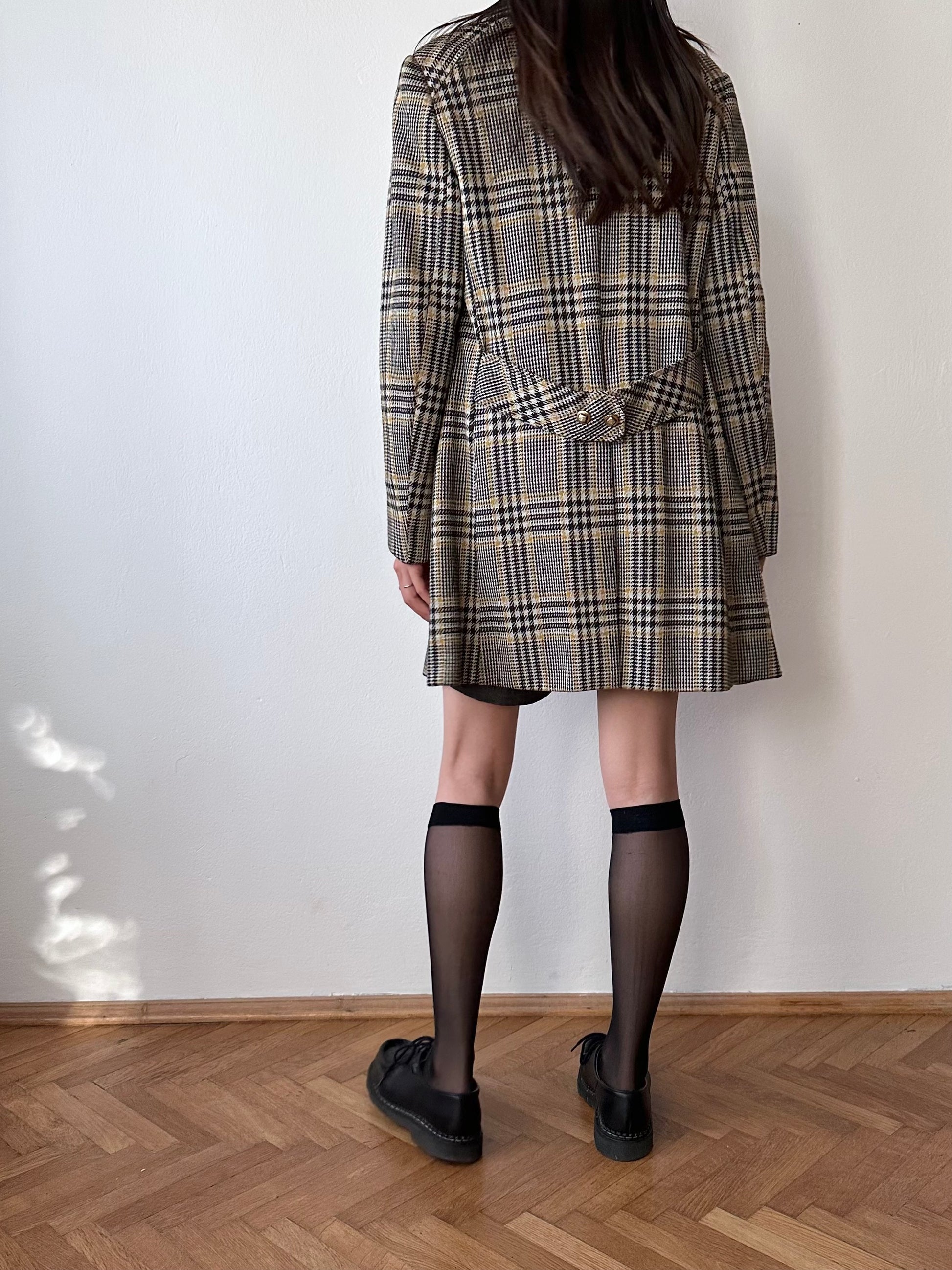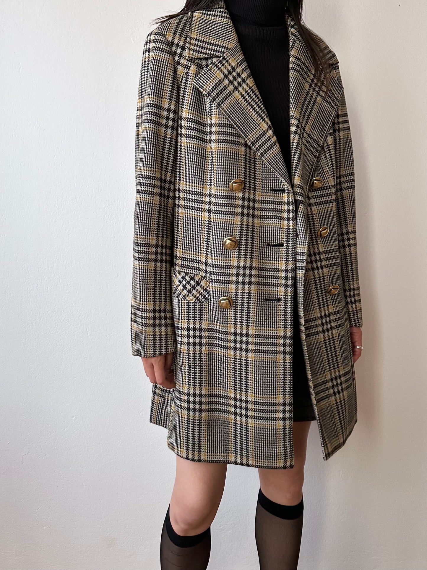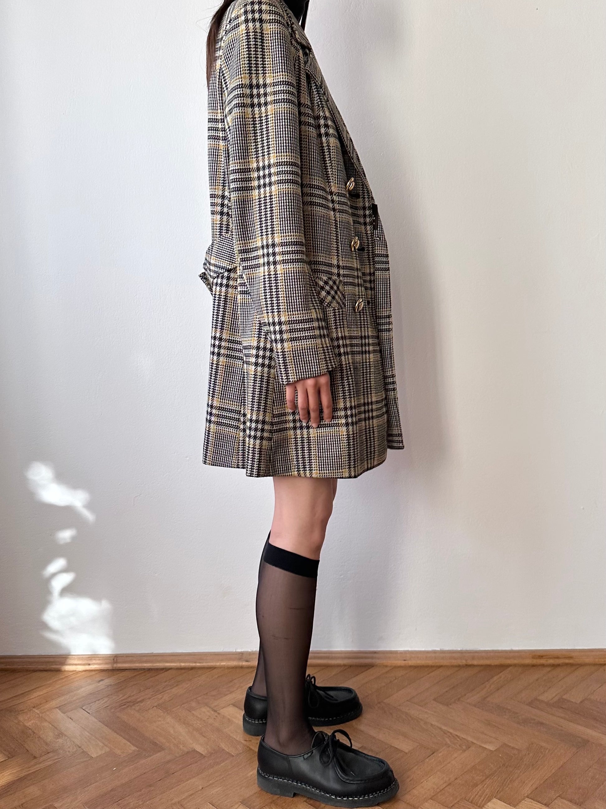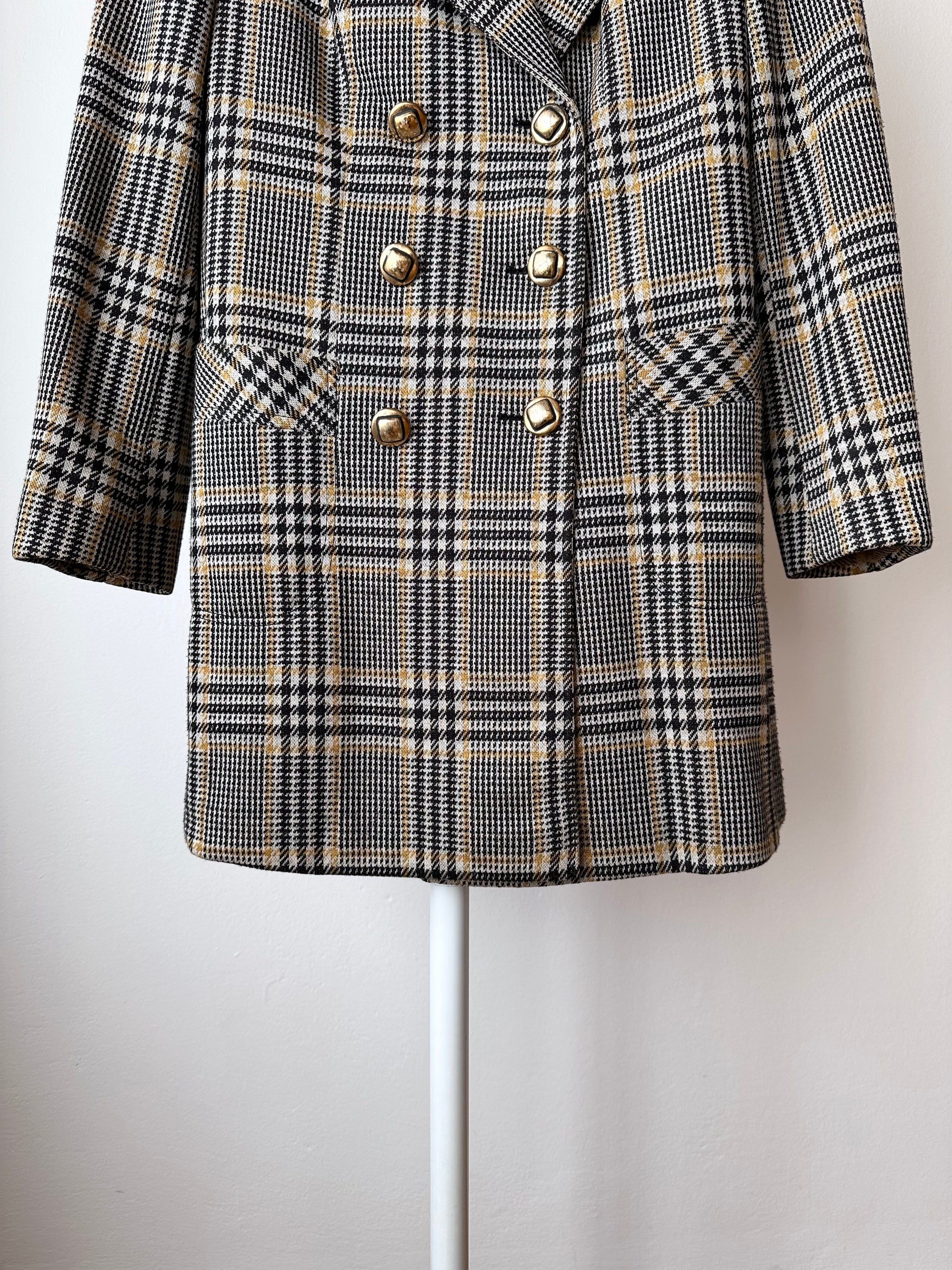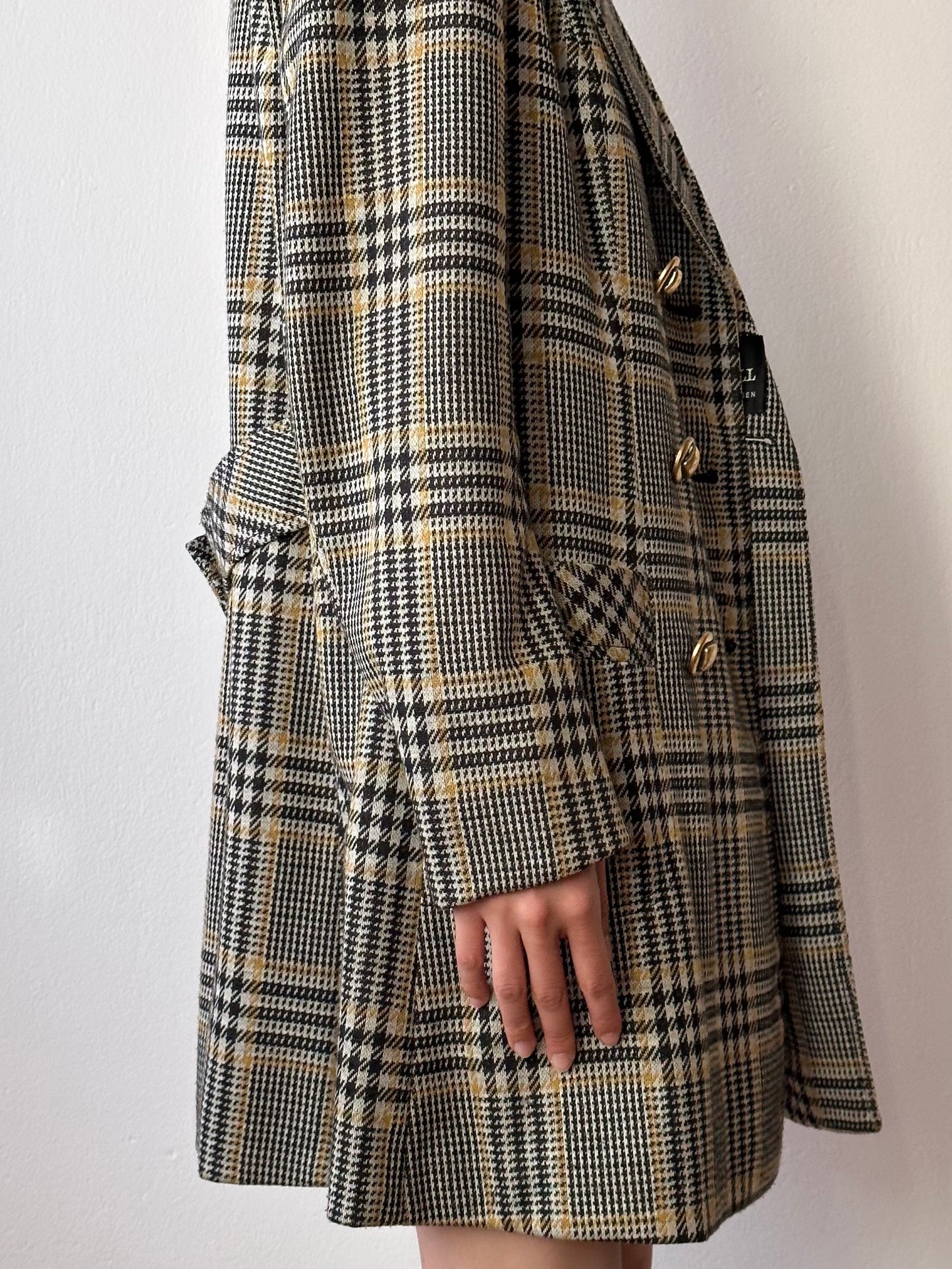 色味の素敵なチェック柄に金のボタン、少し長めの着丈の美しいシルエット、質の良い素材にテーラリング、どこをとっても完璧です。涙