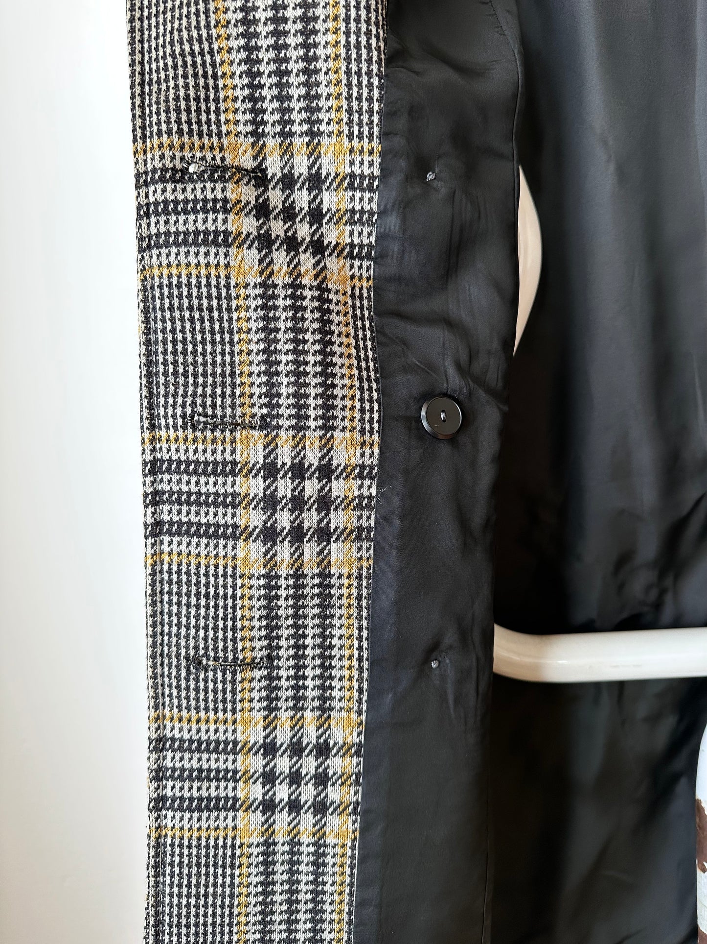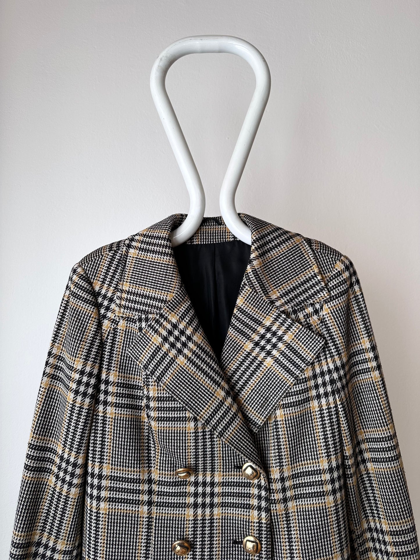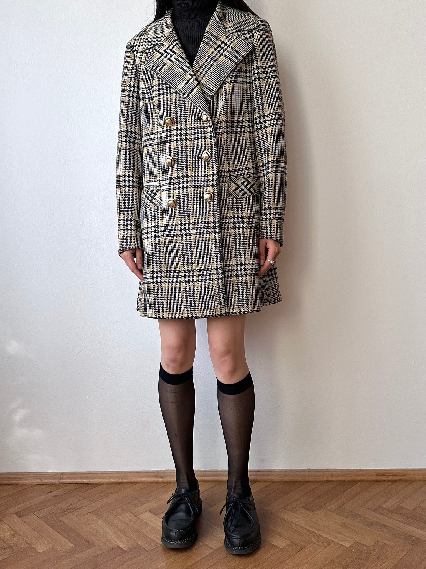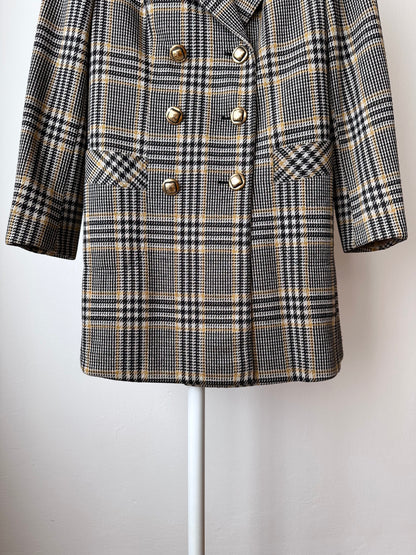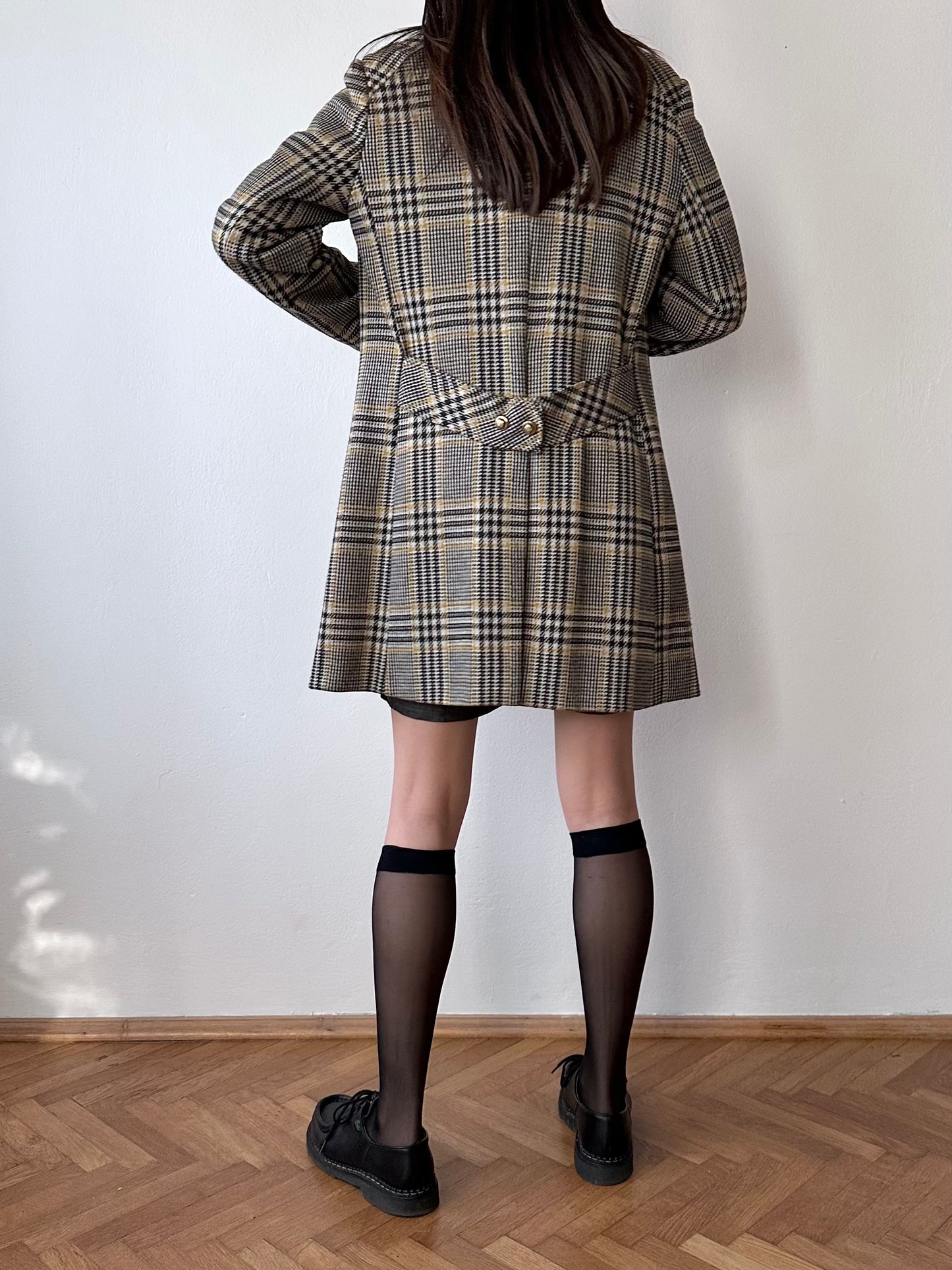 色味の素敵なチェック柄に金のボタン、少し長めの着丈の美しいシルエット、質の良い素材にテーラリング、どこをとっても完璧です。涙