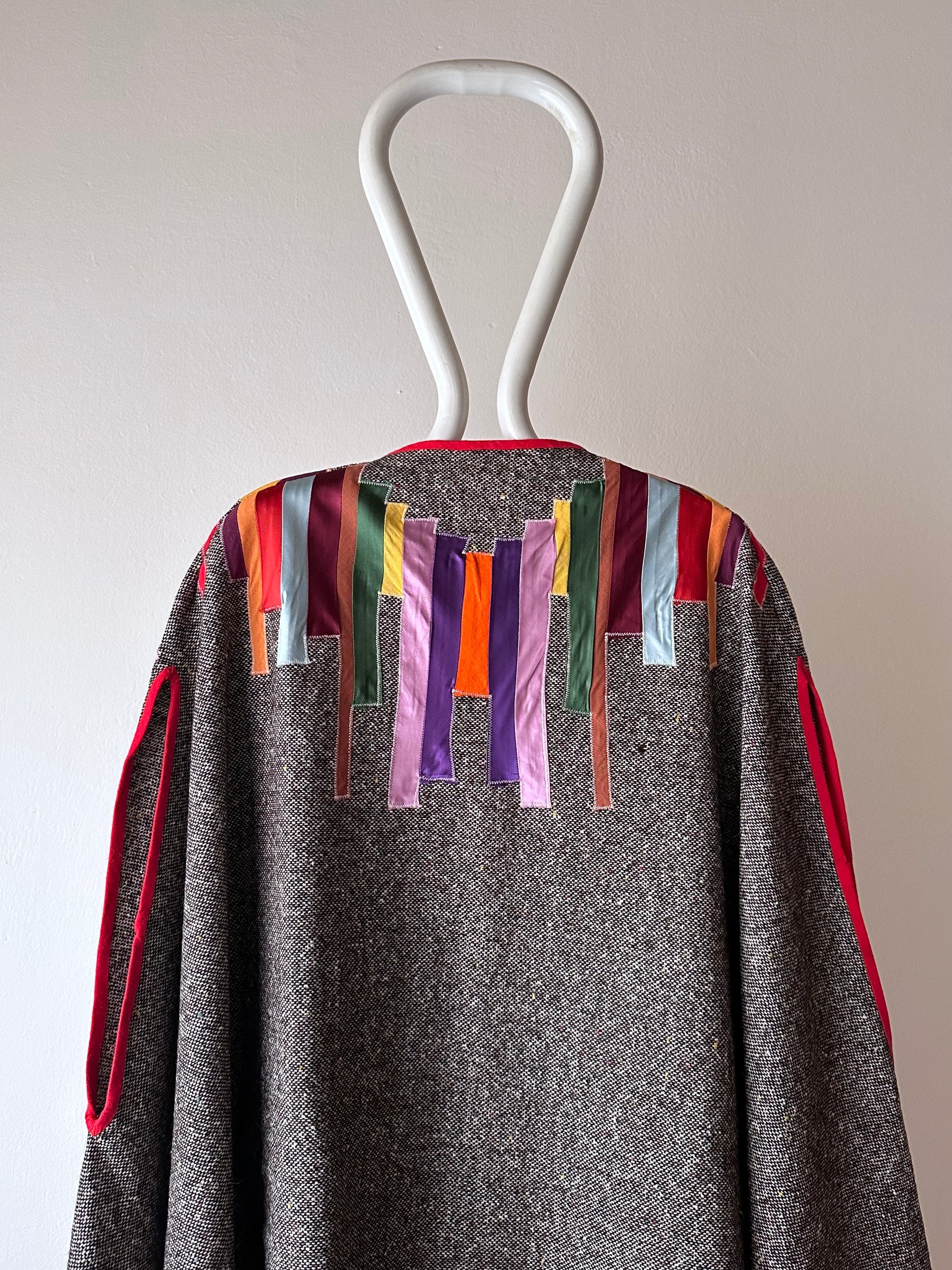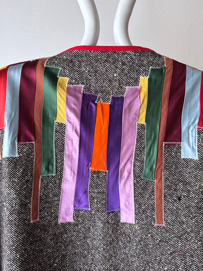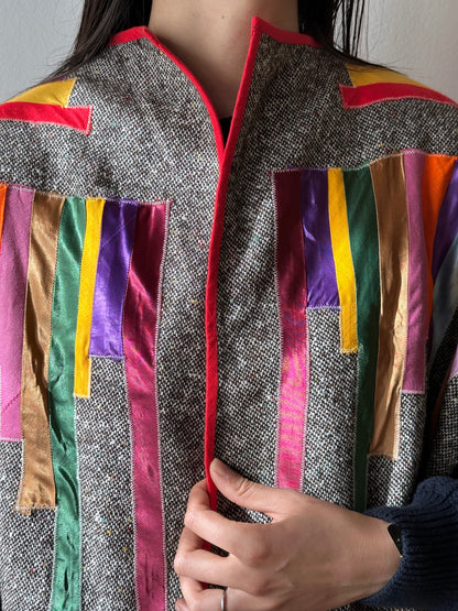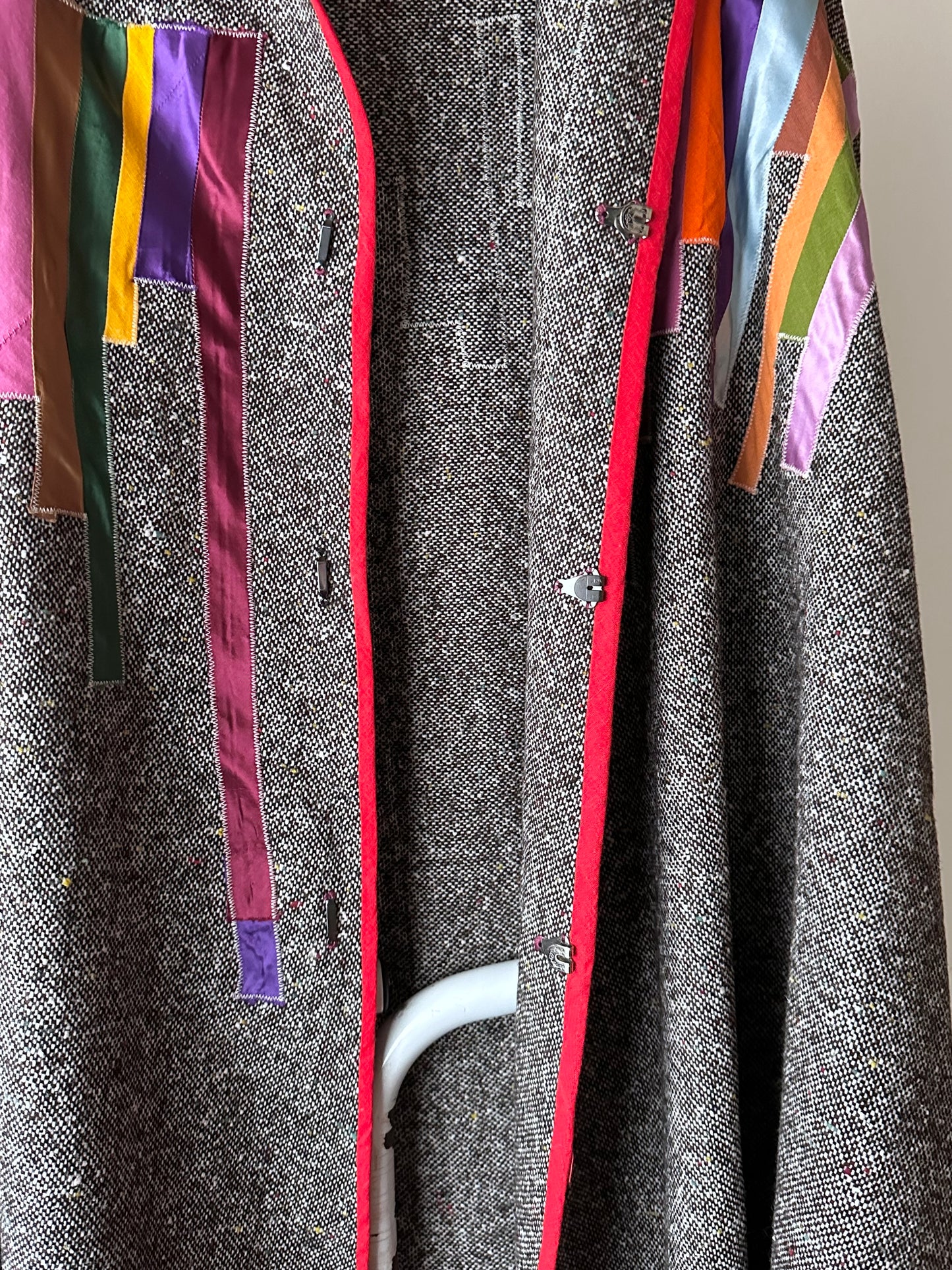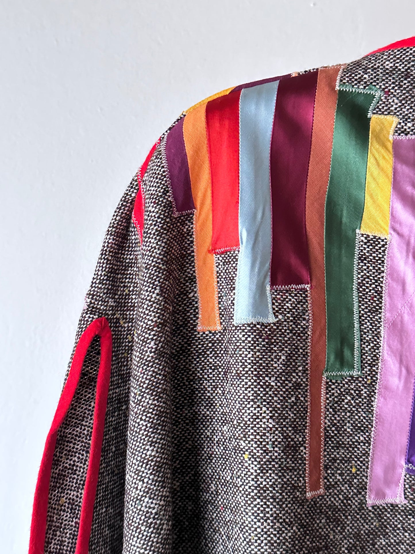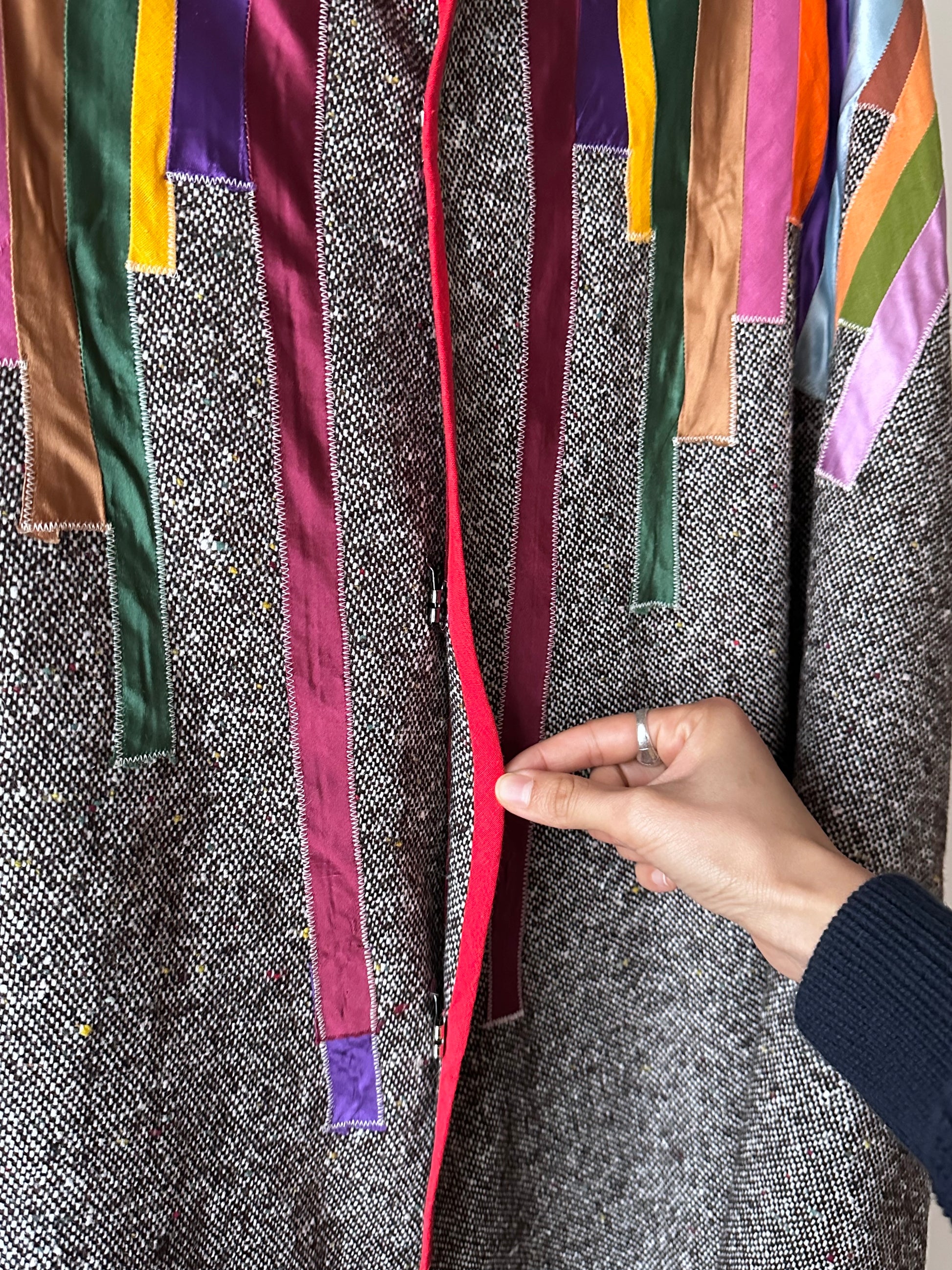 縁に赤いパイピング、胸と背中にレーヨンかビスコース素材のような、サテンぽいカラフルなパレットが配置されています。