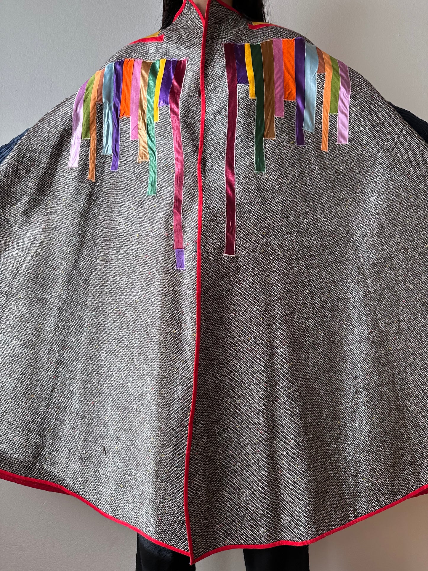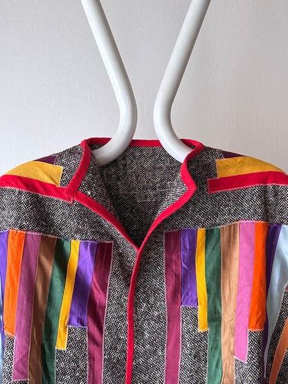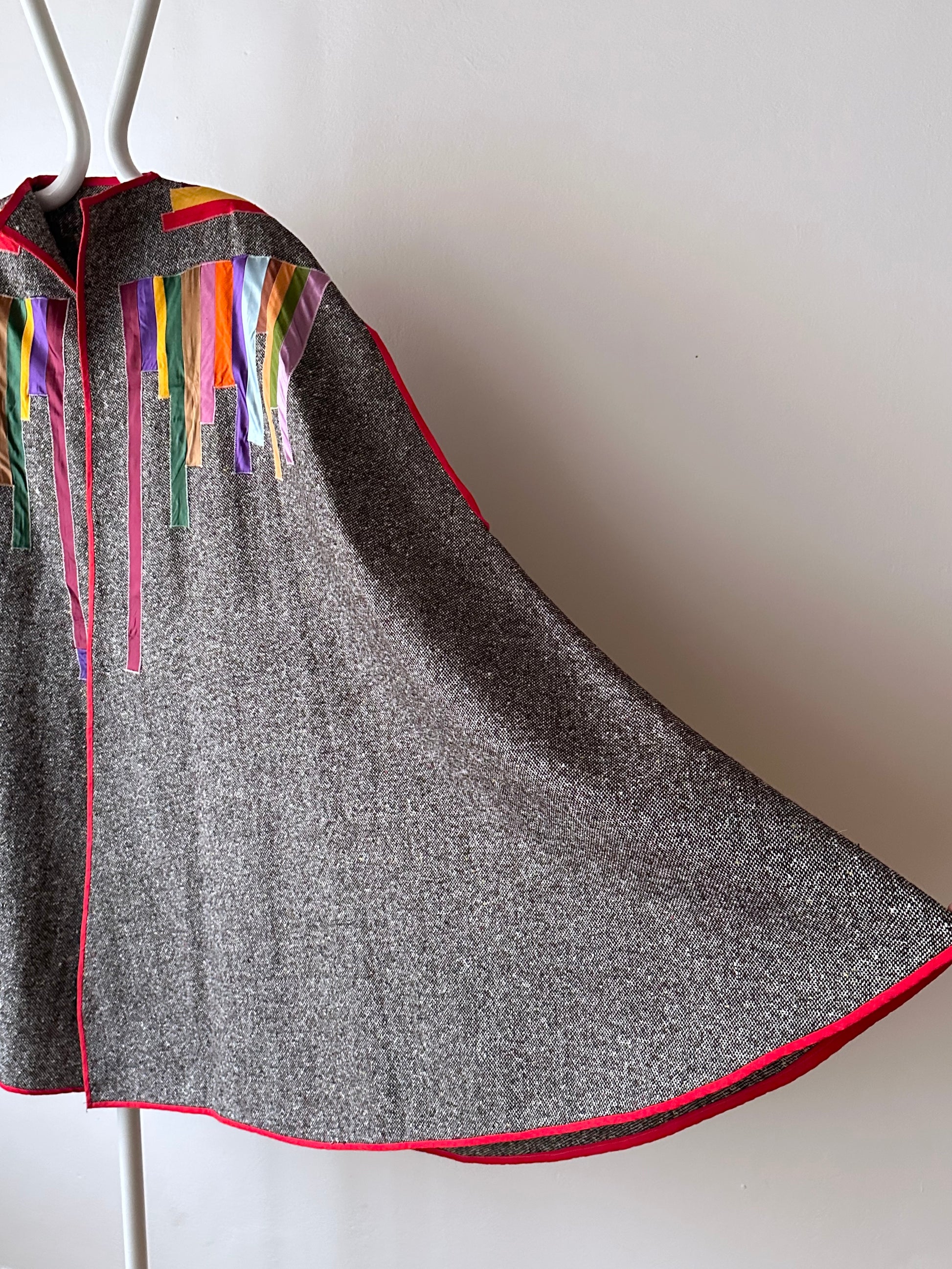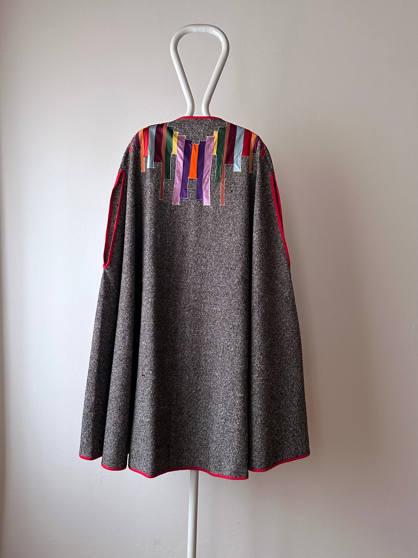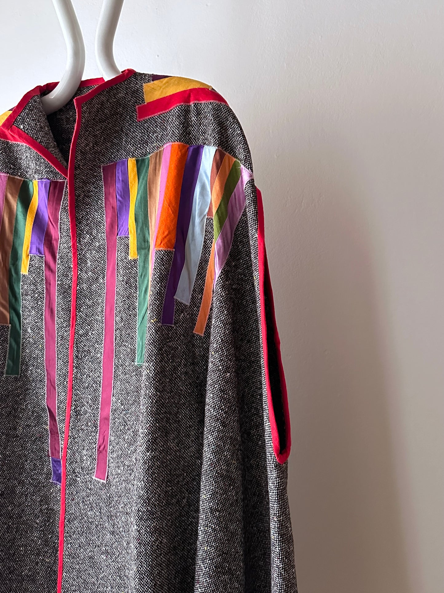 縁に赤いパイピング、胸と背中にレーヨンかビスコース素材のような、サテンぽいカラフルなパレットが配置されています。