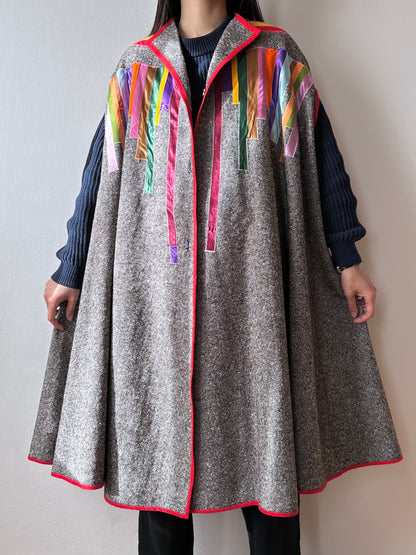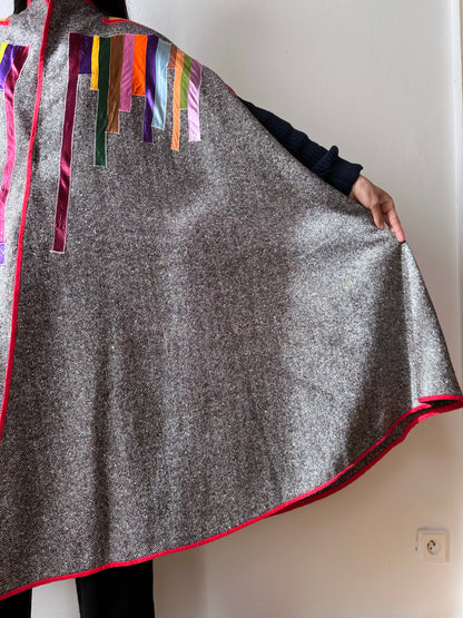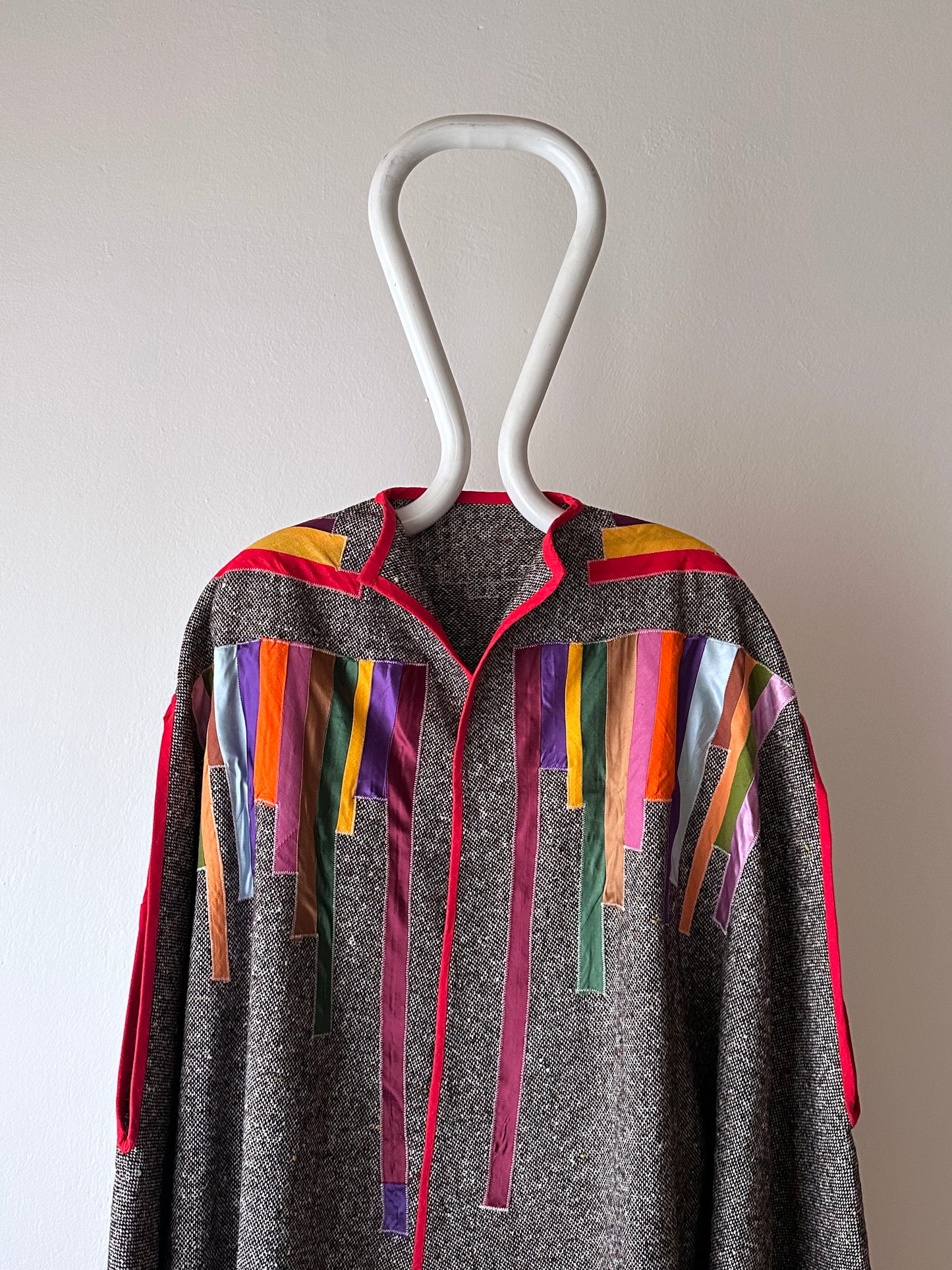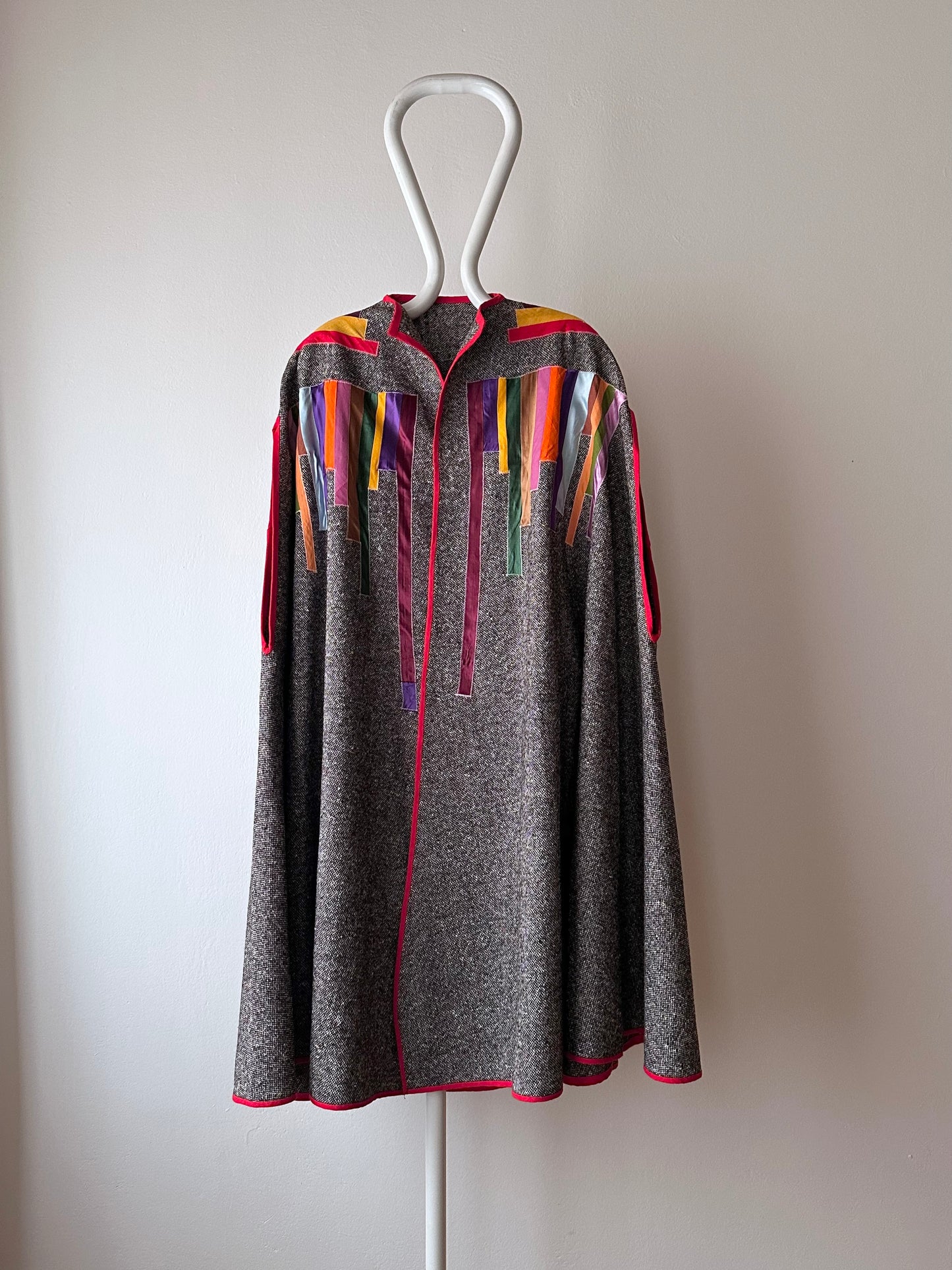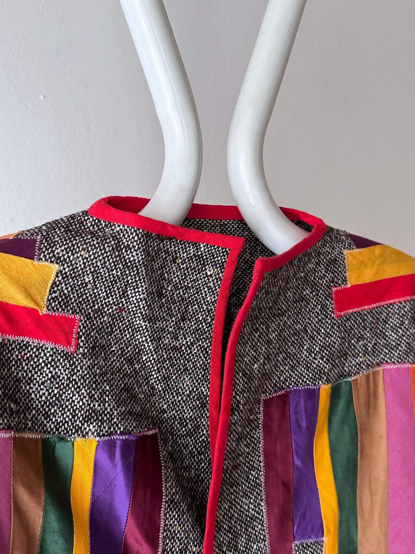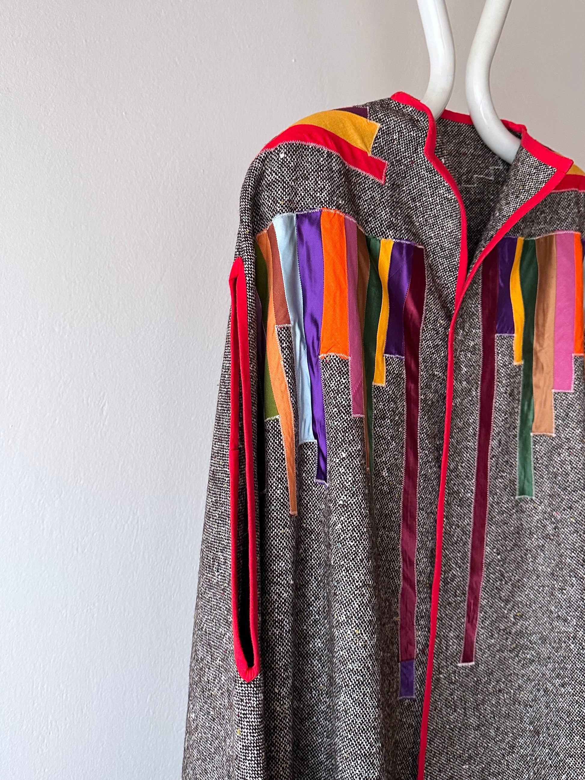 縁に赤いパイピング、胸と背中にレーヨンかビスコース素材のような、サテンぽいカラフルなパレットが配置されています。