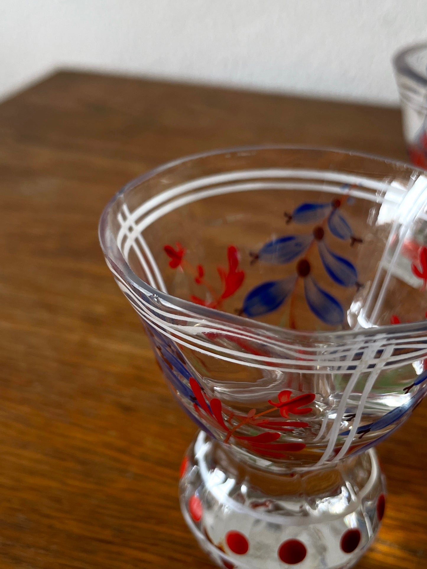 古い絵付けガラスのデキャンターとショットグラス6ピースのセット。
