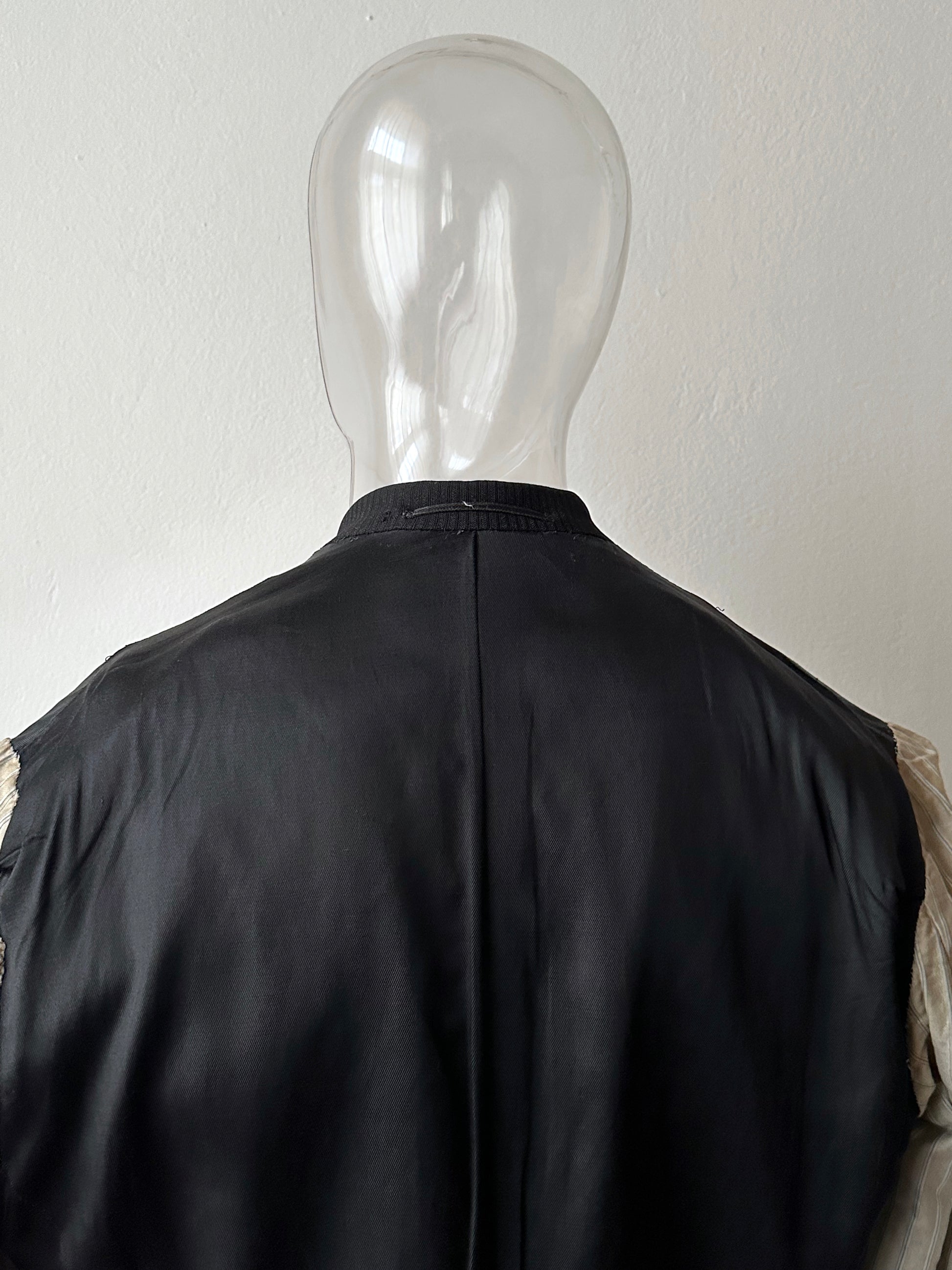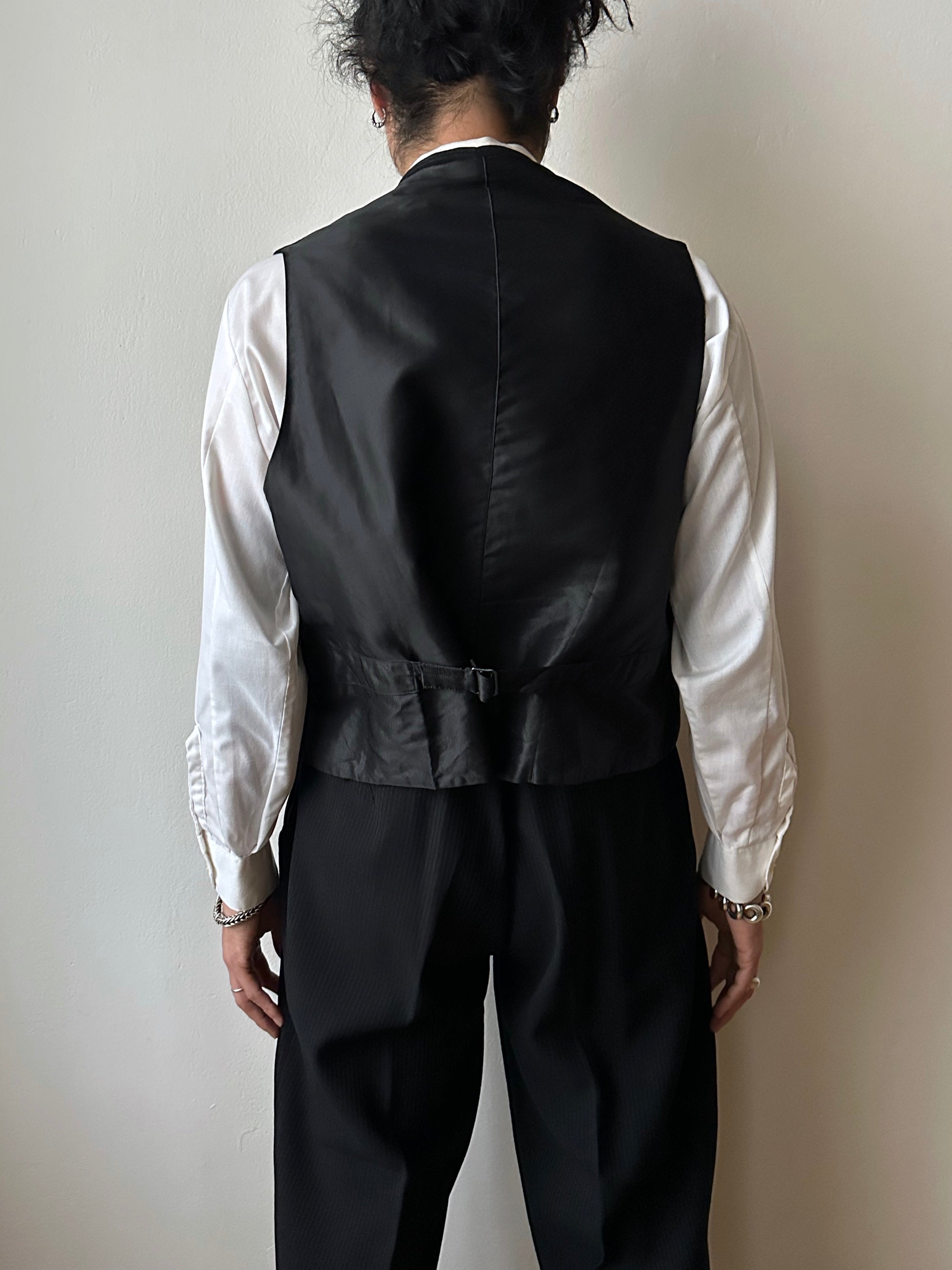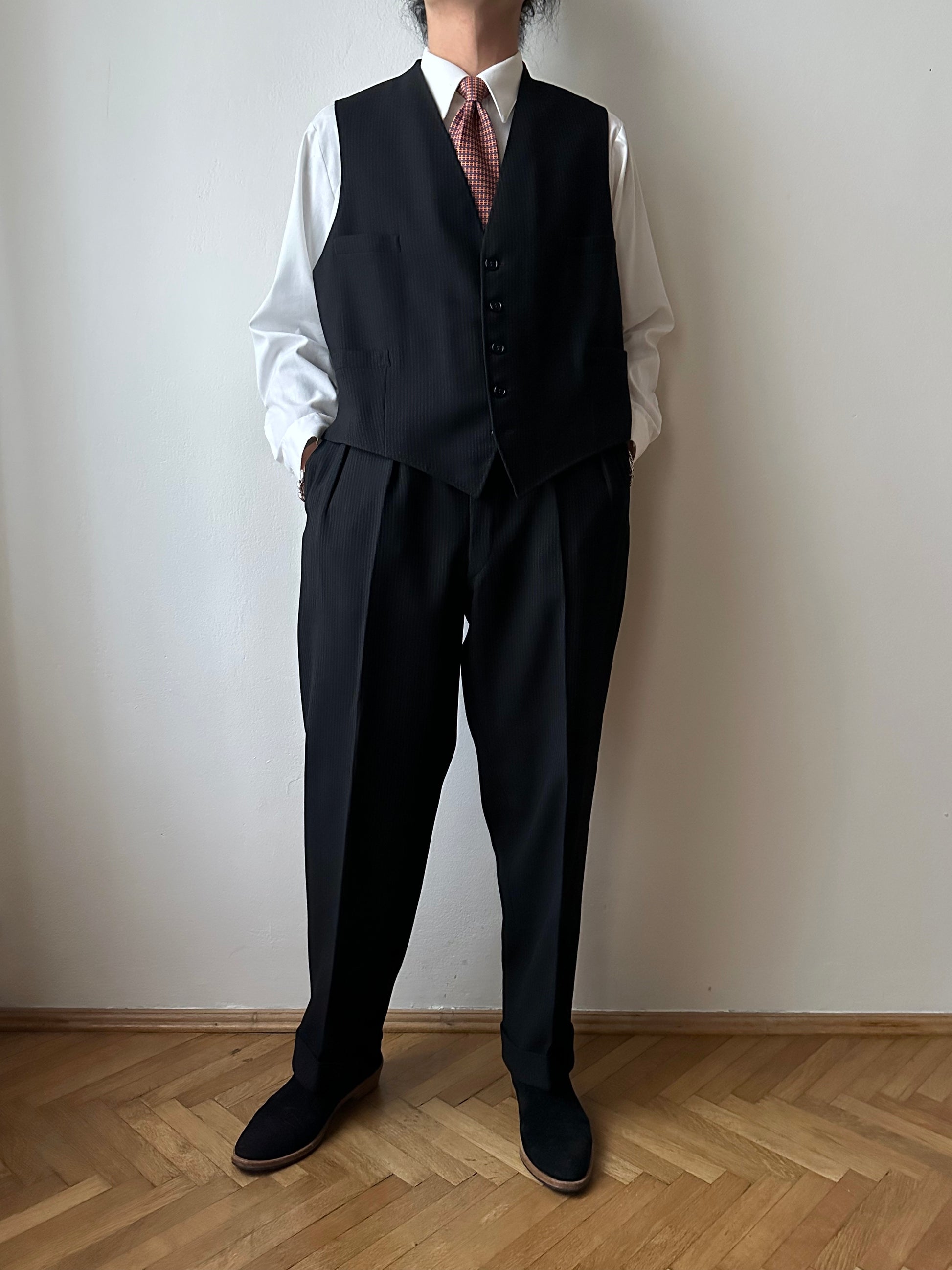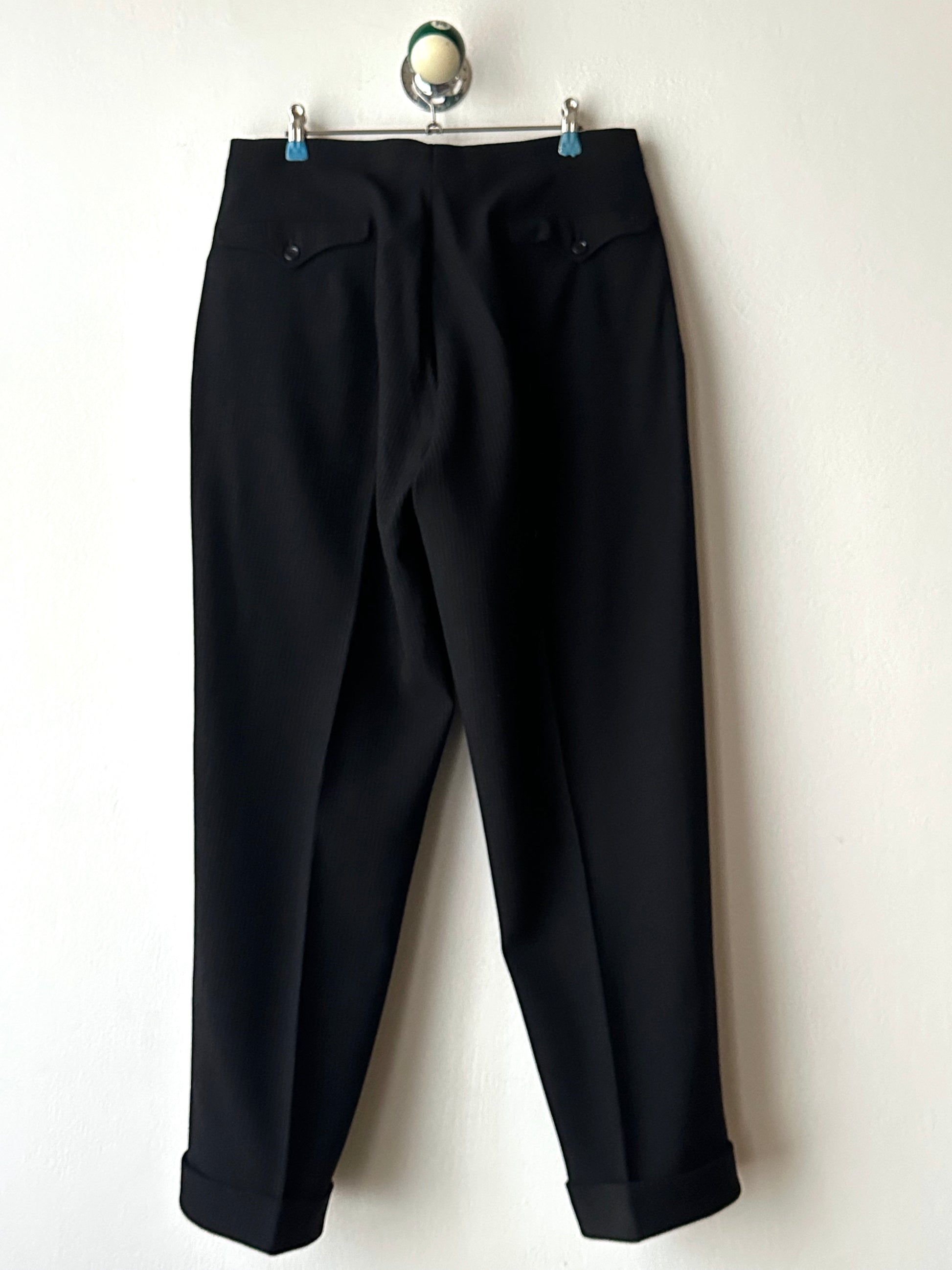 パンツはベルトループがないので、サスペンダーで吊ってください。実際サスペンダーで穿いたほうがシルエットは綺麗ですし、ここはポジティブに考えてもらえたら。